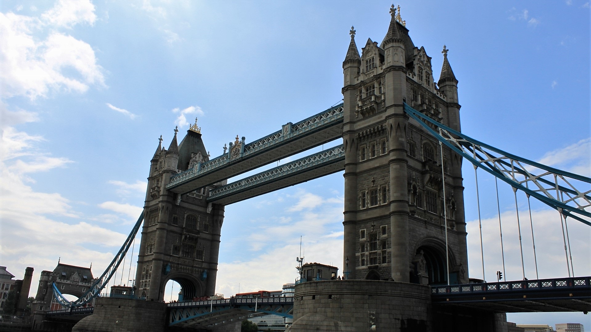 Tower Bridge mit dem Bus, St. Katherine's Pier zum Bootsanleger - Rundfahrt auf der Themse zur Tate Modern, strahlender Sonnenschein. Museum Tate Modern in alter Turbinenhalle. Alles sensationell. Afternoon Tea Standing im Restaurant mit Blick auf Millenium Bridge und St. Paul's Cathedral. Mit Bussen quer durch die Stadt nach Notting Hill, einfaches Häuschen kostet 2 Millionen GBP. Nett im The Old Swan gesessen, Guinness, Mint/Lamb und Fish&Chips.