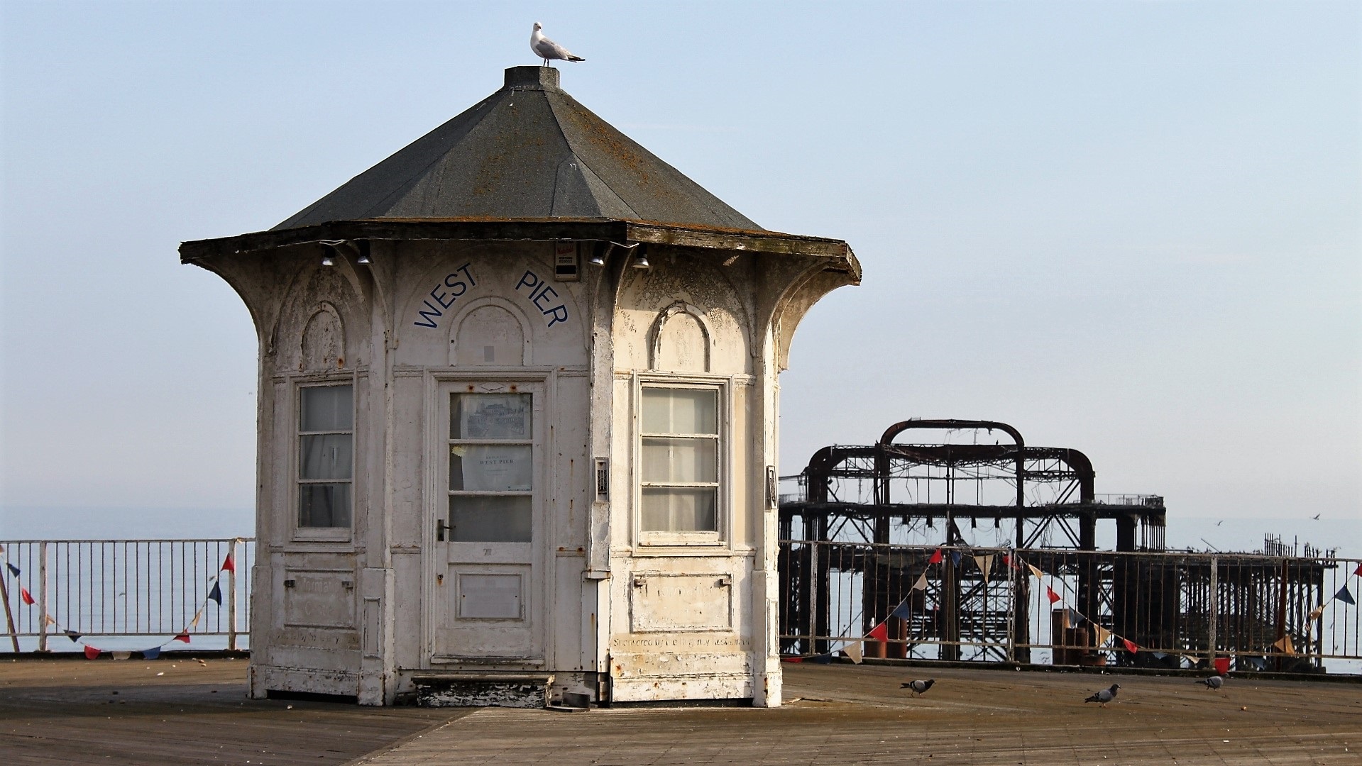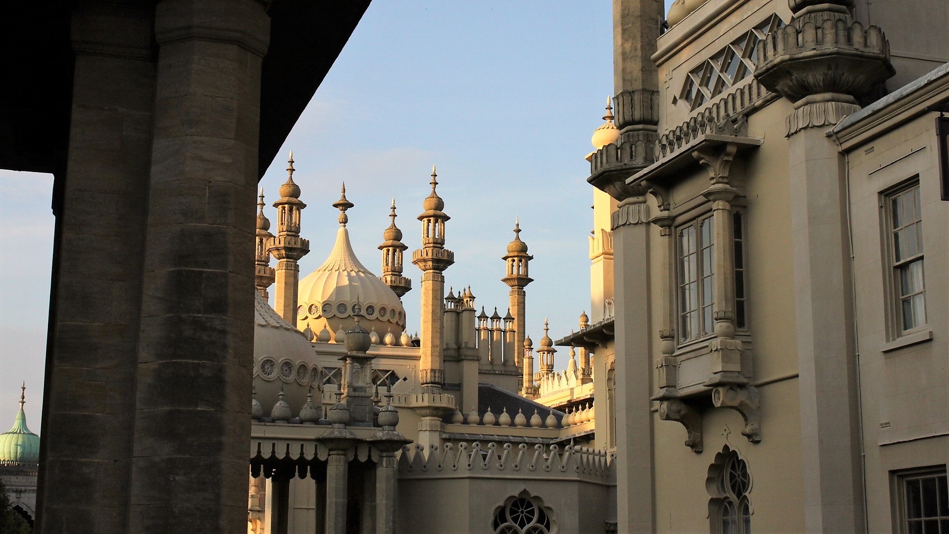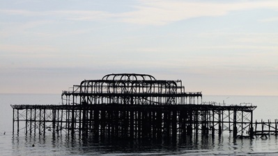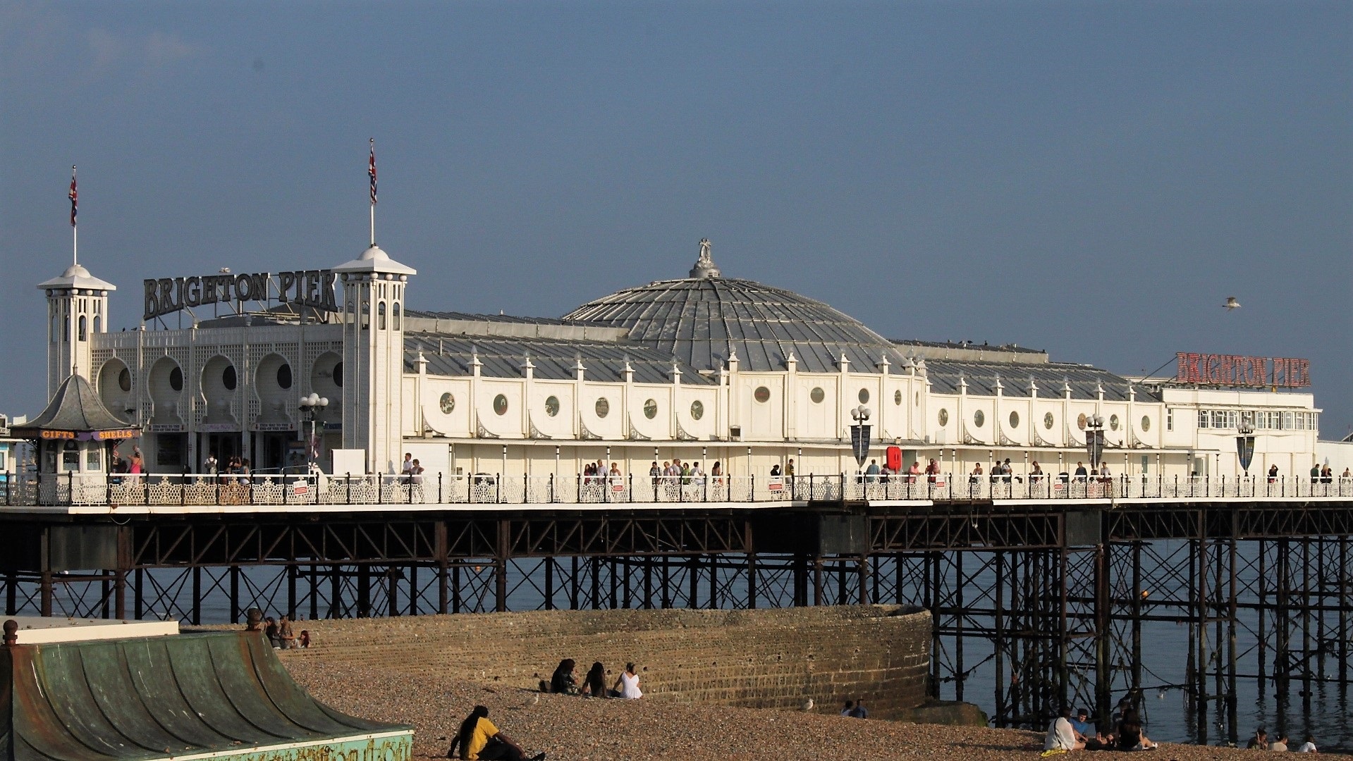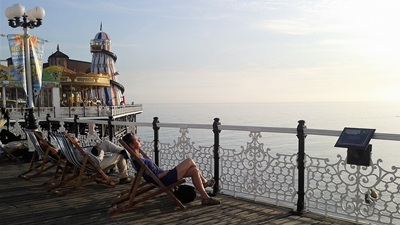 Strandtag. Rasen und Kies in Goring. Abends Brighton: Pier mit Daddelautomaten (2 GBP verspielt!), indisch Essen.