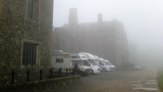 Walmer Castle & Garden: Breiter Kiesstrand, leichter Regen, teilbewohntes Schloss mit Queen Mom's Garden. Dover Castle: Starker Sturm mit Regen, klasse Parkplatz im Schlossgelände mit "Blick" (Nebel) auf Hafen. Mittagessen. Später Besichtigung. Eindrucksvolle Weltkarte im Thronsaal. Zurück zum Camping: Carcassonne, unentschieden.