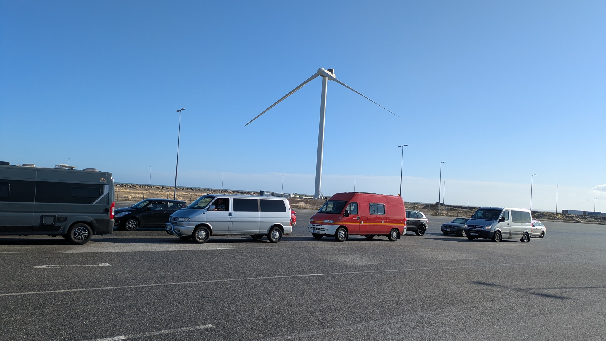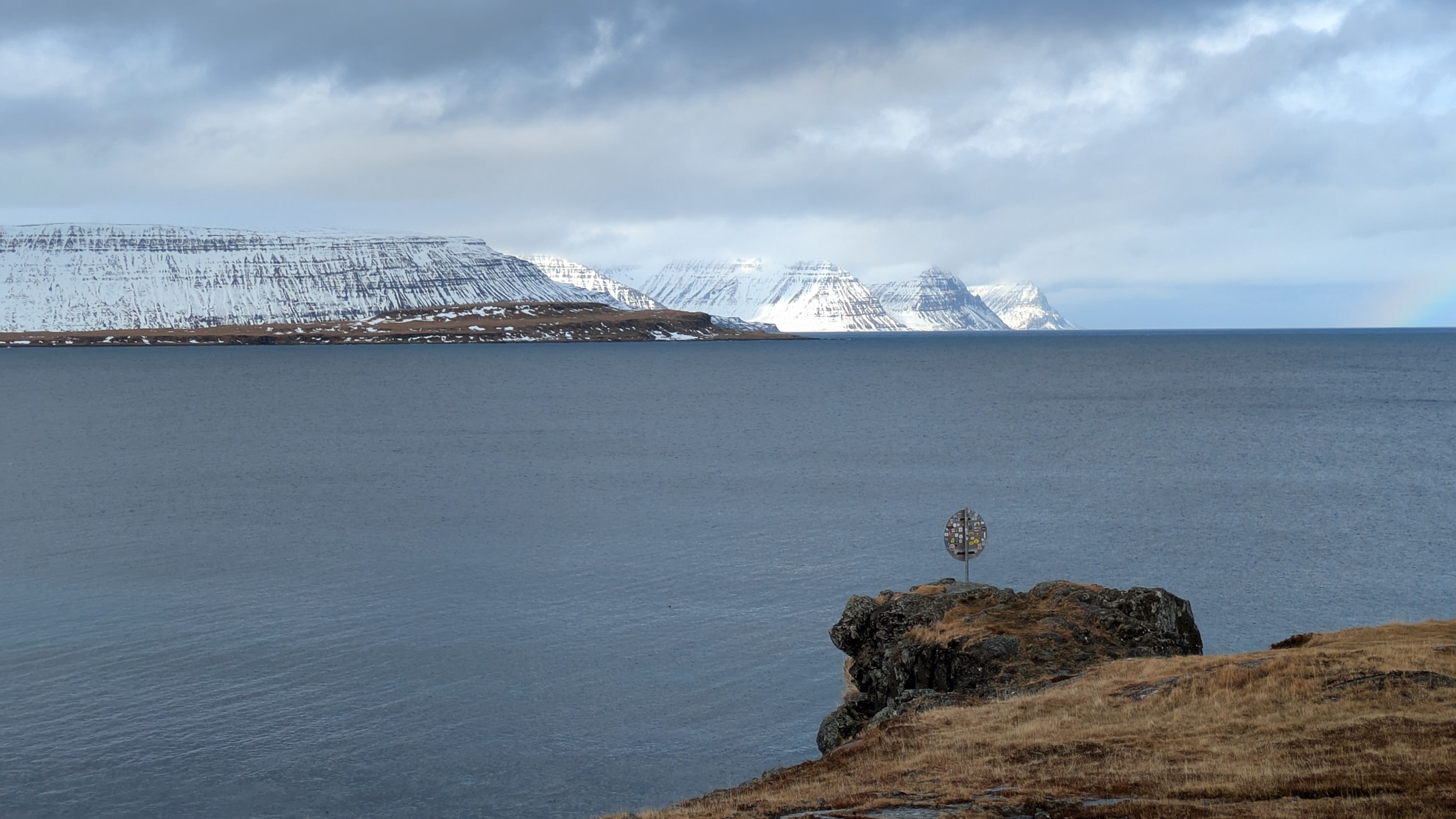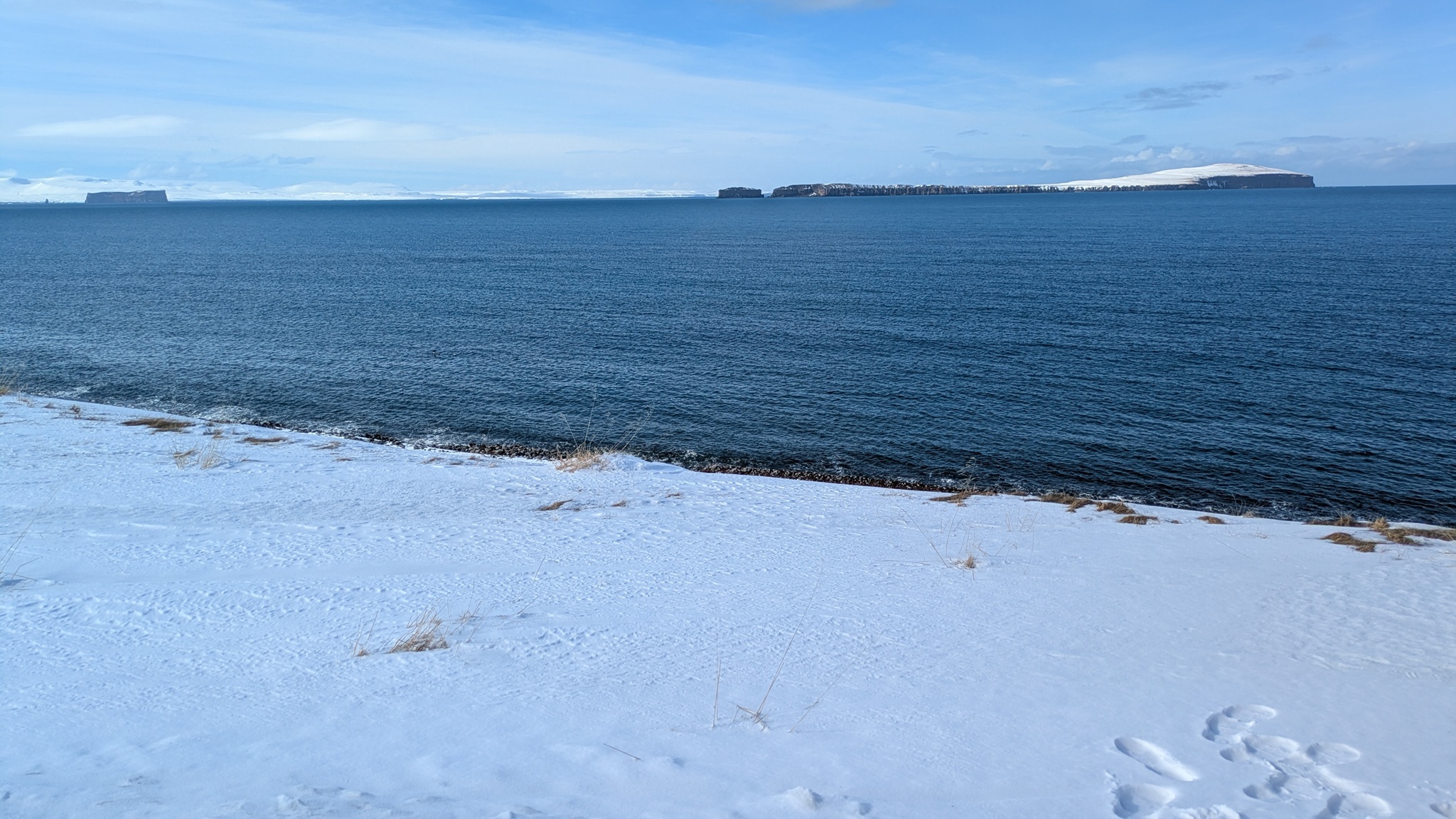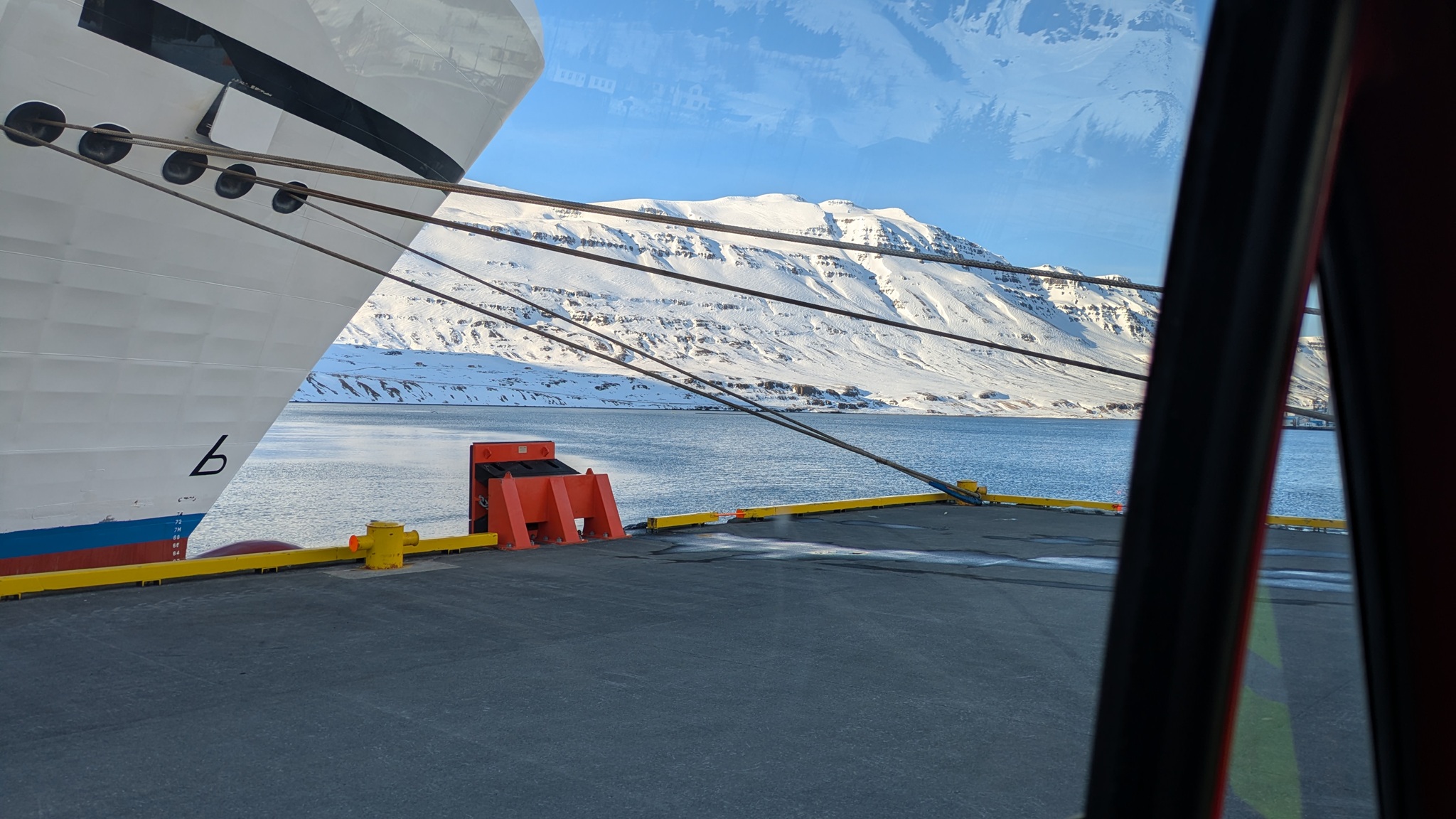 Nachts wieder ordentlich Seegang, tags dann strahend blauer Himmel und irgendwann tauchte dann das schneebedeckte Island auf. Die Norröna war sehr schnell unterwegs, 5 Uhr nachmittags nach Island-Zeit (-2 h ggü. Berlin) waren wir da. Ich bin gleich losgefahren bis Egilsstaðir an der Ringstraße auf den schmucklosen, aber sehr vollen Campingplatz. Jetzt kann ich in Ruhe Pläne für die nächsten Tage machen.