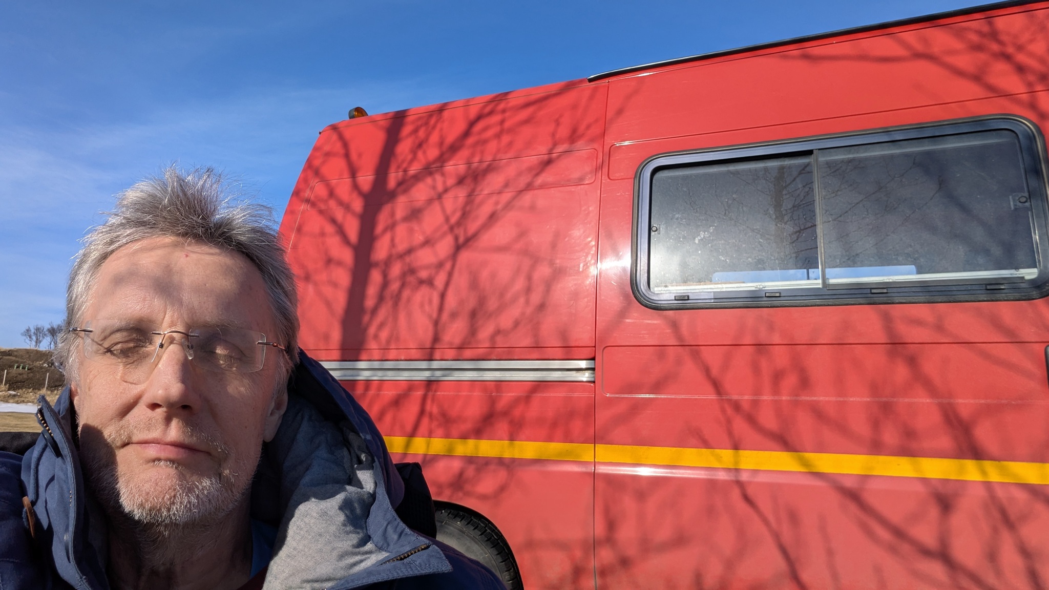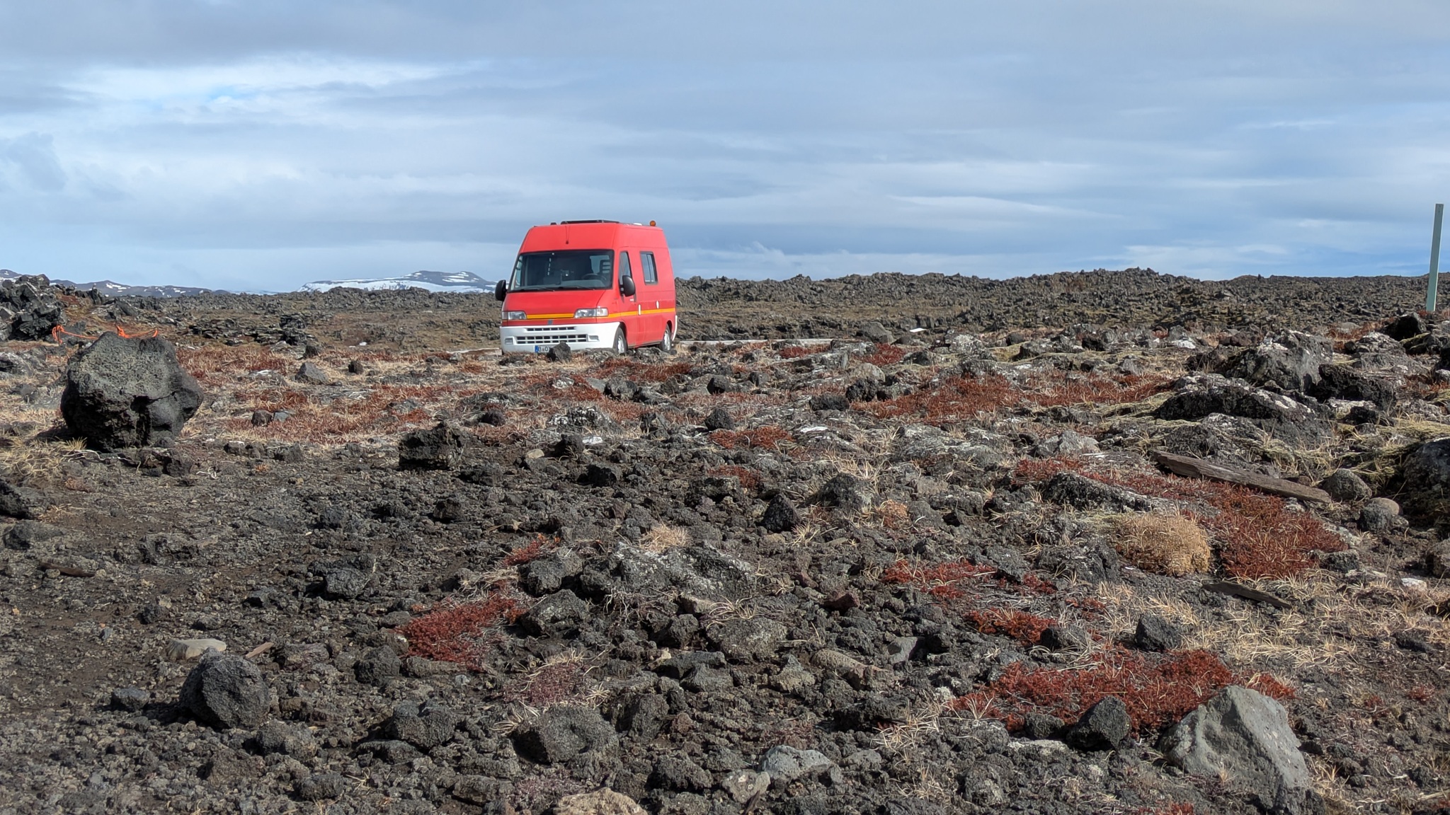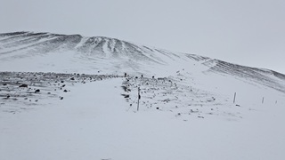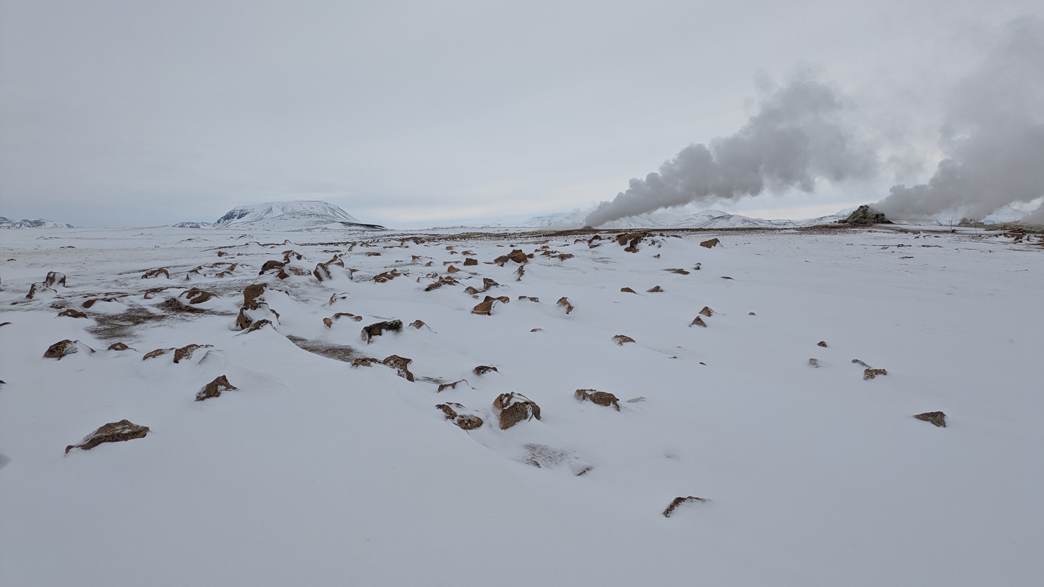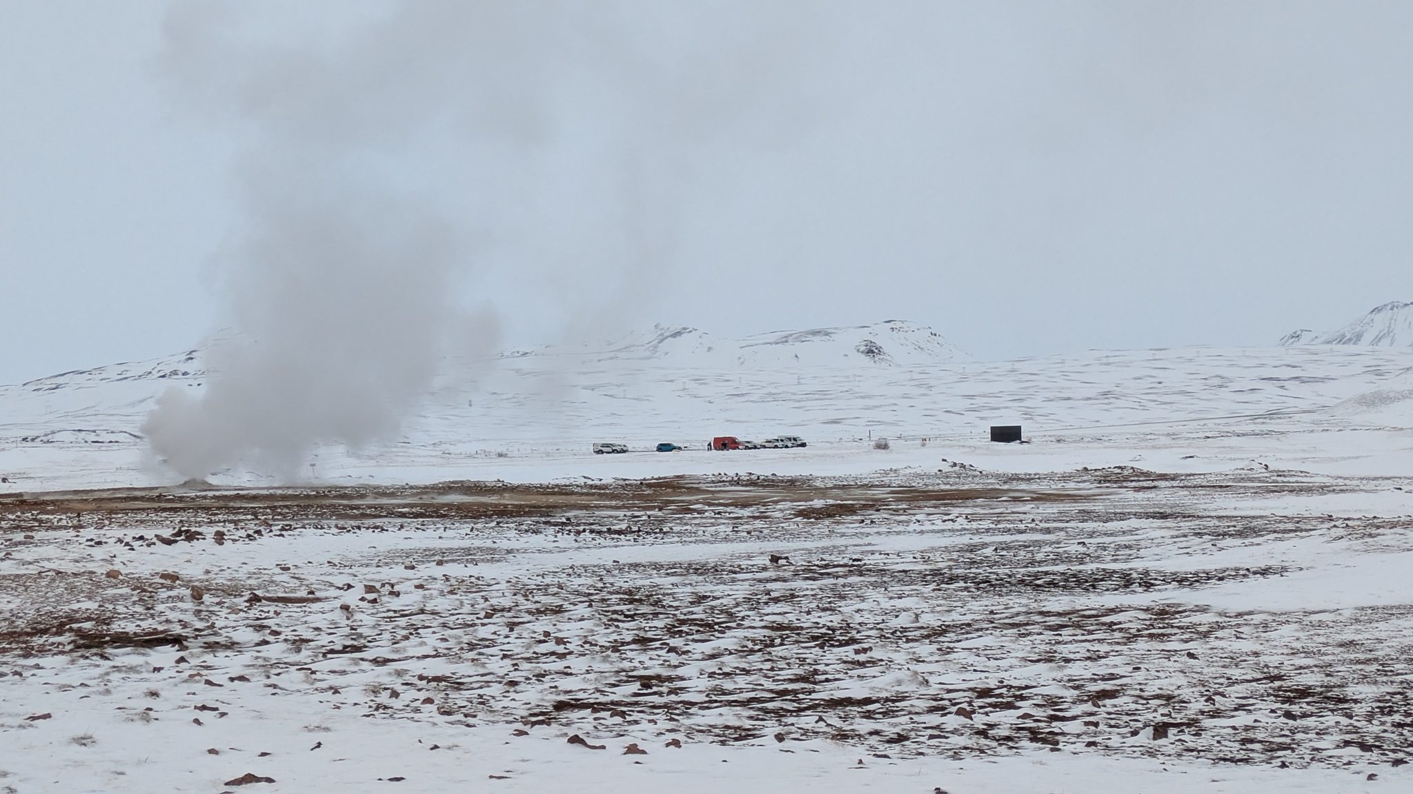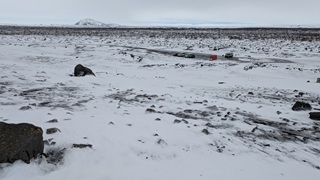 Nach vielem Auf und Ab und etwas aus der Puste erstmal Kaffeepause. Währenddessen zog ein kräftiger Sturm auf, zwar ohne Schneefall, die Sonne schien sogar, aber mit heftigen Schneeverwehungen. Also Planänderung: Auf die Route 85 mit unbekanntem Ziel wollte ich nun doch nicht, sondern Ringstraße bis zum nächsten - lt. Website - geöffneten Campingplatz an einer Stichstraße. Auf der Ringstraße, manch Mietwagenfahrer traute sich nur so 20 bis 30 km/h, die Sicht teils Null, schlich eine Kolonne so vor sich hin. Am Camp angekommen war alles verrammelt, wegen des Wetters doch noch nicht geöffnet! Also zurück zur Route 1 und weiter bis Mývatn. Hier stand ich nun auf dem Campsite, der Wind wackelte am Auto. Es zieht durch die Ritzen des Kastenwagens, aber die neue Heizung hält tapfer dagegen.