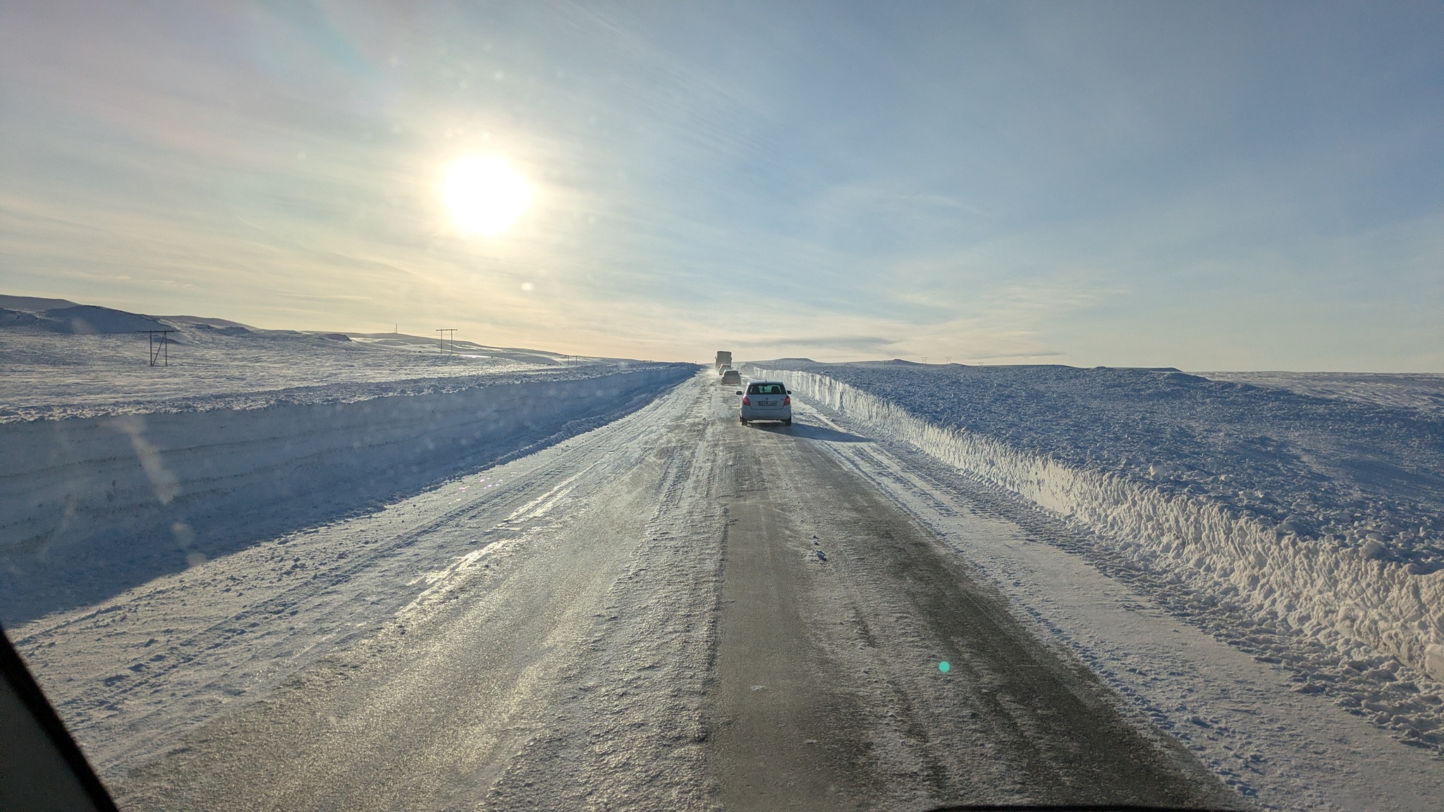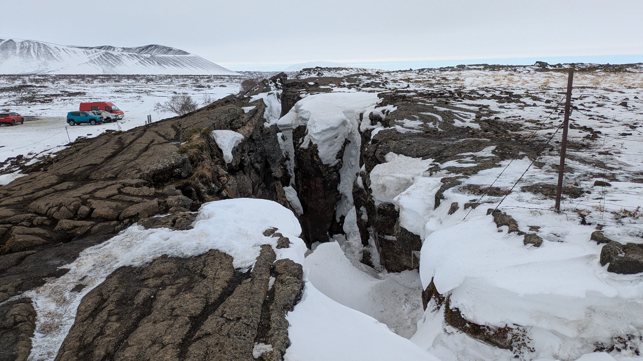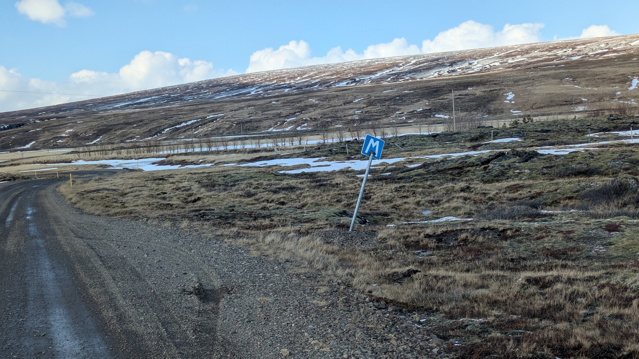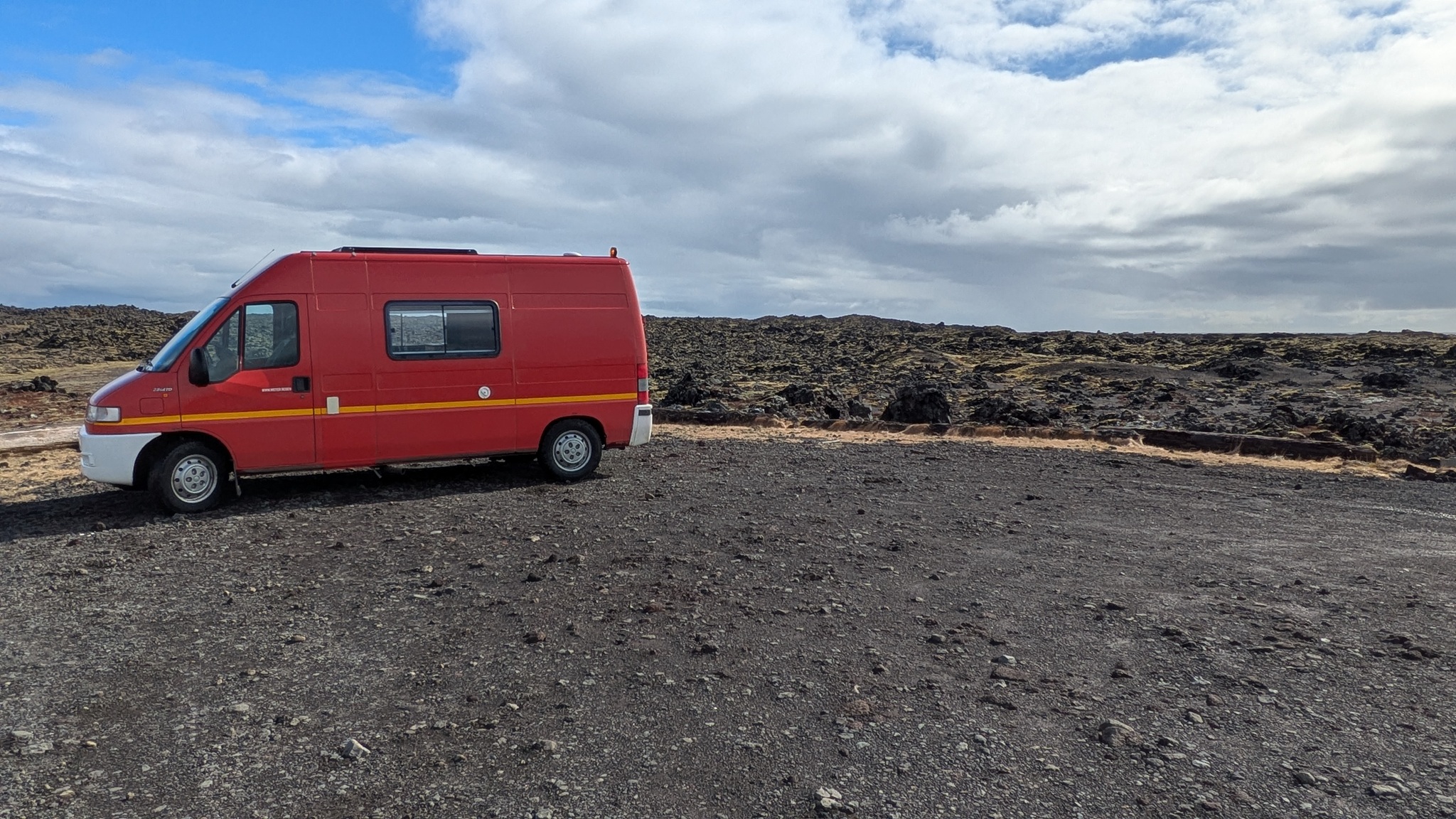 Nach vielem Auf und Ab und etwas aus der Puste erstmal Kaffeepause. Währenddessen zog ein kräftiger Sturm auf, zwar ohne Schneefall, die Sonne schien sogar, aber mit heftigen Schneeverwehungen. Also Planänderung: Auf die Route 85 mit unbekanntem Ziel wollte ich nun doch nicht, sondern Ringstraße bis zum nächsten - lt. Website - geöffneten Campingplatz an einer Stichstraße. Auf der Ringstraße, manch Mietwagenfahrer traute sich nur so 20 bis 30 km/h, die Sicht teils Null, schlich eine Kolonne so vor sich hin. Am Camp angekommen war alles verrammelt, wegen des Wetters doch noch nicht geöffnet! Also zurück zur Route 1 und weiter bis Mývatn. Hier stand ich nun auf dem Campsite, der Wind wackelte am Auto. Es zieht durch die Ritzen des Kastenwagens, aber die neue Heizung hält tapfer dagegen.
