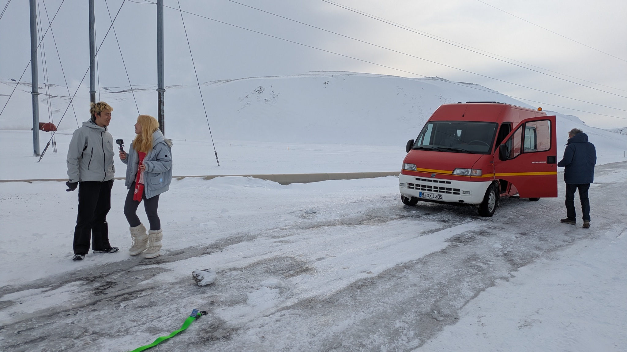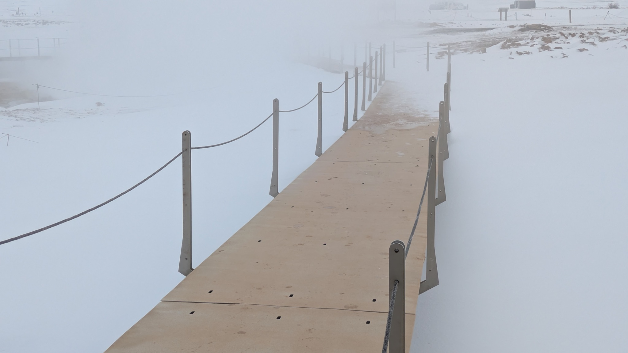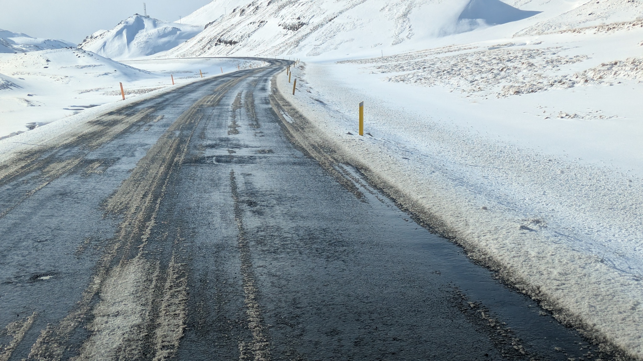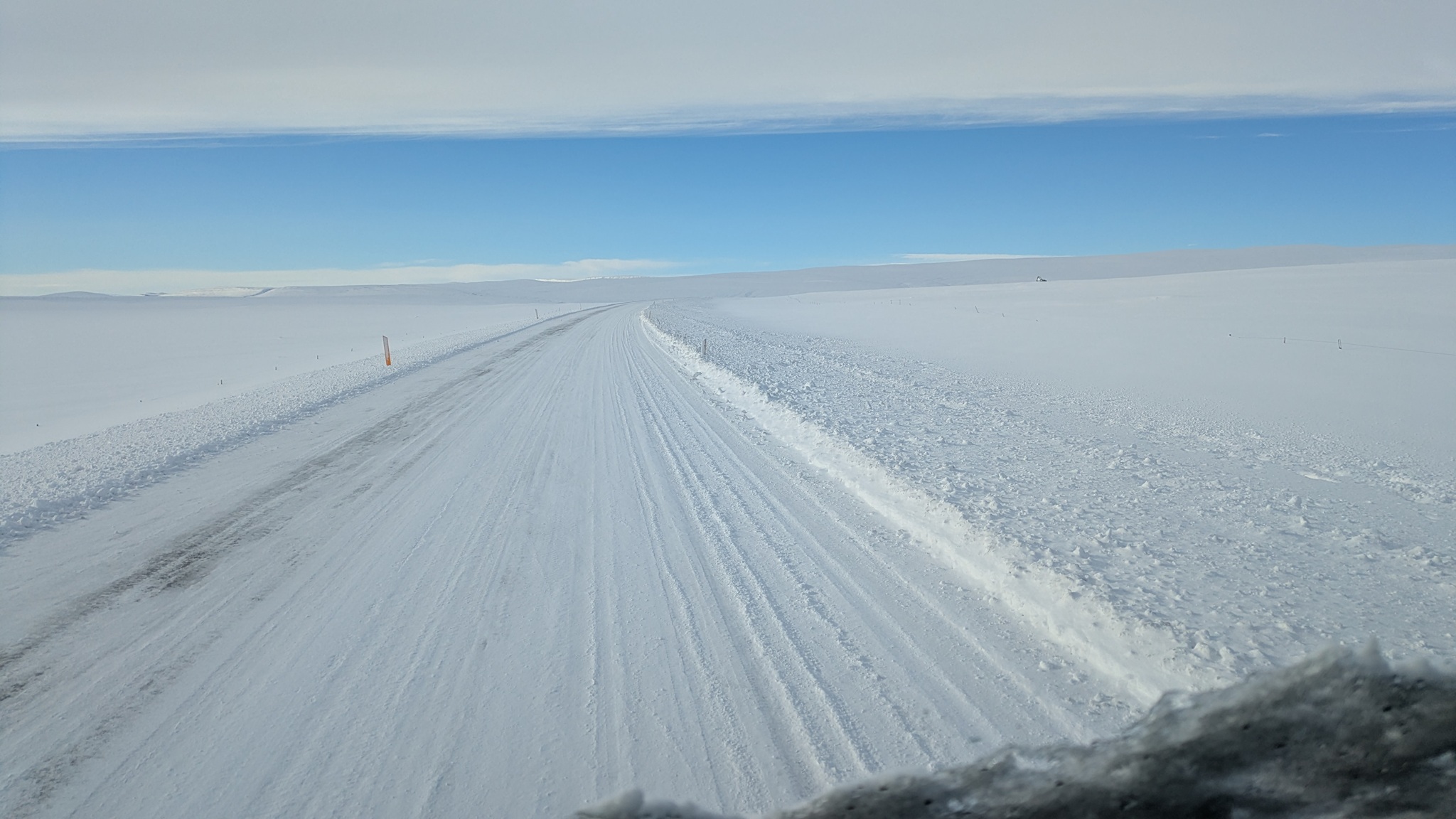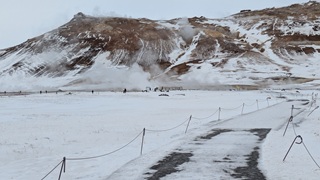 Nach vielem Auf und Ab und etwas aus der Puste erstmal Kaffeepause. Währenddessen zog ein kräftiger Sturm auf, zwar ohne Schneefall, die Sonne schien sogar, aber mit heftigen Schneeverwehungen. Also Planänderung: Auf die Route 85 mit unbekanntem Ziel wollte ich nun doch nicht, sondern Ringstraße bis zum nächsten - lt. Website - geöffneten Campingplatz an einer Stichstraße. Auf der Ringstraße, manch Mietwagenfahrer traute sich nur so 20 bis 30 km/h, die Sicht teils Null, schlich eine Kolonne so vor sich hin. Am Camp angekommen war alles verrammelt, wegen des Wetters doch noch nicht geöffnet! Also zurück zur Route 1 und weiter bis Mývatn. Hier stand ich nun auf dem Campsite, der Wind wackelte am Auto. Es zieht durch die Ritzen des Kastenwagens, aber die neue Heizung hält tapfer dagegen.