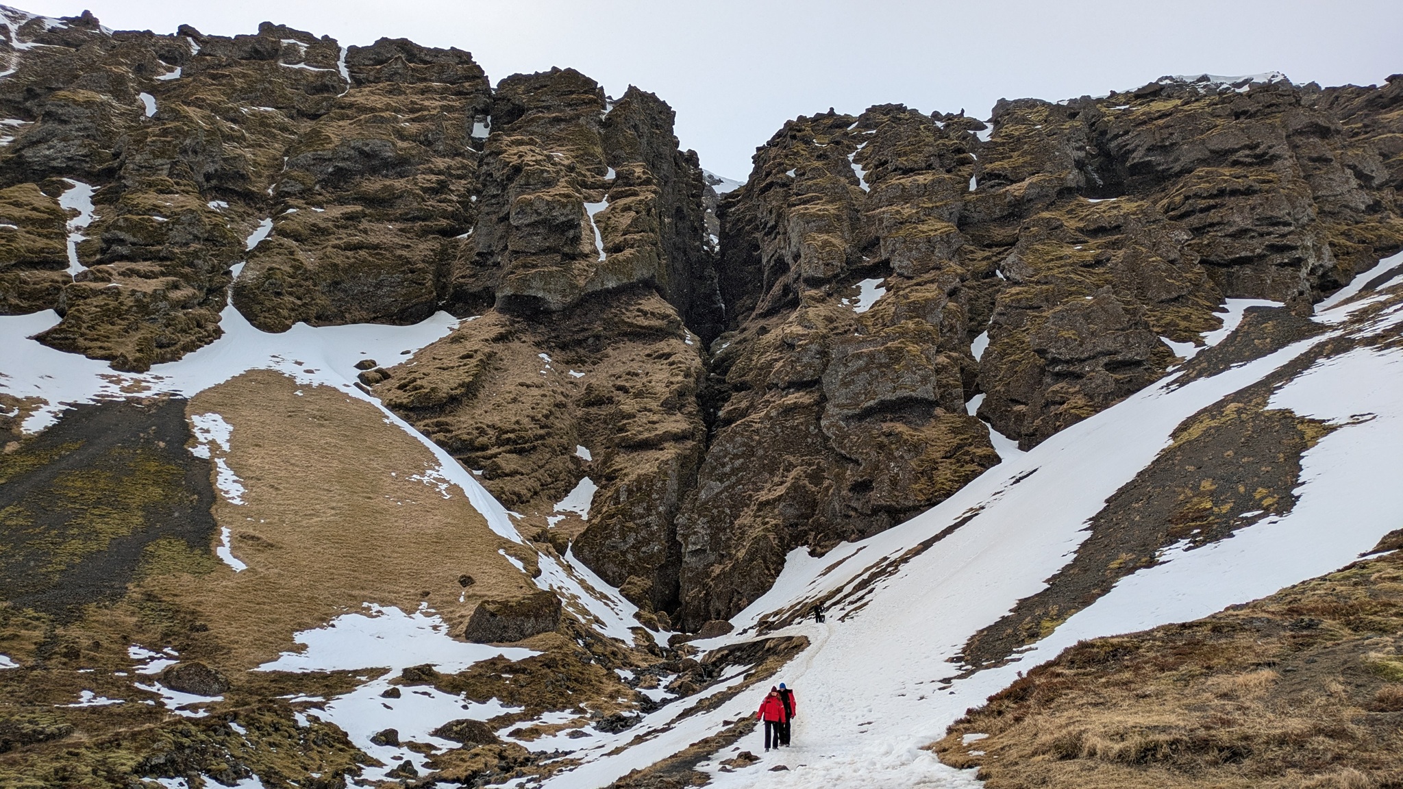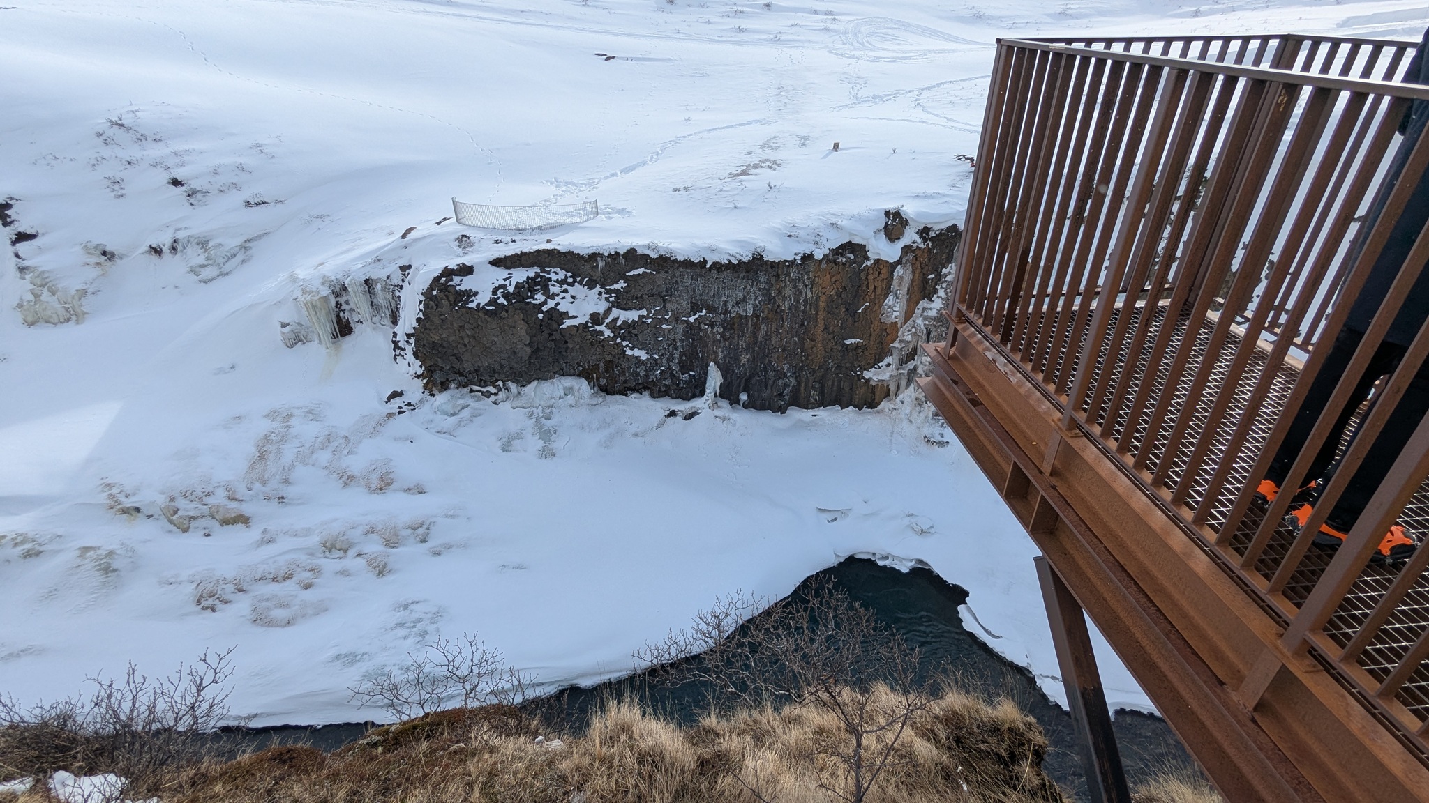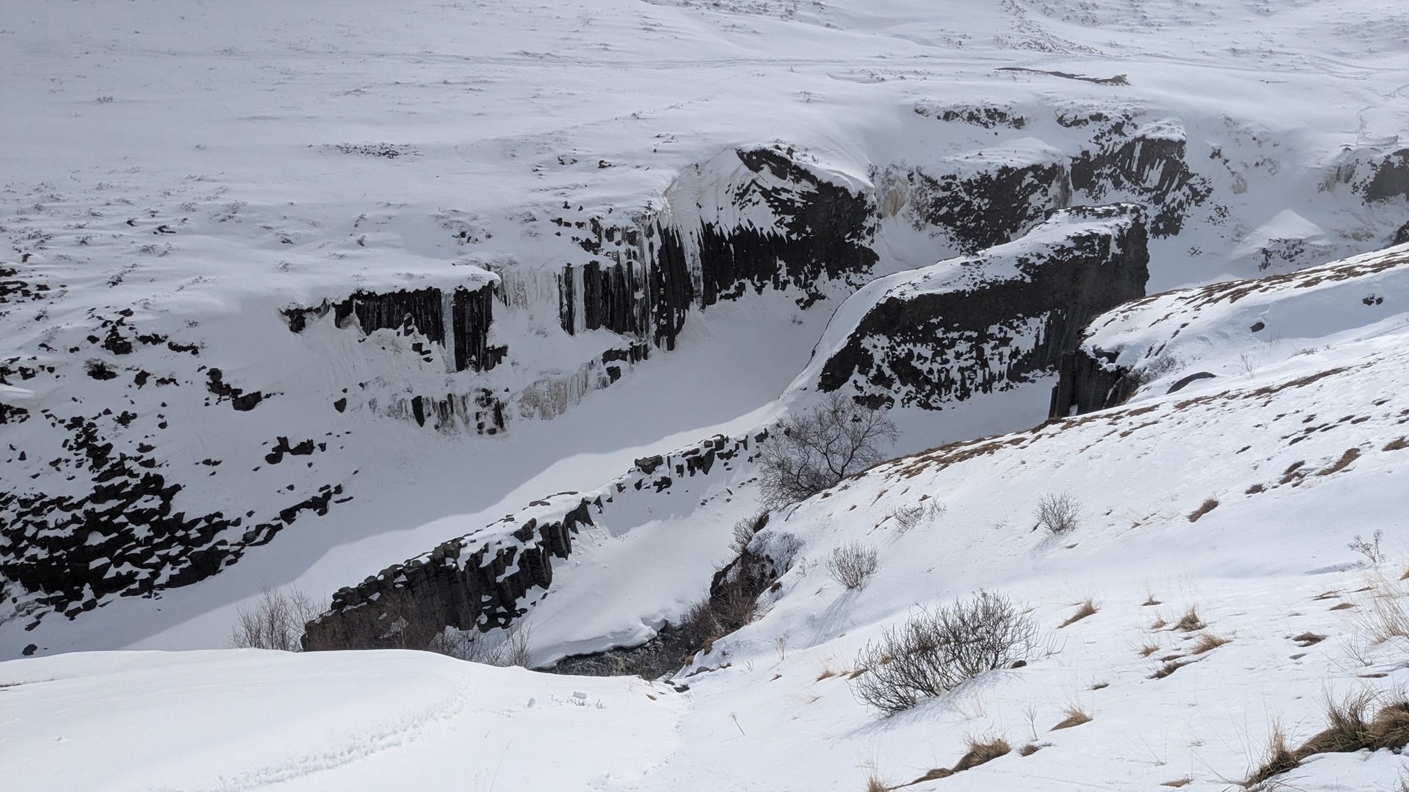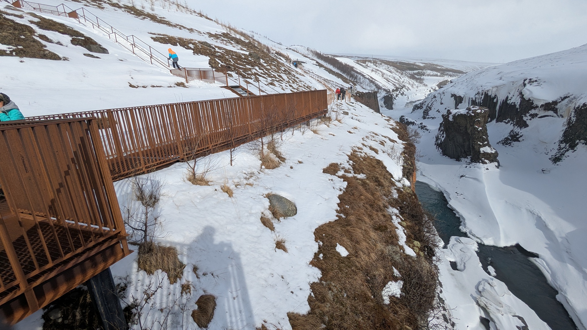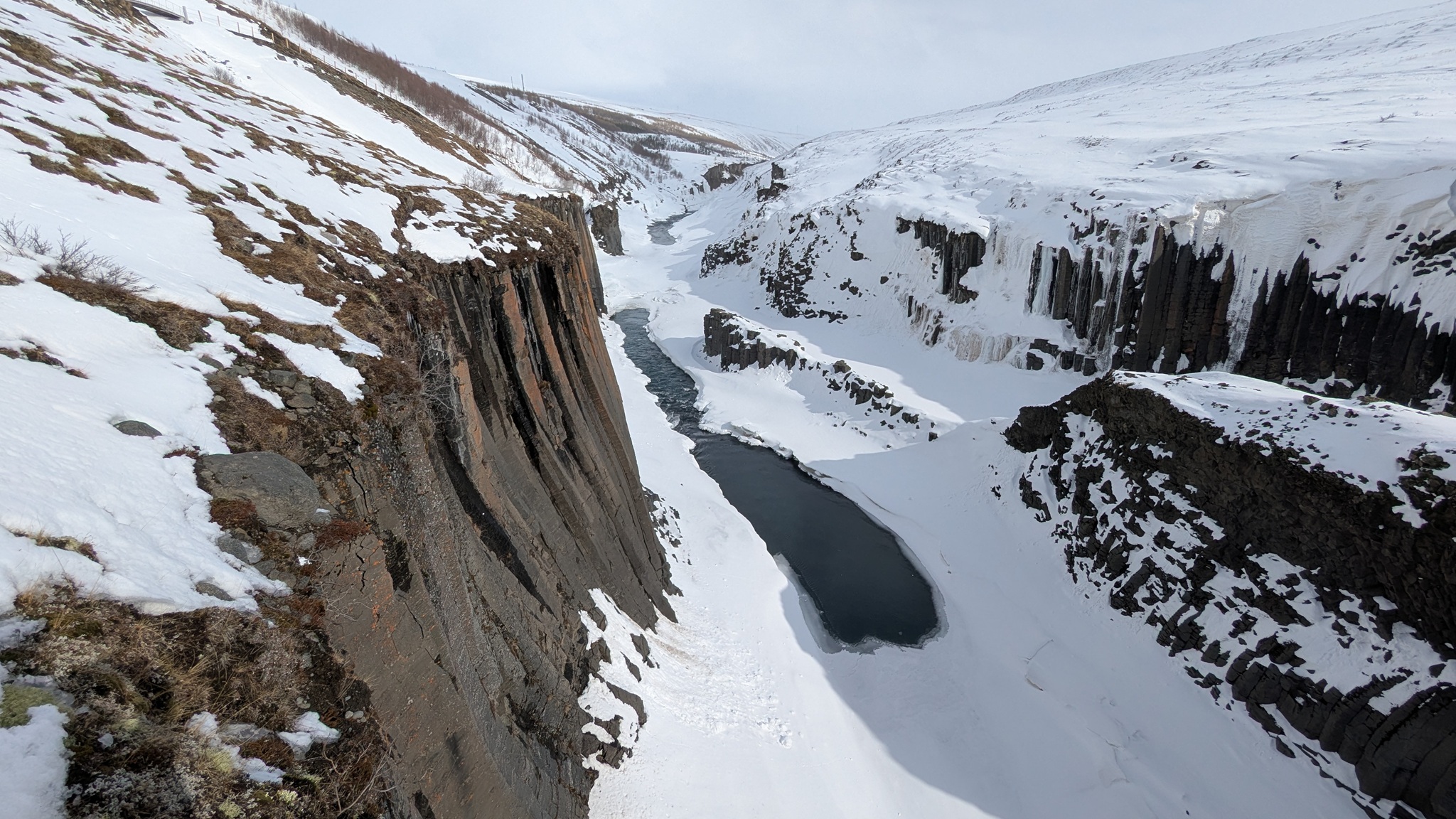 Und das ist der Plan: Erst Einkaufen und Tanken, weiter ein Stück Ringstraße 1, dann nach Norden auf die Route 85 Richtung Vopnaförður und mal weitersehen. Vorher aber noch den Abstecher zum Stuðlagil Canyon. Dort angekommen lief ich dann mal so los zu den angelegten Wegen und Treppen, die einen phantastischen Ausblick in den Canyon bieten. Aber Stopp: Teilweise total vereist! So kehrte ich um, zog meine Spikes über und konnte trittsicher die schönen Aussichtspunkte erreichen! Oh, wie schön, dass ich die Spikes geschenkt bekommen habe!!!!
