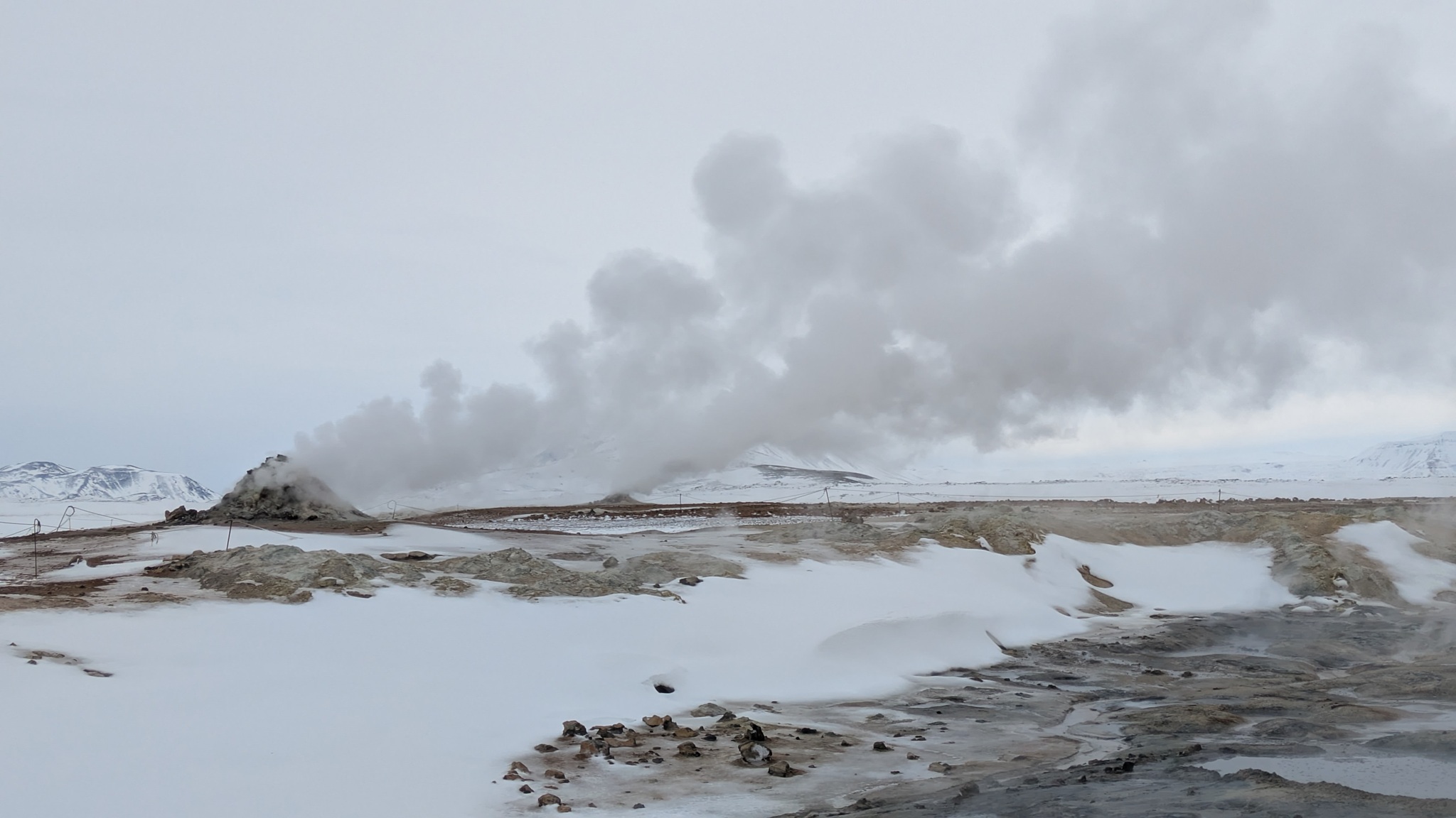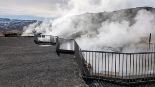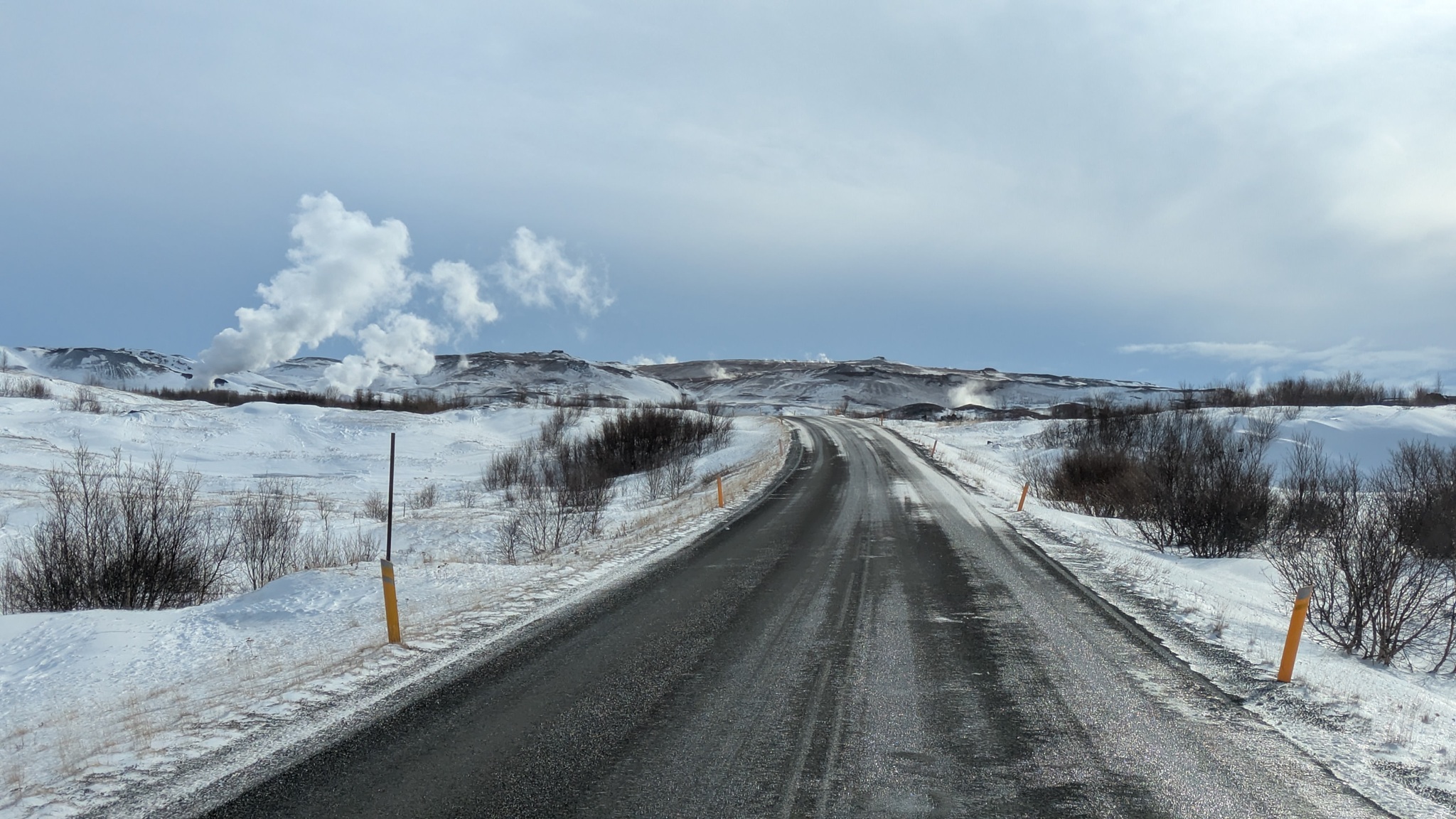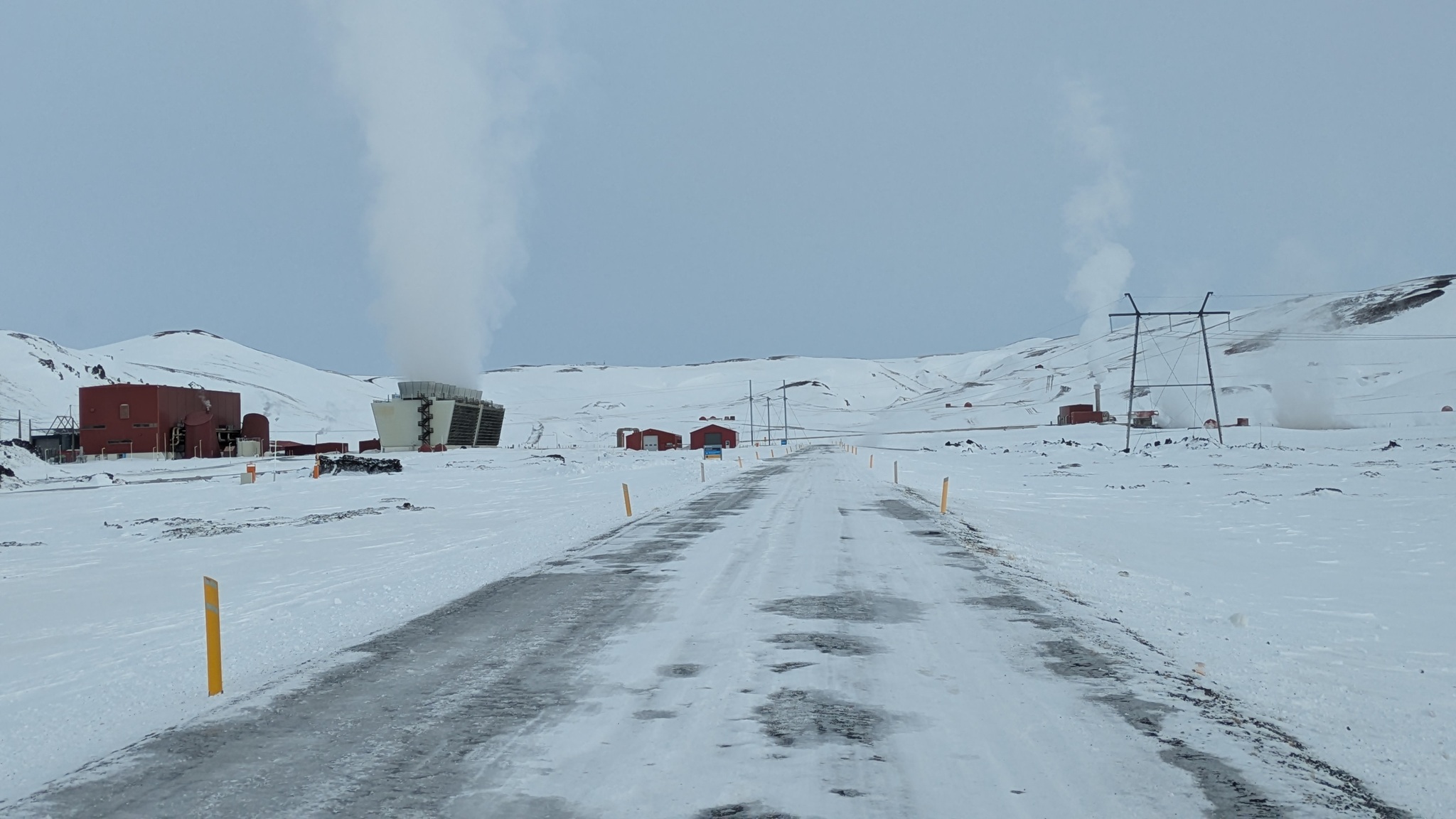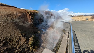 Rund um den Mývatn gibt es reichlich viel zu sehen, aber nicht alles ist heute erreichbar. Das Wetter am Vormittag gut, also los: Erster Stopp an der Dusche am Straßenrand, quasi das Wahrzeichen des Geothermiekraftwerks. Bei Frost läuft sie aber nicht und da hätte ich dann auch keine Lust zum Duschen gehabt. Aber das Foto ist gemacht.