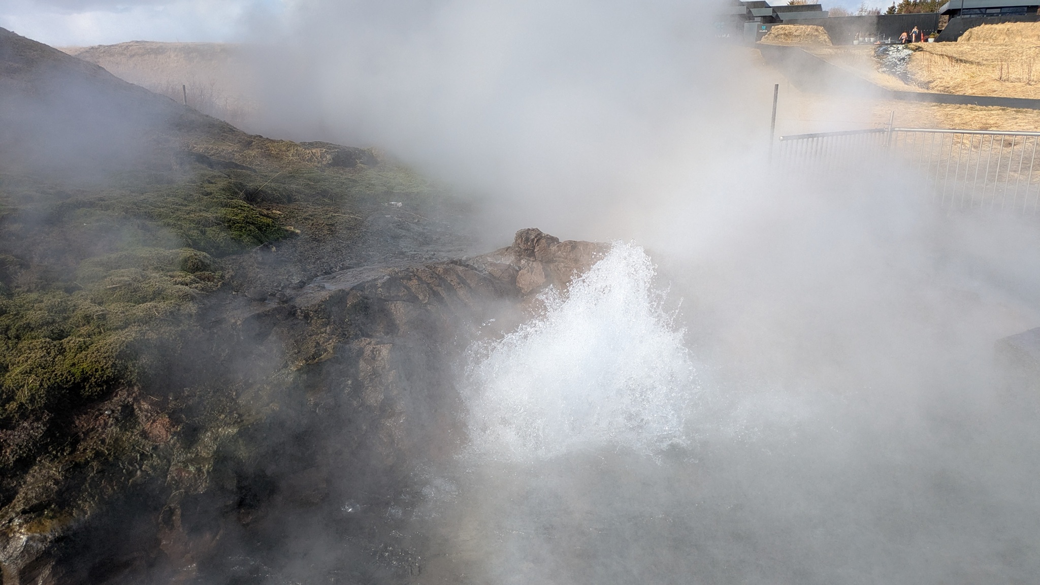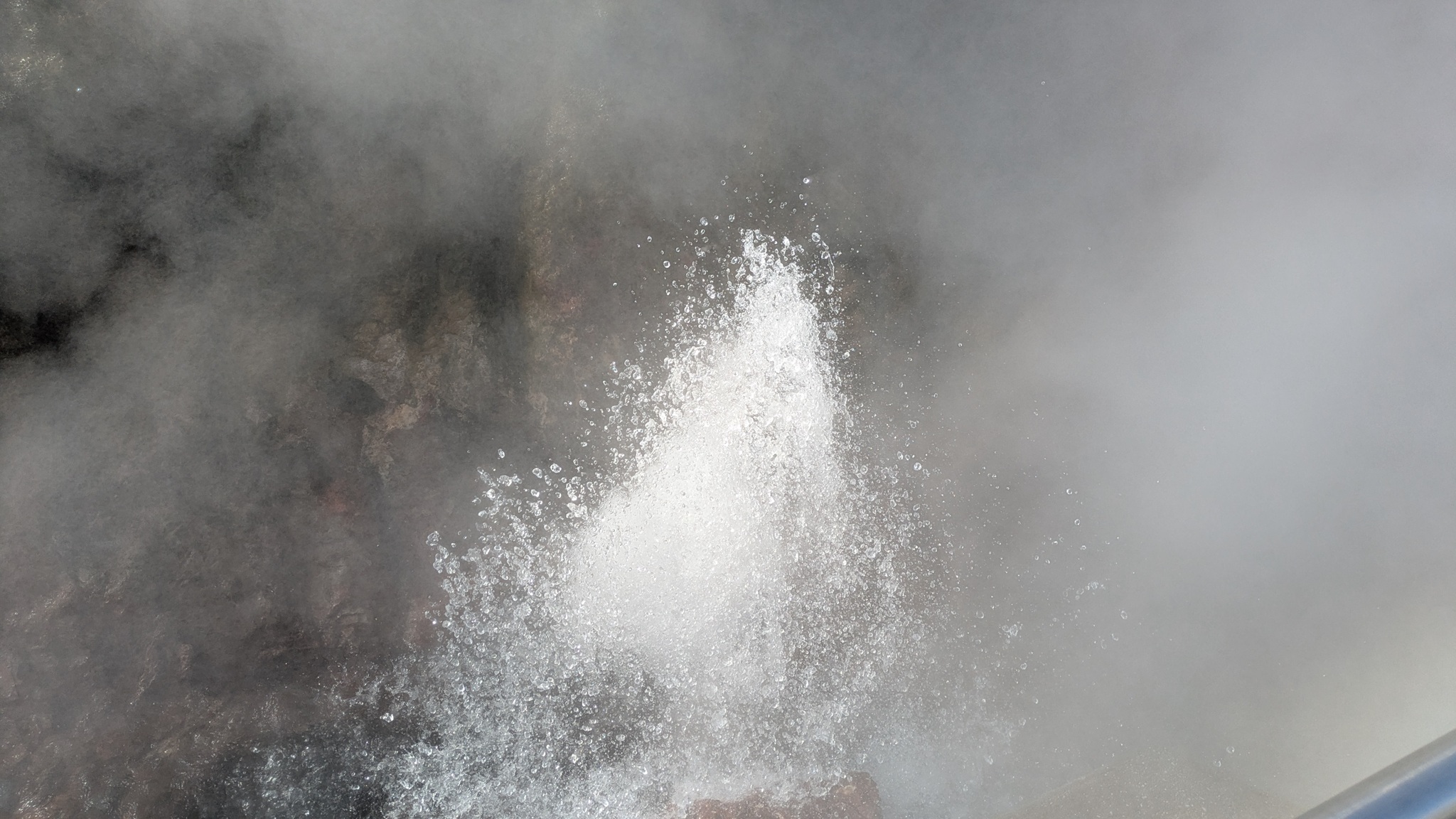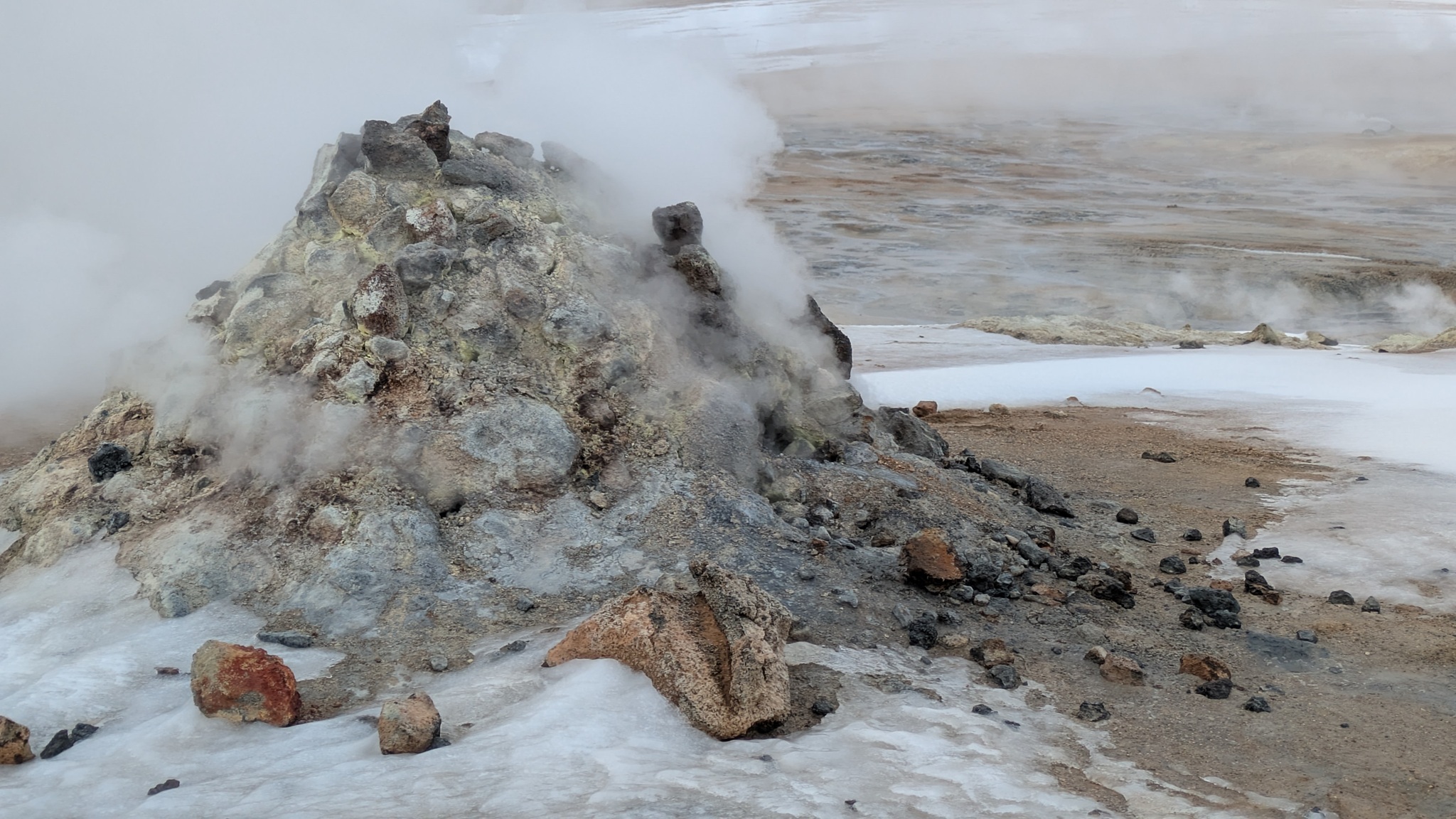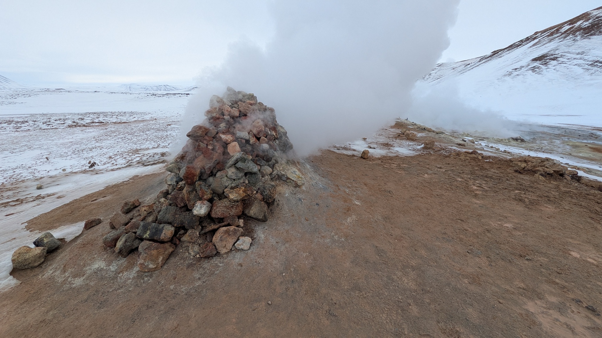 Rund um den Mývatn gibt es reichlich viel zu sehen, aber nicht alles ist heute erreichbar. Das Wetter am Vormittag gut, also los: Erster Stopp an der Dusche am Straßenrand, quasi das Wahrzeichen des Geothermiekraftwerks. Bei Frost läuft sie aber nicht und da hätte ich dann auch keine Lust zum Duschen gehabt. Aber das Foto ist gemacht.