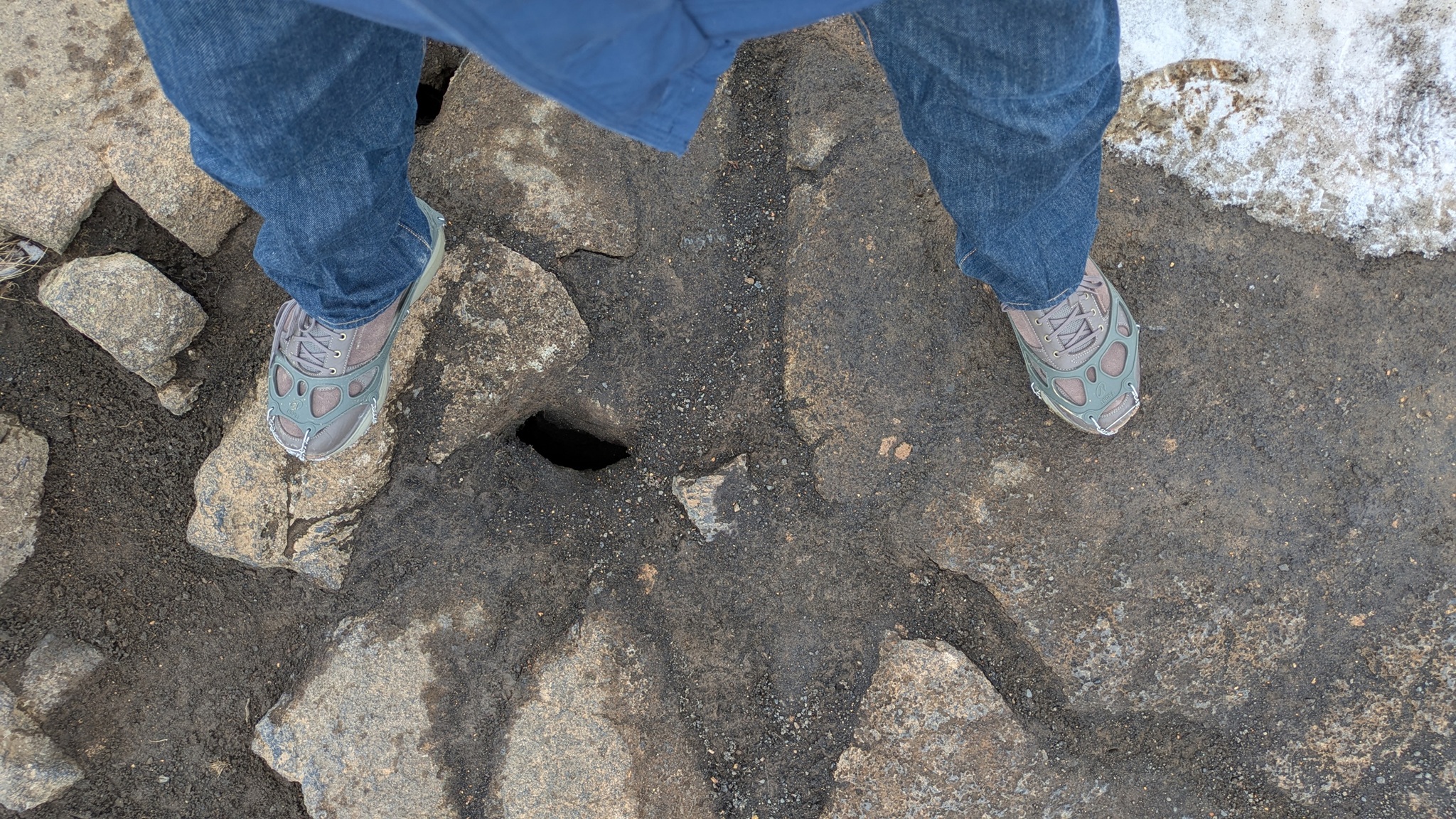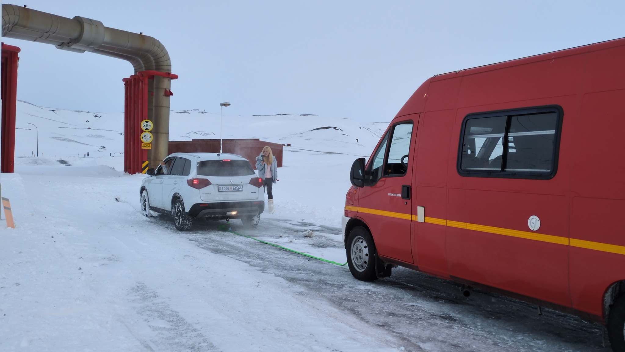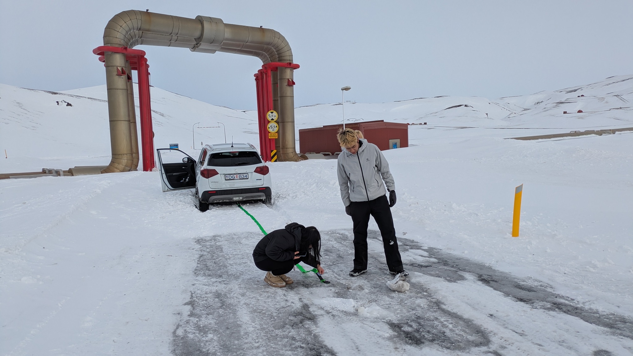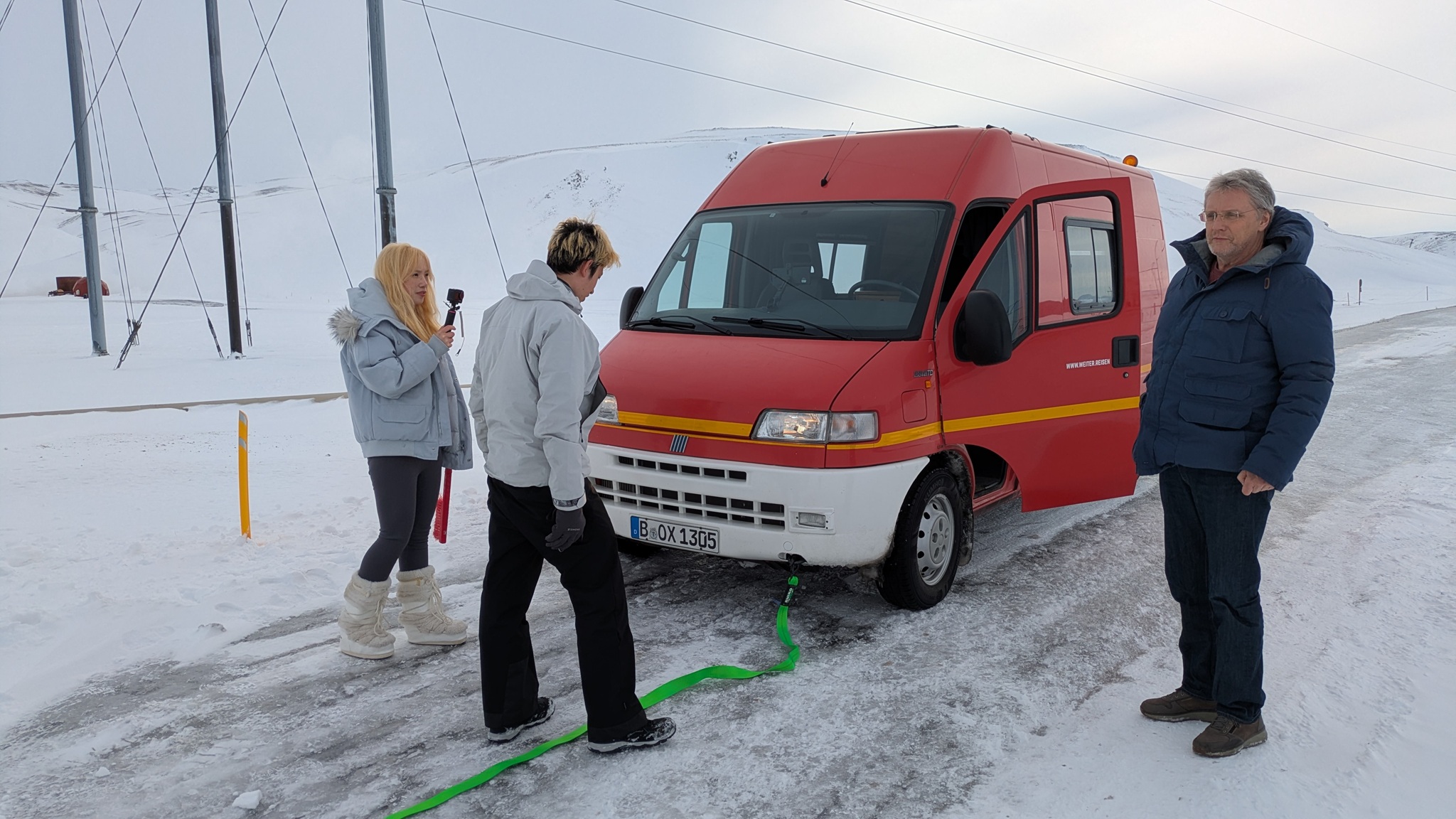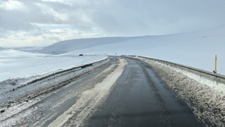 Es sollte nun weitergehen zu einem Lavafeld. Die gestrigen starken Schneeverwehungen haben die Weiterfahrt aber unmöglich gemacht, es war noch nicht geräumt. Drei junge Leute auch China (zwei aus Shanghai, eine aus Taiwan) hatten es versucht und steckten im tiefen Schnee fest als ich dort ankam. Jetzt bewährte sich das neue Abschleppseil und der Allradantrieb, und der Mietwagen war wieder frei. Alle waren überschwänglich glücklich und wir wünschten uns weiterhin eine gute Reise.