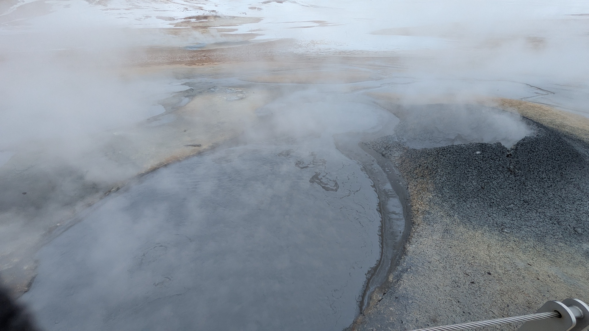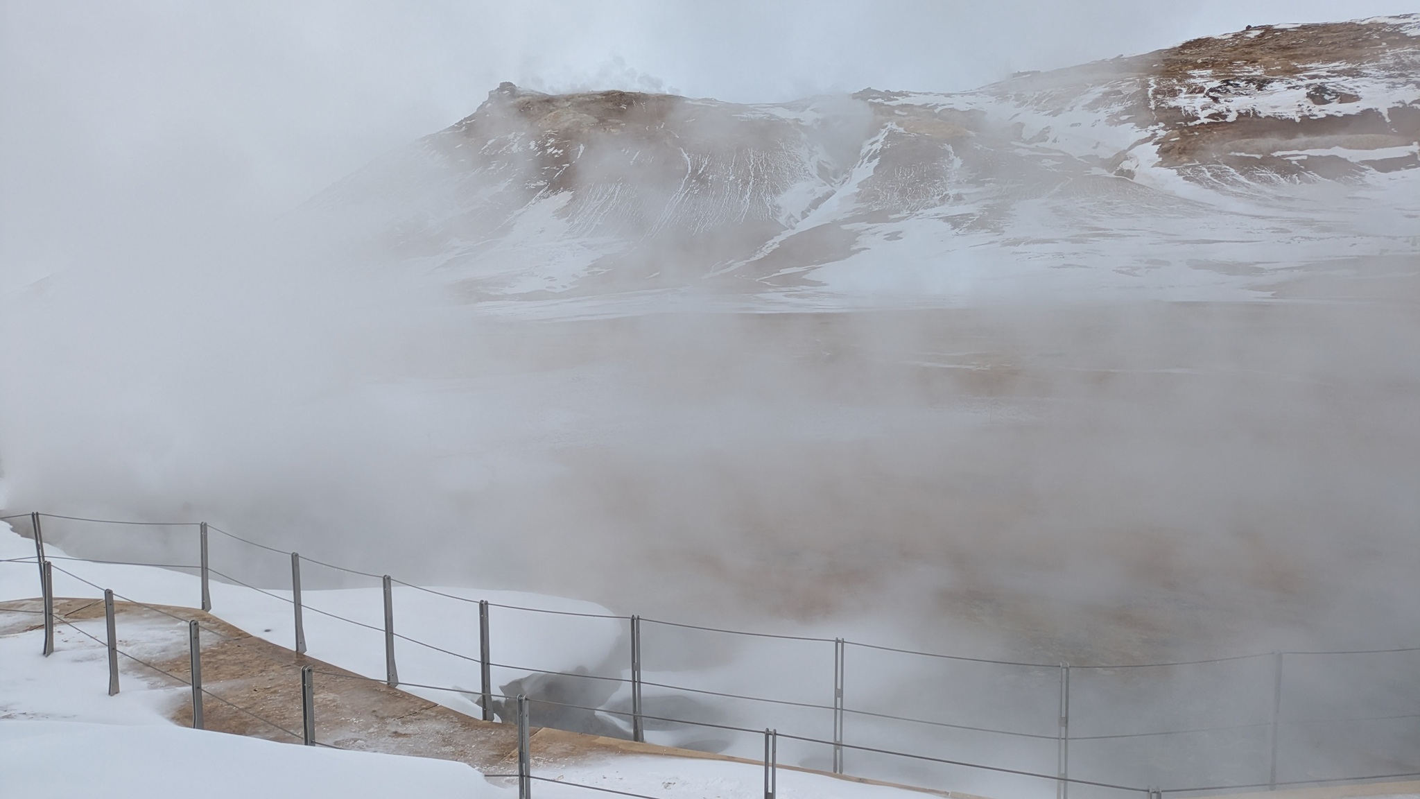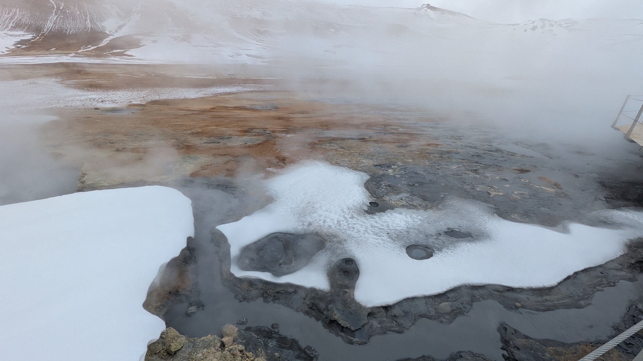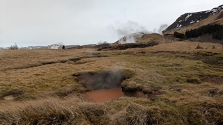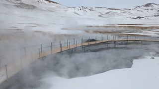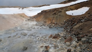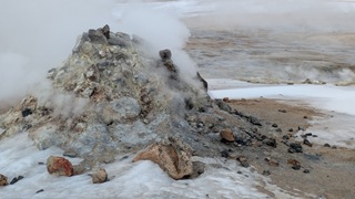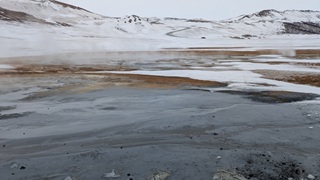 Ganz in der Nähe gibt es eine weitere Attraktion: das Hochtemperaturfeld Hverir. Sündhaft teurer Parkplatz statt eines Eintrittsgeldes - so ist das wohl ansich in Island üblich - ging es über Stege und Wege durch das heiße Feld, Warnschilder sprechen von über 100 °C. Es gluckst, brodelt und dampft heftig, Schwefelduft liegt in der Luft. Sehr eindrücklich!