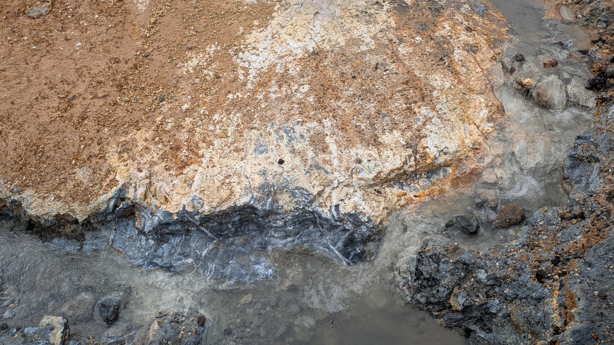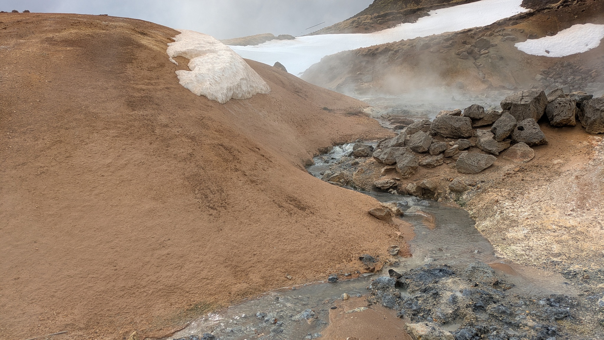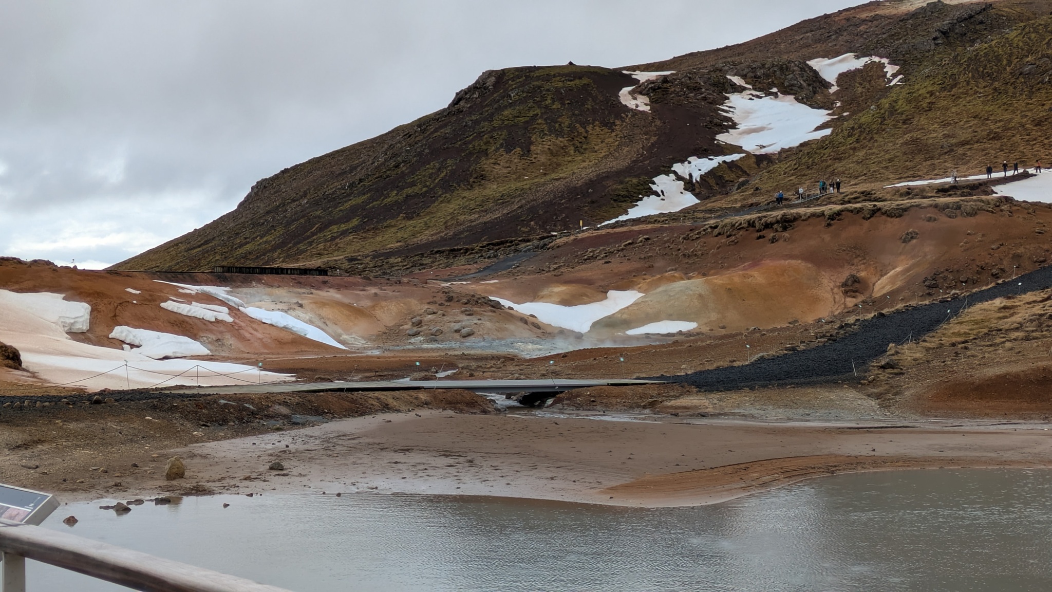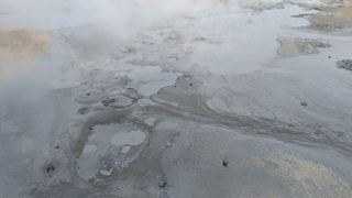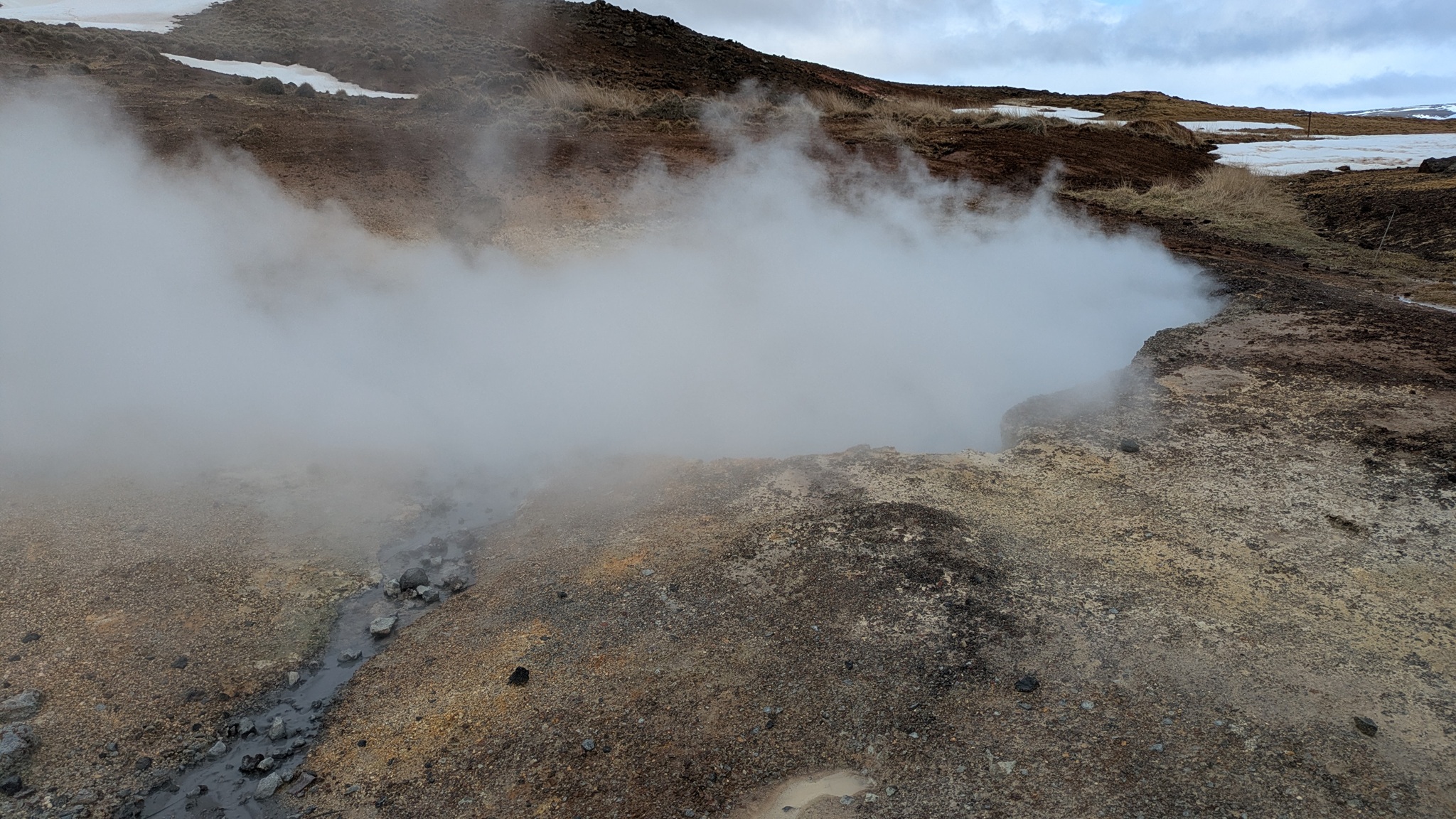 Ganz in der Nähe gibt es eine weitere Attraktion: das Hochtemperaturfeld Hverir. Sündhaft teurer Parkplatz statt eines Eintrittsgeldes - so ist das wohl ansich in Island üblich - ging es über Stege und Wege durch das heiße Feld, Warnschilder sprechen von über 100 °C. Es gluckst, brodelt und dampft heftig, Schwefelduft liegt in der Luft. Sehr eindrücklich!