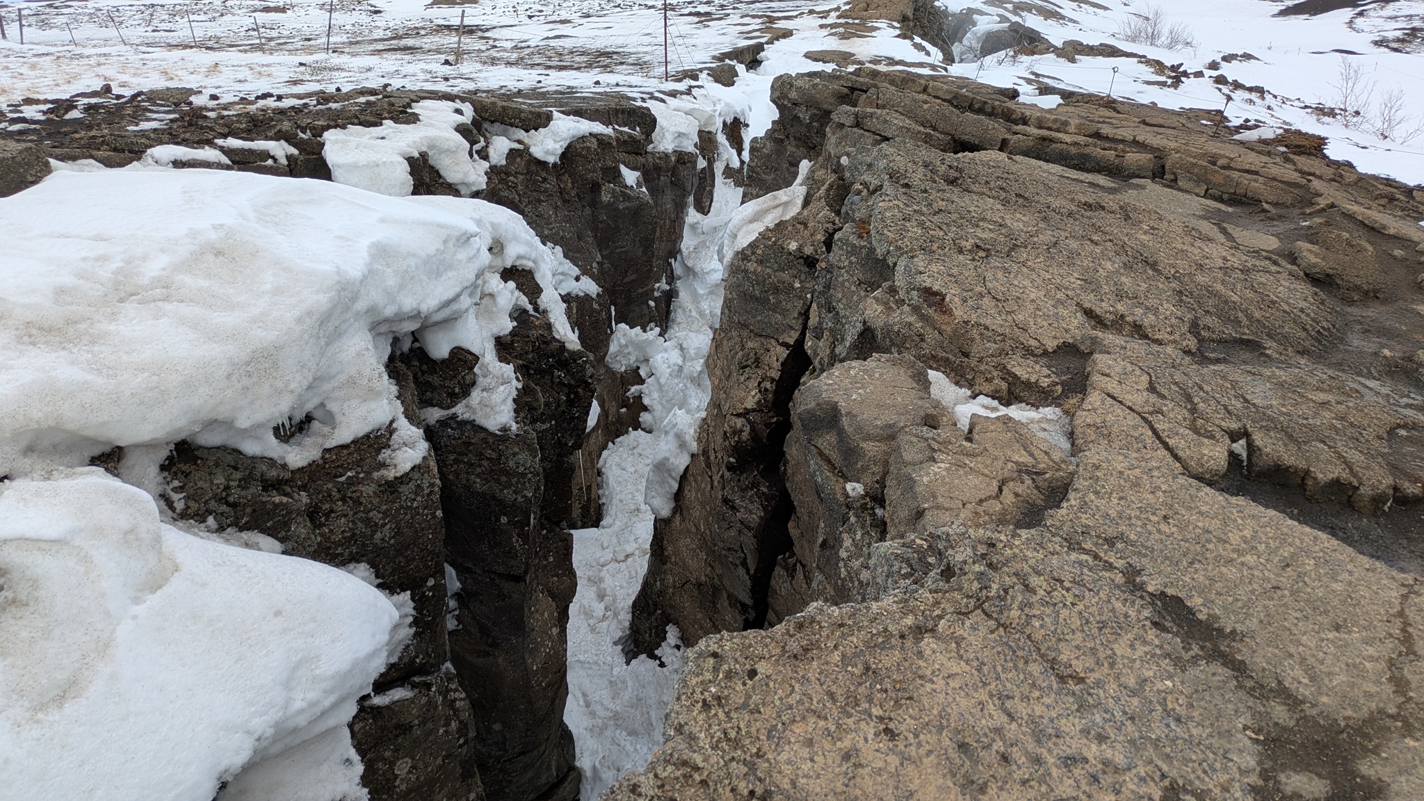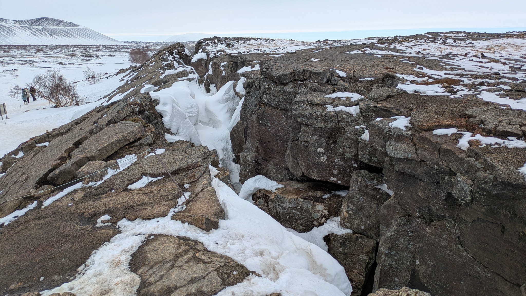 Jetzt noch zur Grjótagjá, einer Höhle, in der früher gebadet werden konnte, direkt auf dem Grabenbruch zwischen Europa und Nordamerika. Seitdem in den 1970ern in der Nähe Lava aufstieg ist das Wasser aber zu heiß. Es ist auch nichts weiter zu sehen. Ein Wagemutiger aus einer polnischen Reisegruppe versuchte noch mittels eines Abschleppseils und meiner Taschenlampe etwas zu sehen - das Seil jedoch war zu kurz. Eine lustige Aktion war es dennoch. Ich konnte noch mit je einem Bein in zwei Kontinenten stehen.