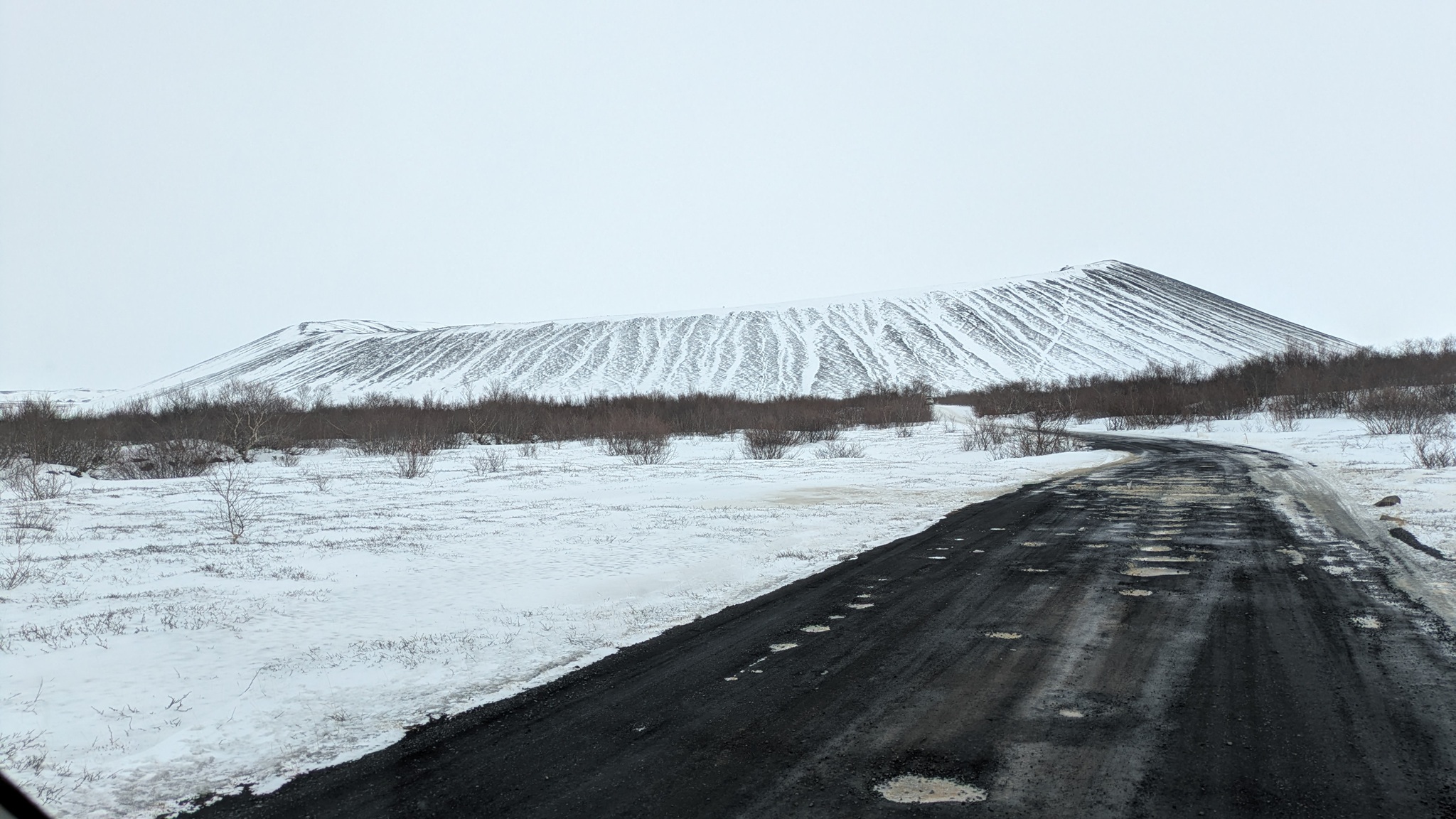An einer Stichstraße liegt der Parkplatz für den Krater Hverfjall. Ein mächtiges Teil, das auf 600 m Fußweg und 100 Höhenmetern erklommen werden kann. Aber trotz Spikes kehrte ich auf halber Strecke um, da die Entgegenkommenden beim Abstieg ständig ausrutschen und sich hinlegten. Danach war mir nicht.