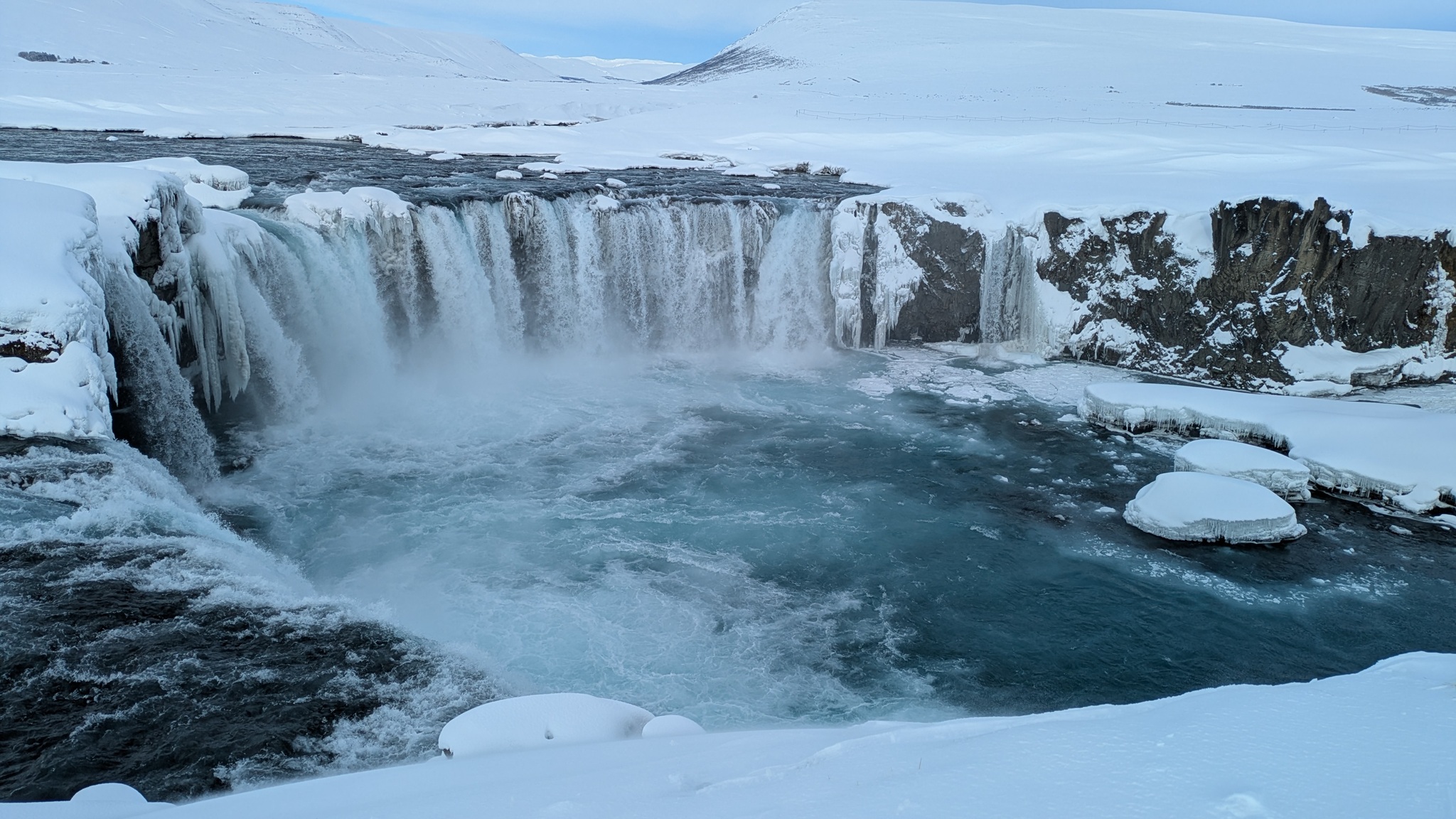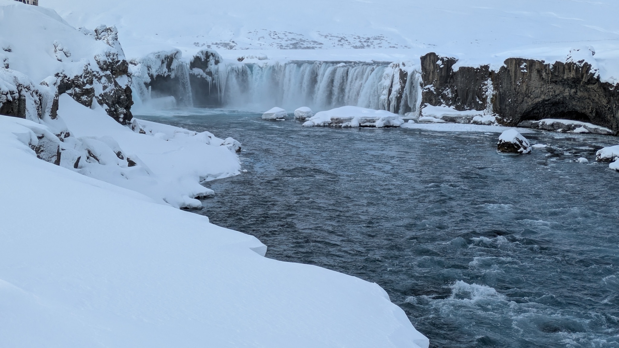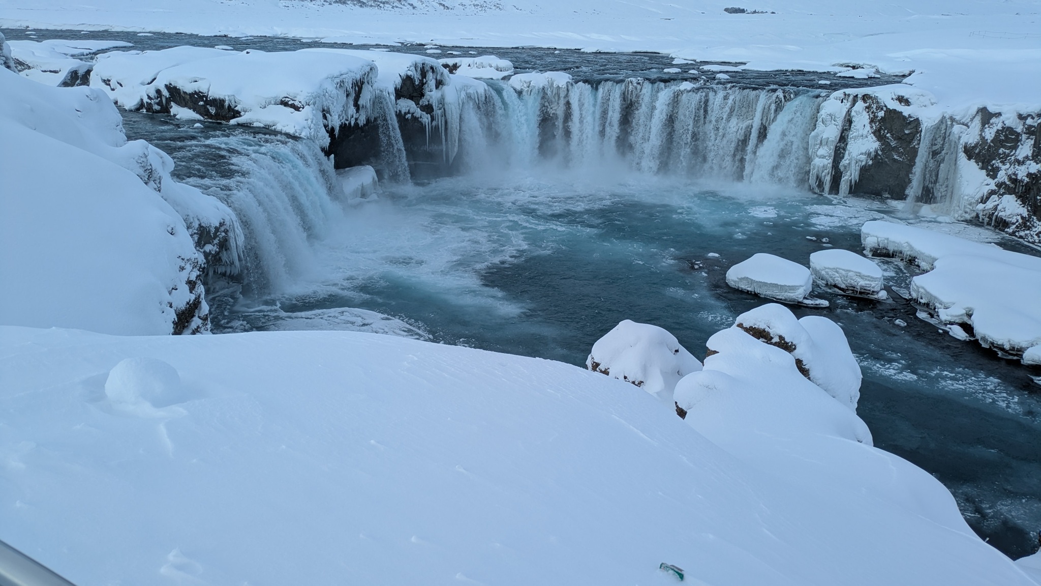 Das Wetter zieht mich weiter Richtung Westen. Aber nicht, ohne den nächsten spektakulären Stopp einzulegen: Goðafoss. Der halbkeisförmge Wasserfall ist jetzt im Winter auf seine Weise besonders eindrucksvoll. Er liegt auch direkt an der Ringstraße, also gut zu erreichen, anders als der 44 m hohe Dettifoss. Da ist die Zufahrt aktuell noch gesperrt.