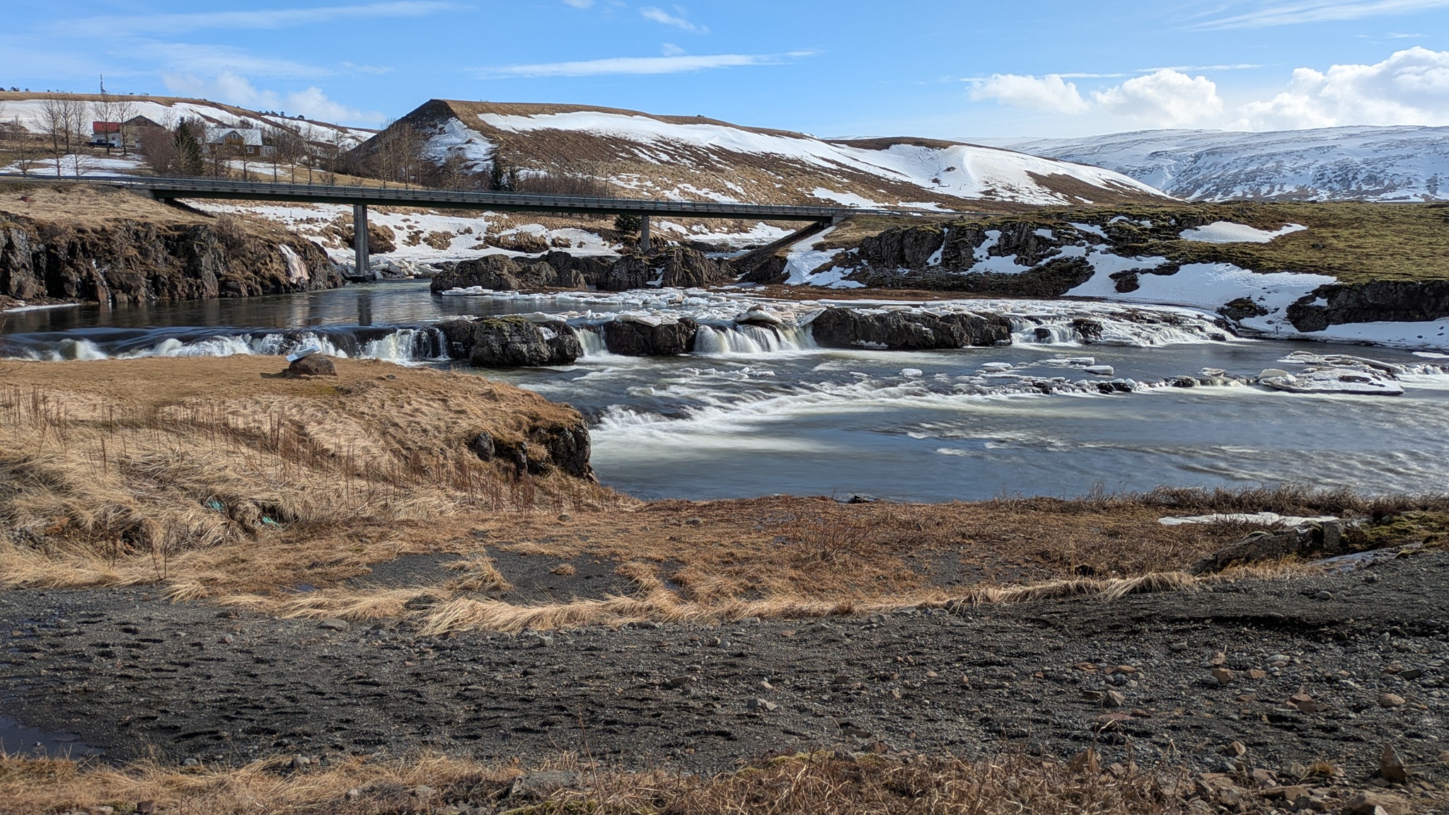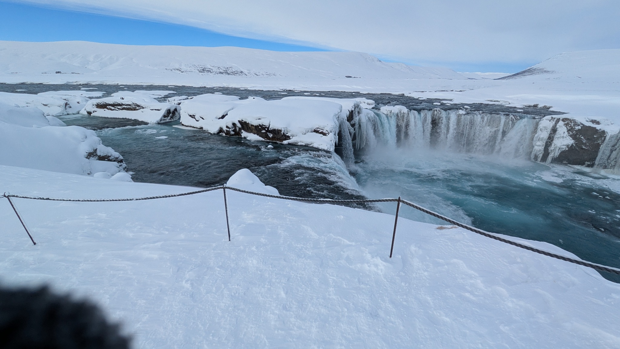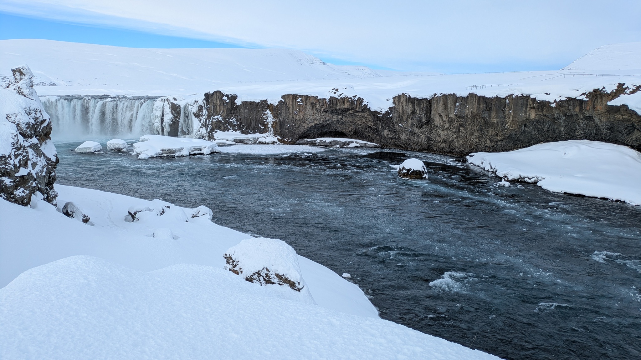 Das Wetter zieht mich weiter Richtung Westen. Aber nicht, ohne den nächsten spektakulären Stopp einzulegen: Goðafoss. Der halbkeisförmge Wasserfall ist jetzt im Winter auf seine Weise besonders eindrucksvoll. Er liegt auch direkt an der Ringstraße, also gut zu erreichen, anders als der 44 m hohe Dettifoss. Da ist die Zufahrt aktuell noch gesperrt.