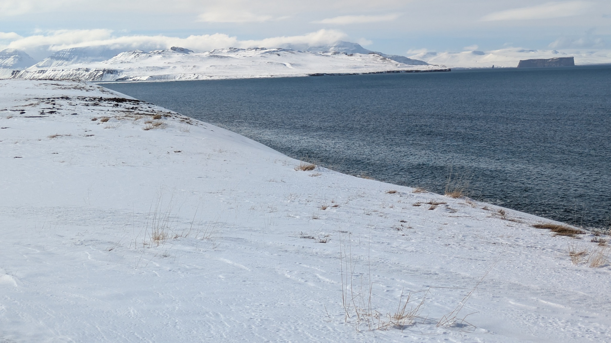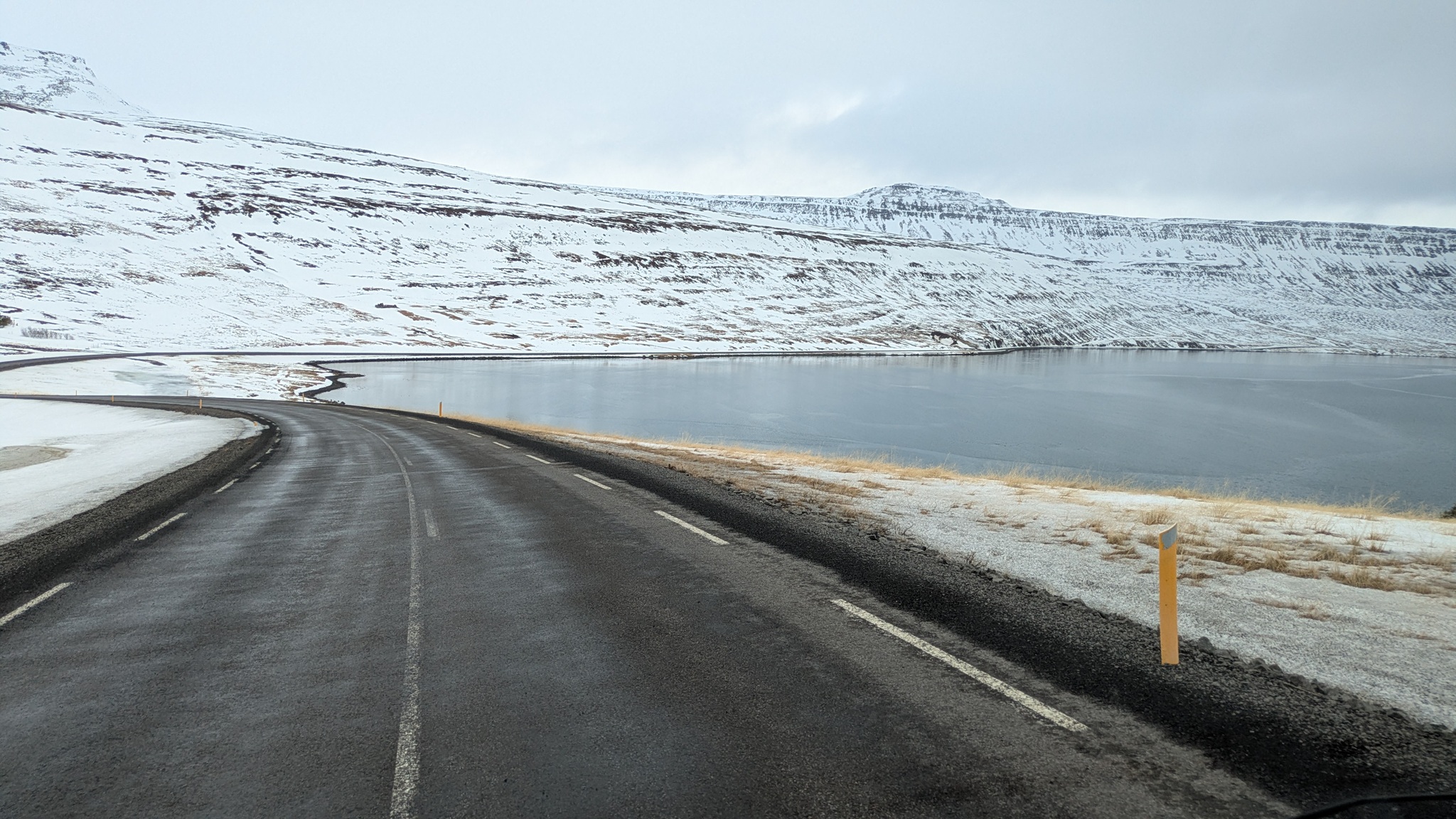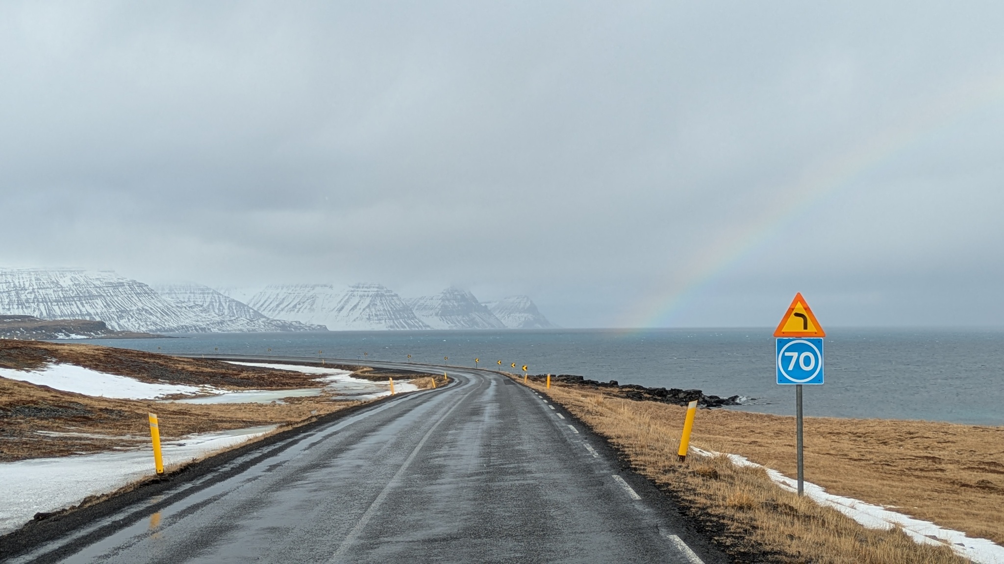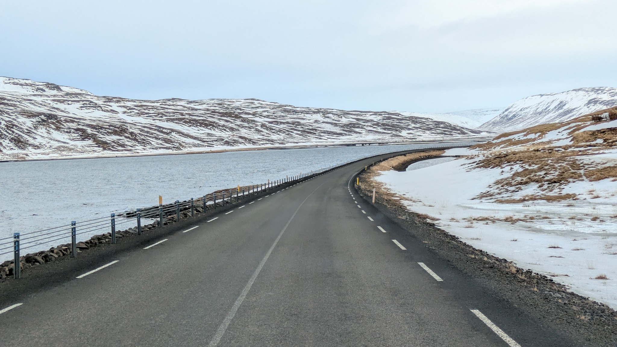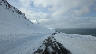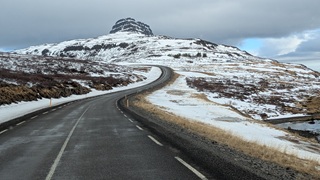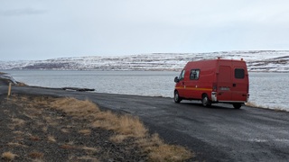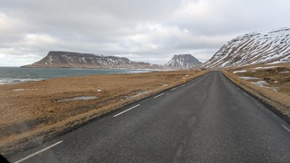 Wieder eine längere Etappe - meistens richte ich mich nach den Übernachtungsmöglichkeiten in der Wintersaison - in Richtung Westfjorde. Erst ein gutes Stück auf der Ringstraße, dann auf der 68 nach Norden. Teils Asphalt, nach einer Kaffeepause am Kirchenparkpatz dann im Wechsel mit löchriger Schotterpiste. Schnee liegt jetzt deutlich weniger, die Ausblicke auf die Fjordlandschaft sind herrlich und der Campingplatz am Ende hatte wieder einen schönen heißen Pool.