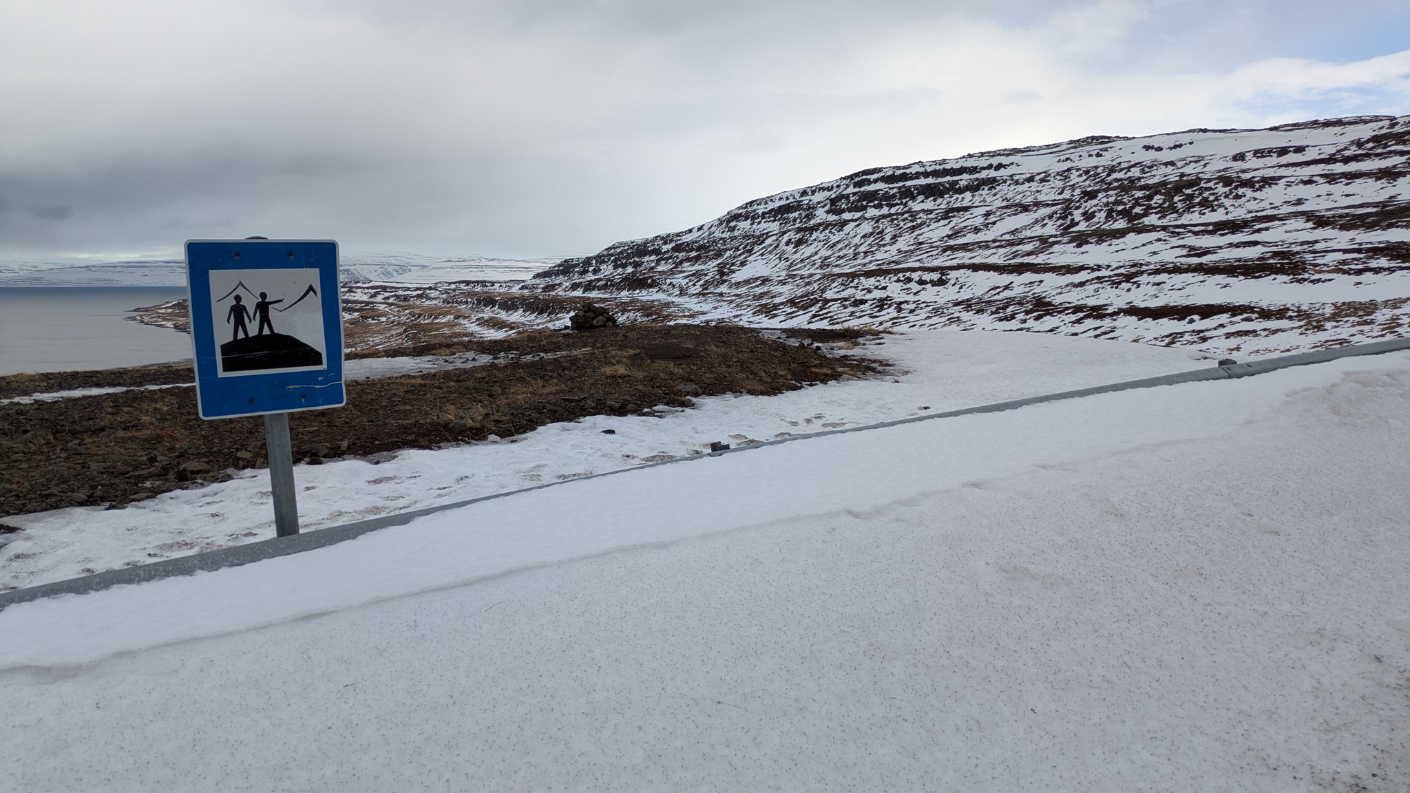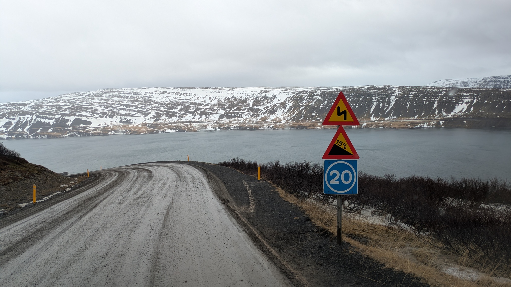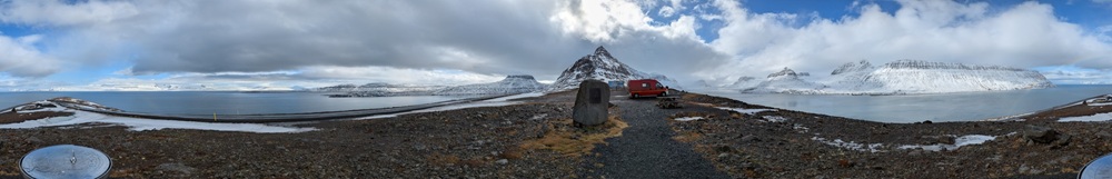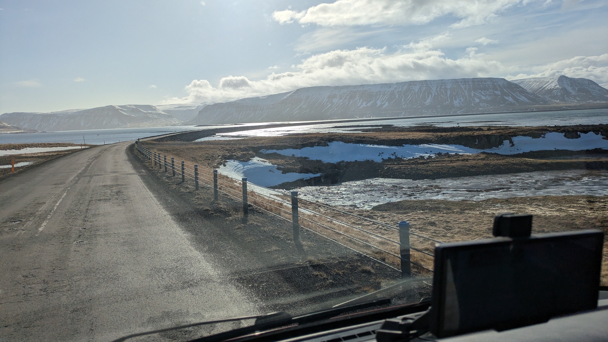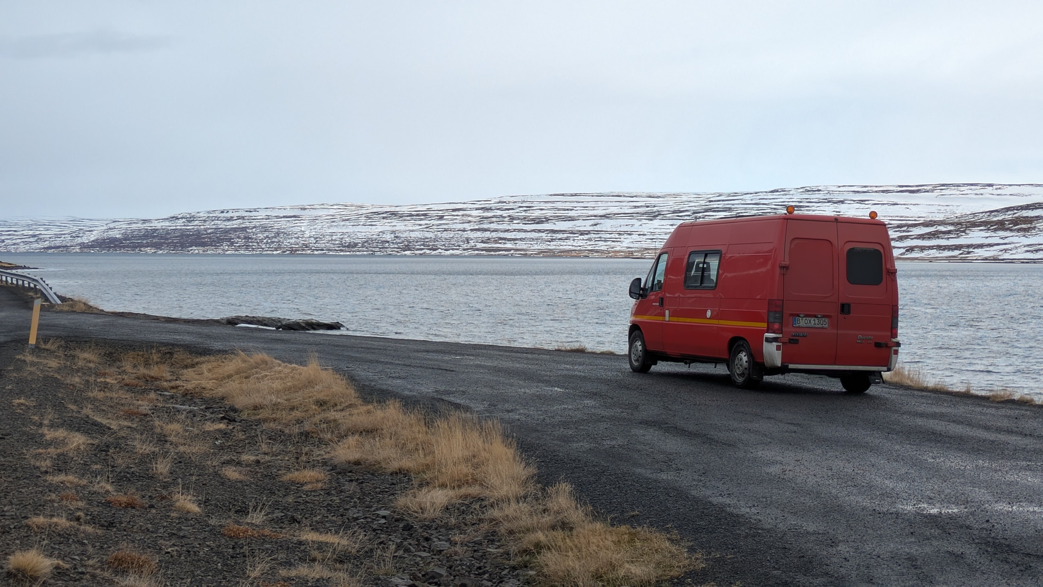 Weiter Richtung Süden. Die Westfjorde lasse ich nun hinter mir, der letzte Abstecher fiel wegen geschlossener Straße aus. Die Route 60 ist kurios: erst wunderbar ausgebaut mit langem breitem Tunnel, dann hoch in die Berge auf der übelsten Matschpiste bisher, Regen oder Schneetreiben und wieder hinunter ans Wasser. Die Fahrt war heute deshalb recht anstrengend. Am Nachmittag kam die Sonne dann aber auf einem sehr abgelegenen Platz noch heraus und ich hatte einen schönen Blick auf den Fjord. Abends gab's Raclette.