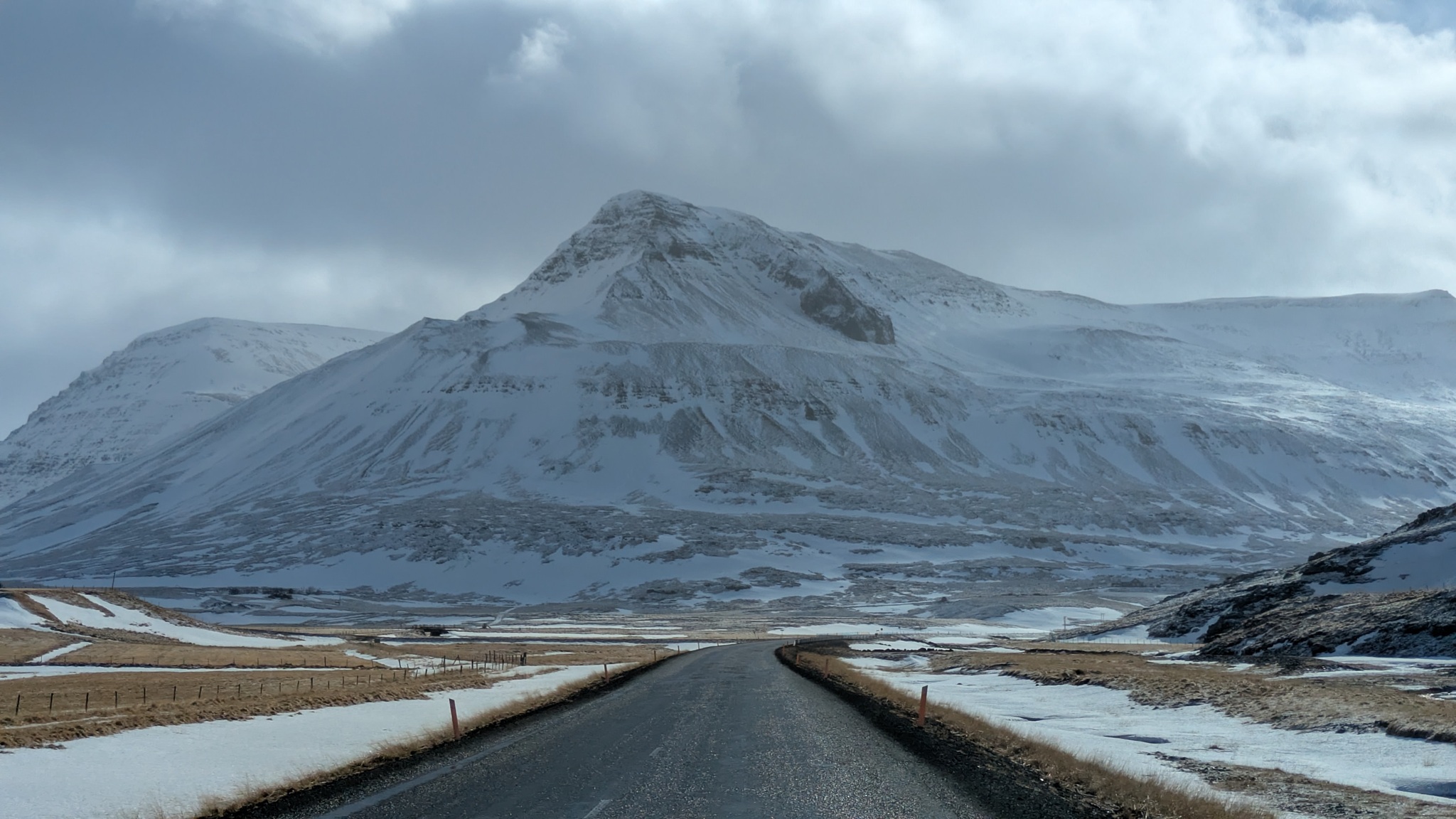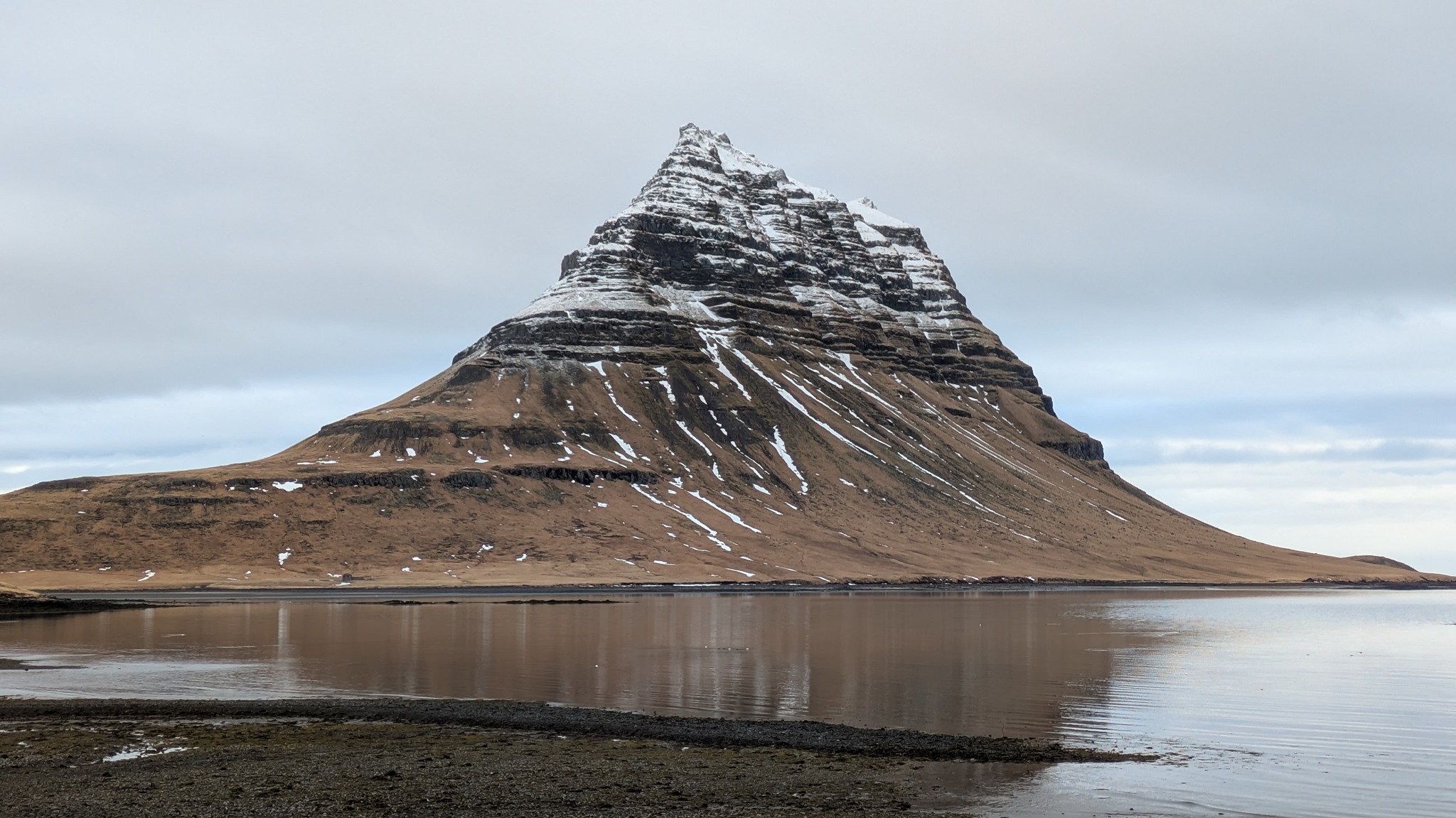 Das Wetter weiterhin regnerisch, anfangs noch ein kurzer Blick auf den Kirkjufell, ein Berg, der zu den Wahrzeichen der Halbinsel Snæfellsnes zählt, dann aber auf der Ringstraße 1 erstmal an Reykjavík vorbei bis zum nächsten Platz, heute wieder mit Strom.