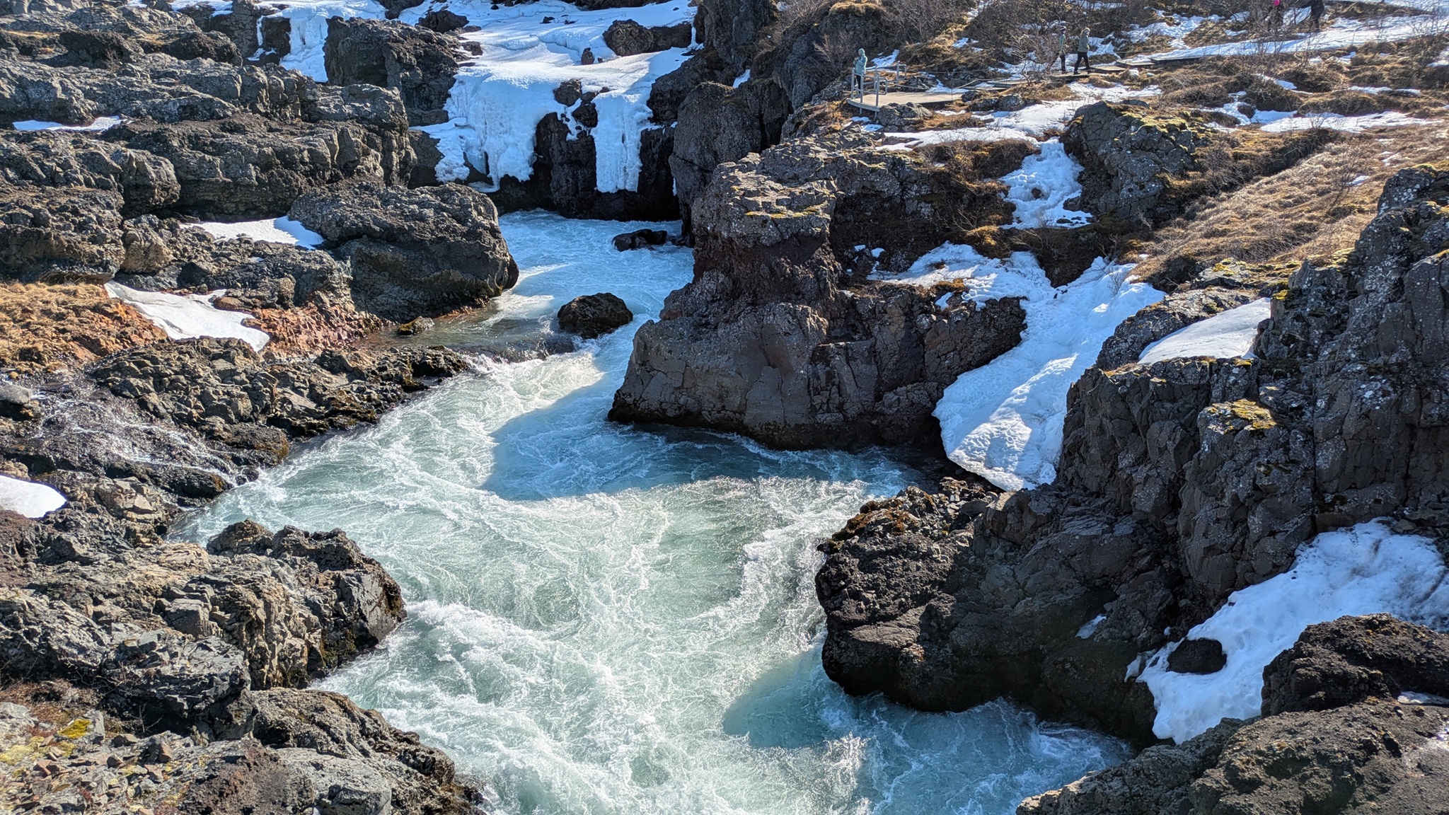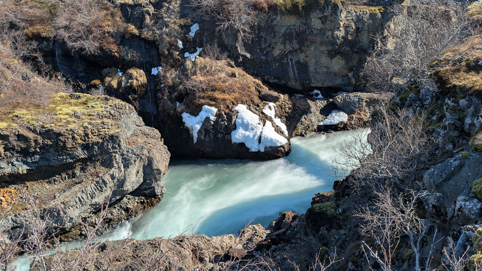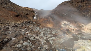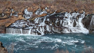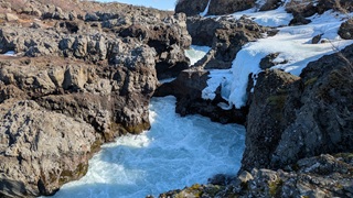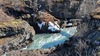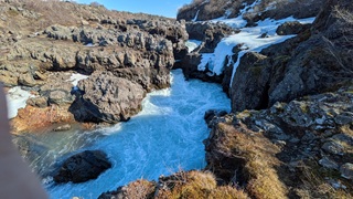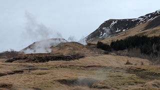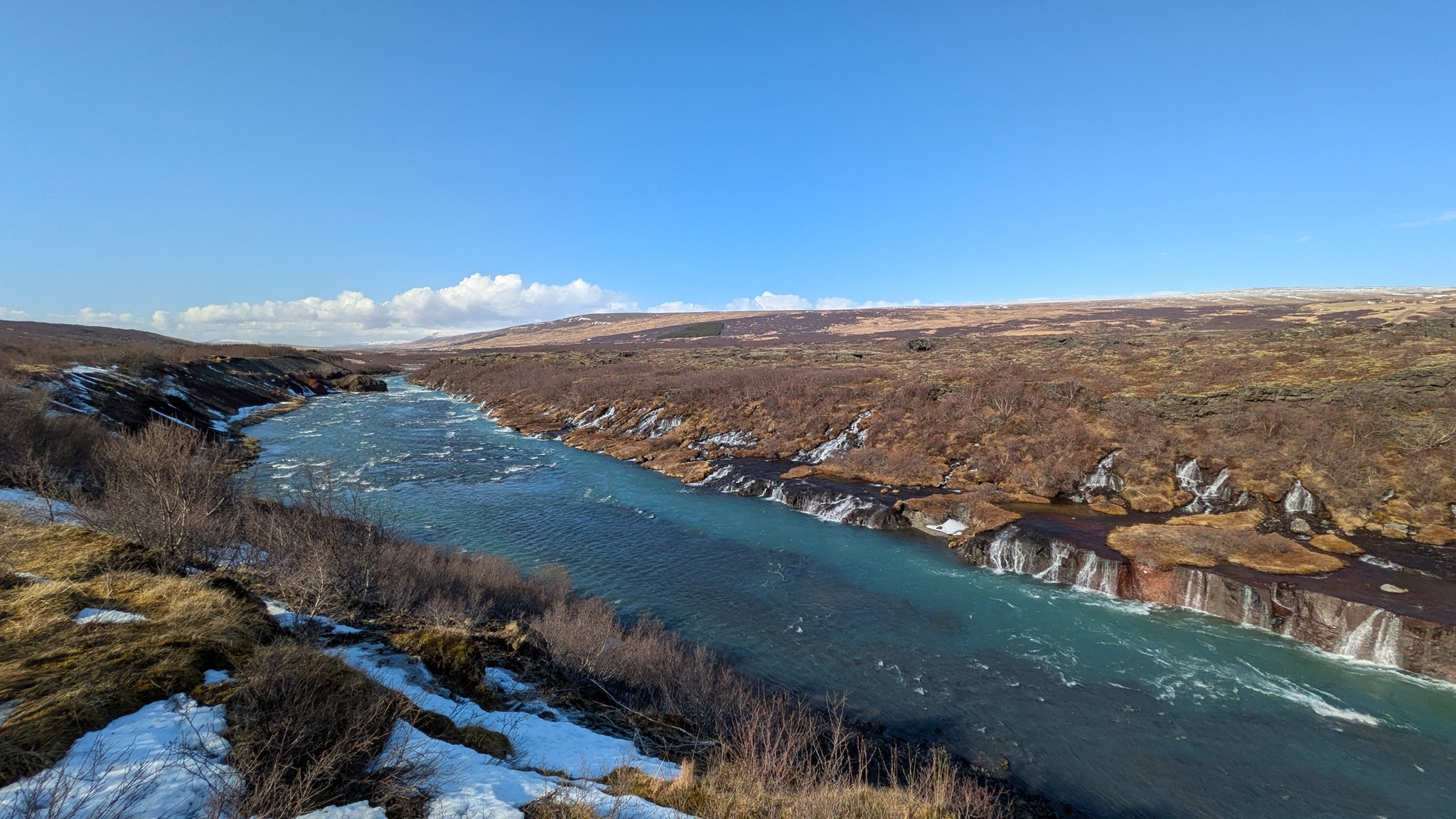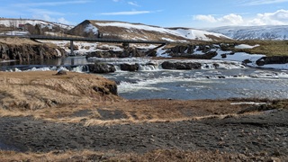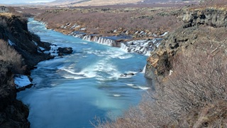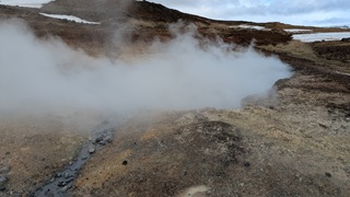 Die Besichtugungsausbeute von heute: nebst gigantischen Ausblicken auf Berge und Gletscher zwei Wasserfälle und eine kochend heiße Quelle. Dazu ging es erst nach Süden, dann soweit noch Osten ins Landesinnere, wie es zu dieser Jahreszeit eben geht: das Reykholtsdalur, das Rauchtal. Beim Hraunafossar strömt Wasser auf 700 m Länge direkt aus der erkalteten Lava in den darunter liegenden Fluss Hvitá, ein besonderes Schauspiel. Fußläufig entfernt stürzt der Barnafoss neun Meter laut und geräuschvoll hinunter. Wieder ein Stück westlich die Springquelle Deildartunguhver. Sie ist wohl sehr ergiebig, es zischt an mehren Stellen 100 °C heißes Wasser empor. Dabei wäre auch ein Thermalbad. Ich "begnüge" mich heute aber wiederum mit den heißen - na, ja, sagen wir im Vergleich warmen - Hot Pools der Unterkunft, ein Ferienareal mit Camping, diversen Hütten und Appartements.