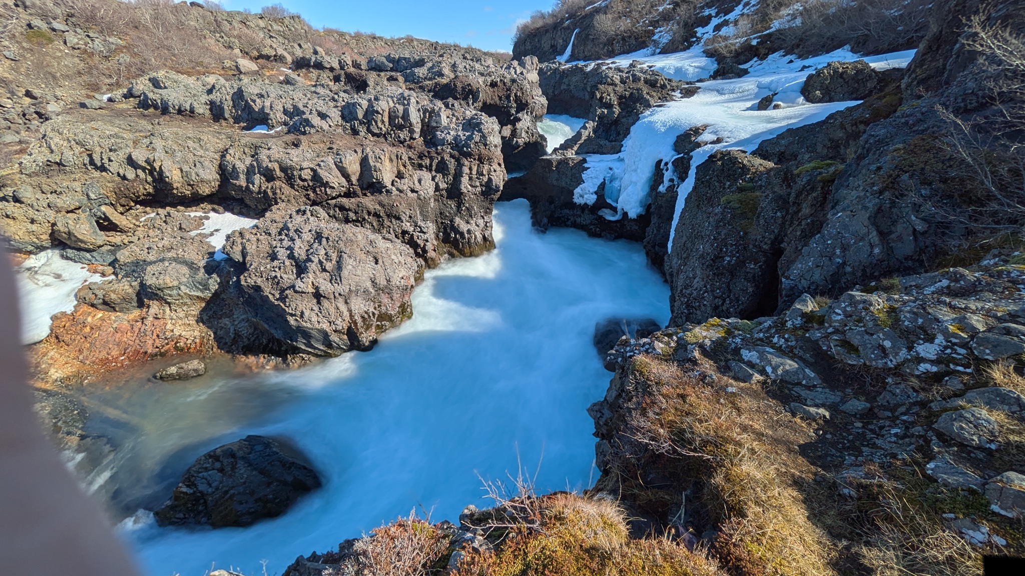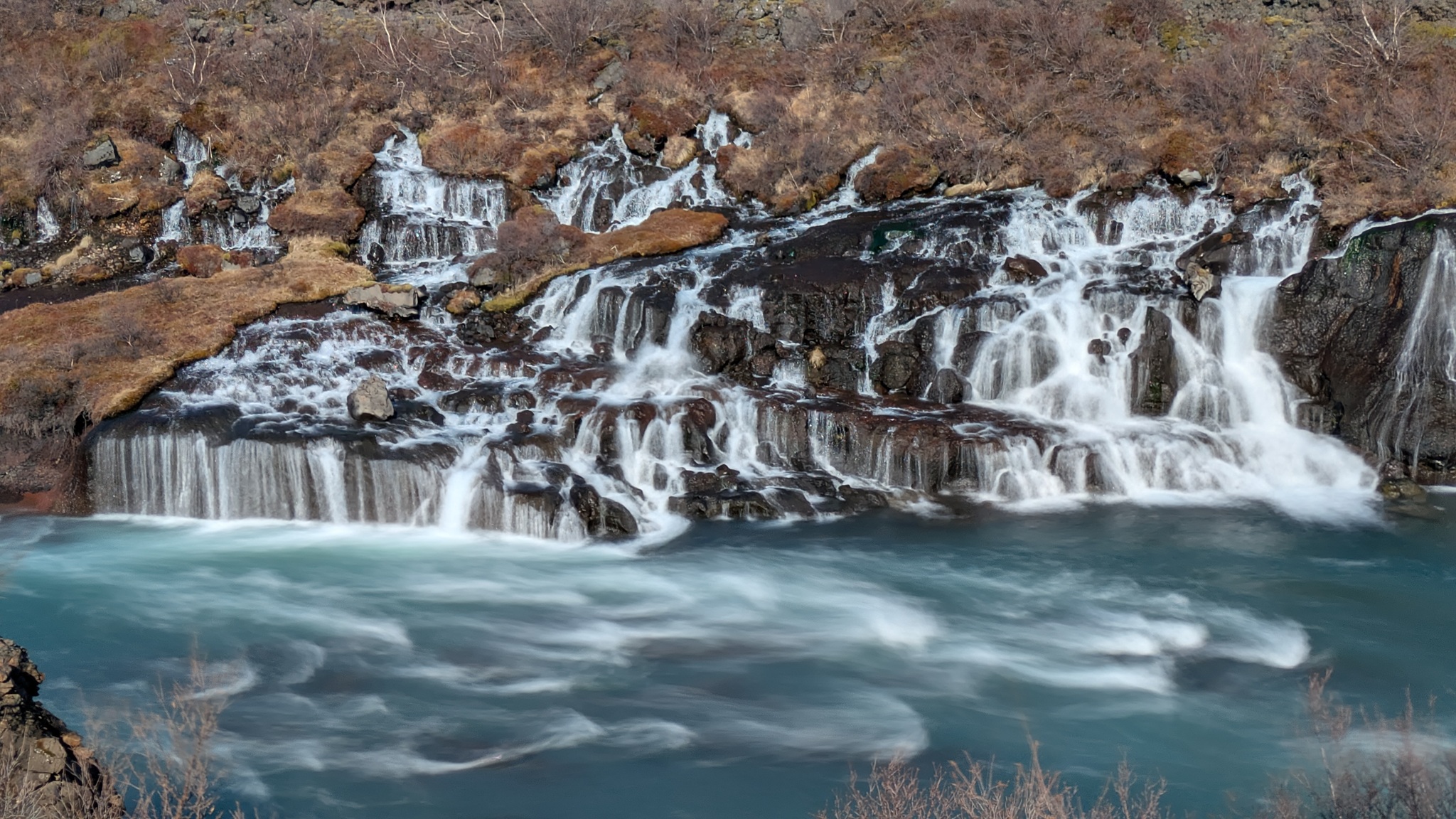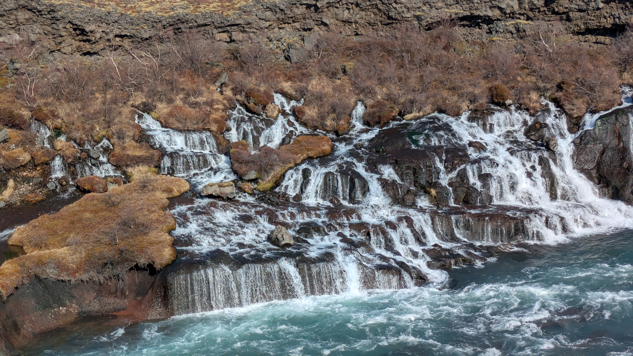 Die Besichtugungsausbeute von heute: nebst gigantischen Ausblicken auf Berge und Gletscher zwei Wasserfälle und eine kochend heiße Quelle. Dazu ging es erst nach Süden, dann soweit noch Osten ins Landesinnere, wie es zu dieser Jahreszeit eben geht: das Reykholtsdalur, das Rauchtal. Beim Hraunafossar strömt Wasser auf 700 m Länge direkt aus der erkalteten Lava in den darunter liegenden Fluss Hvitá, ein besonderes Schauspiel. Fußläufig entfernt stürzt der Barnafoss neun Meter laut und geräuschvoll hinunter. Wieder ein Stück westlich die Springquelle Deildartunguhver. Sie ist wohl sehr ergiebig, es zischt an mehren Stellen 100 °C heißes Wasser empor. Dabei wäre auch ein Thermalbad. Ich "begnüge" mich heute aber wiederum mit den heißen - na, ja, sagen wir im Vergleich warmen - Hot Pools der Unterkunft, ein Ferienareal mit Camping, diversen Hütten und Appartements.