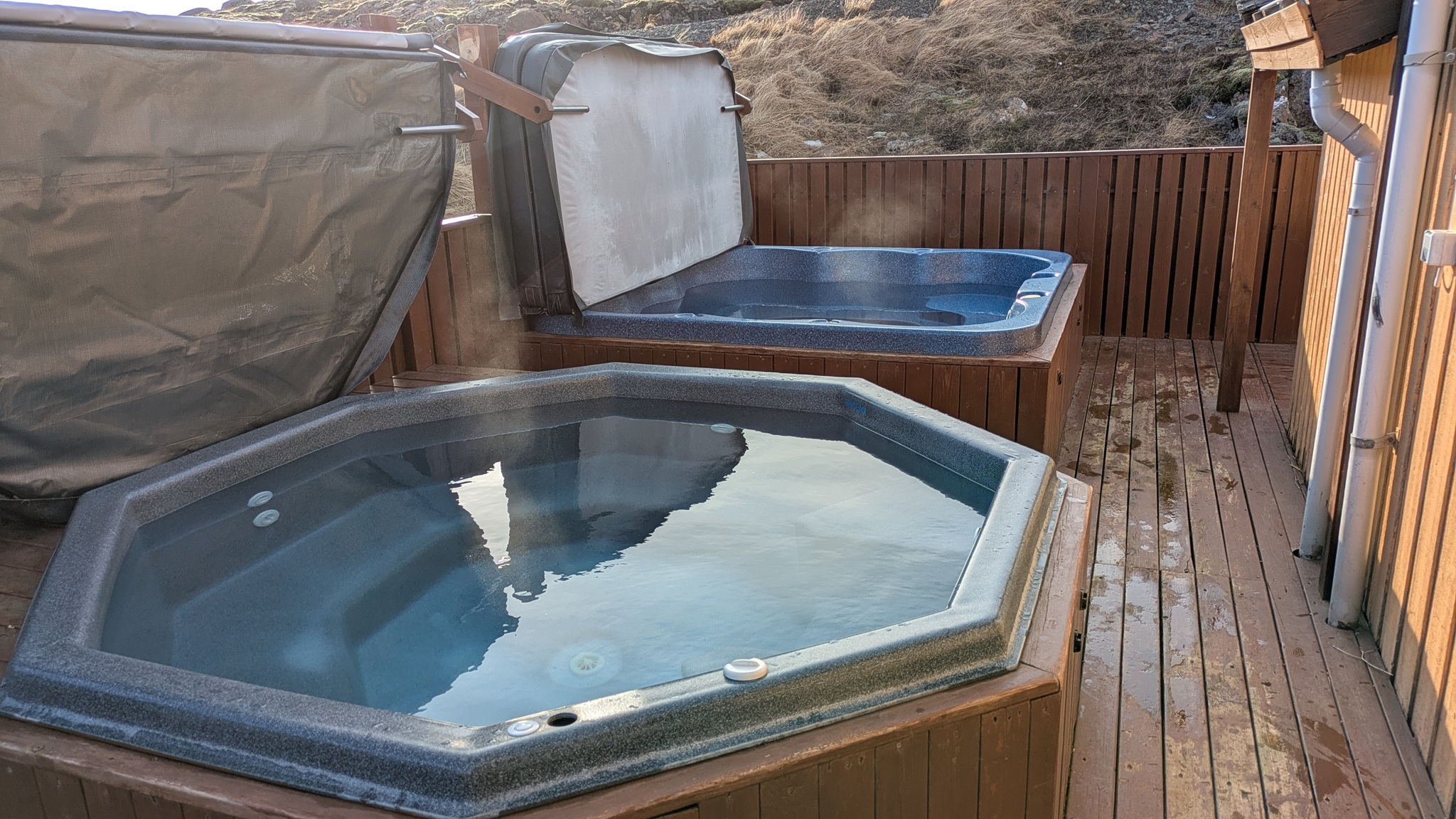 Die Attraktion des Ortes noch ein Stücker weiter die Straße hinauf ist der heiße Pool mit drei Becken und Eintritt, mitten im Dorf. Das Foto ist gemacht, aber dank der schönsten Pools auf den Campingplätzen konnte ich leichten Herzens verzichten. Es folgte eine lange Tour, teils für 10 km Luftlinie 80 km Strecke, entlag der Westfjorde. Ein Wasserfall und einige Aussichtspunkte später traf ich am Nachmittag an meinem neuen Platz ein, die drei angefahrenen davor waren nicht schön oder zu. Jetzt stehe ich auf einem Eisbrett direkt am Wasser, in der Hoffnung, da morgen wieder rauszukommen!