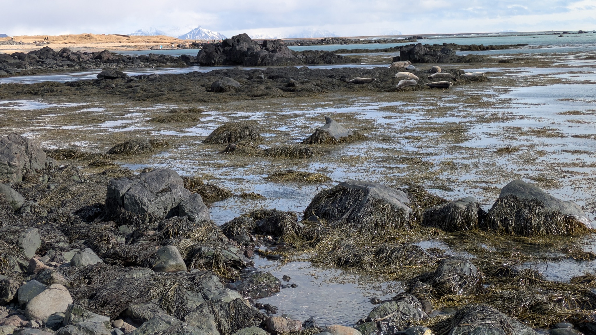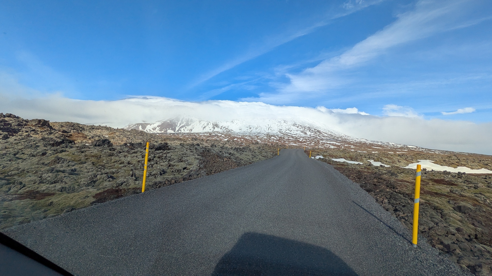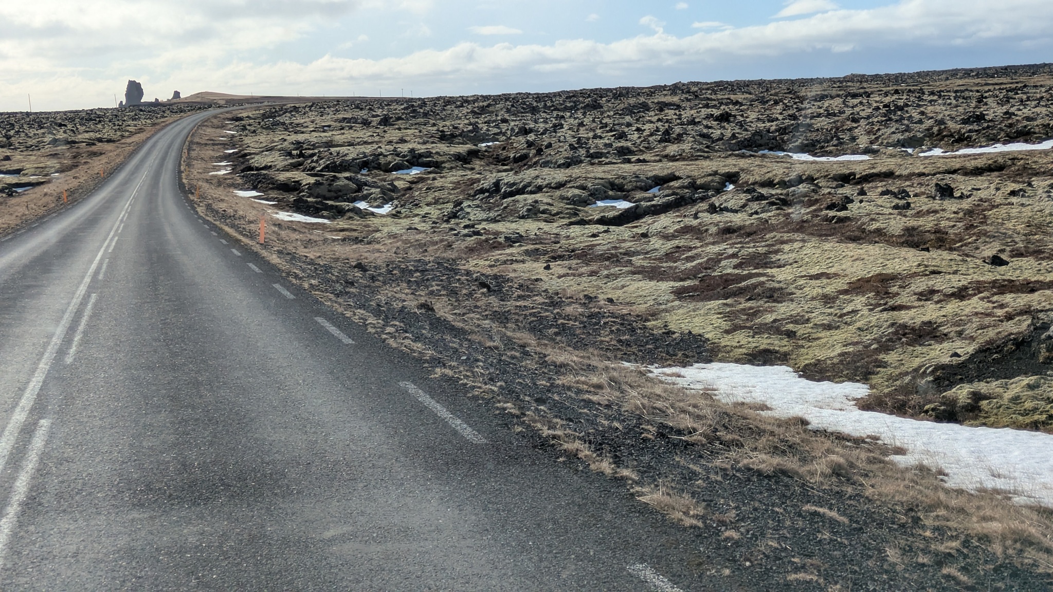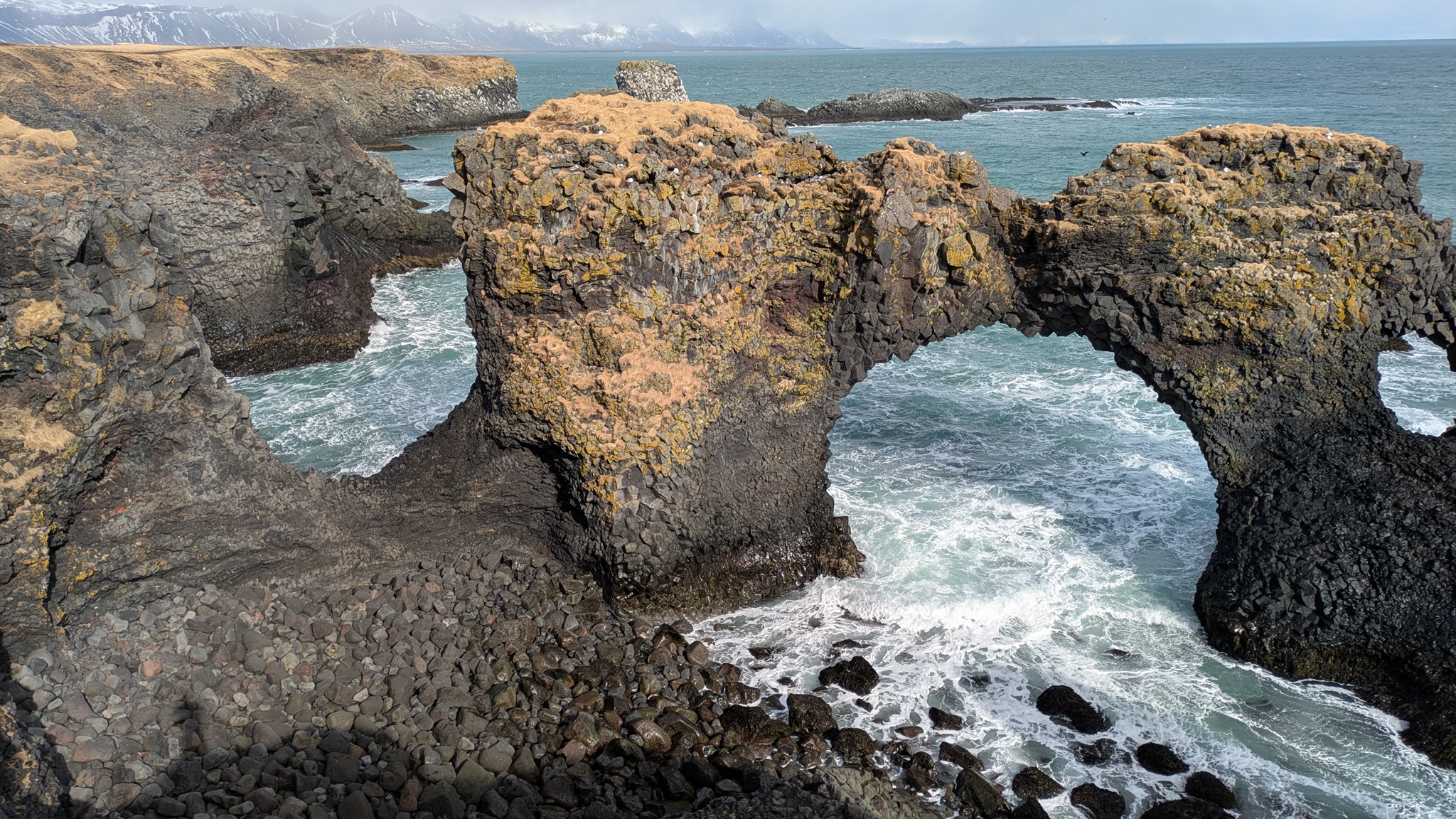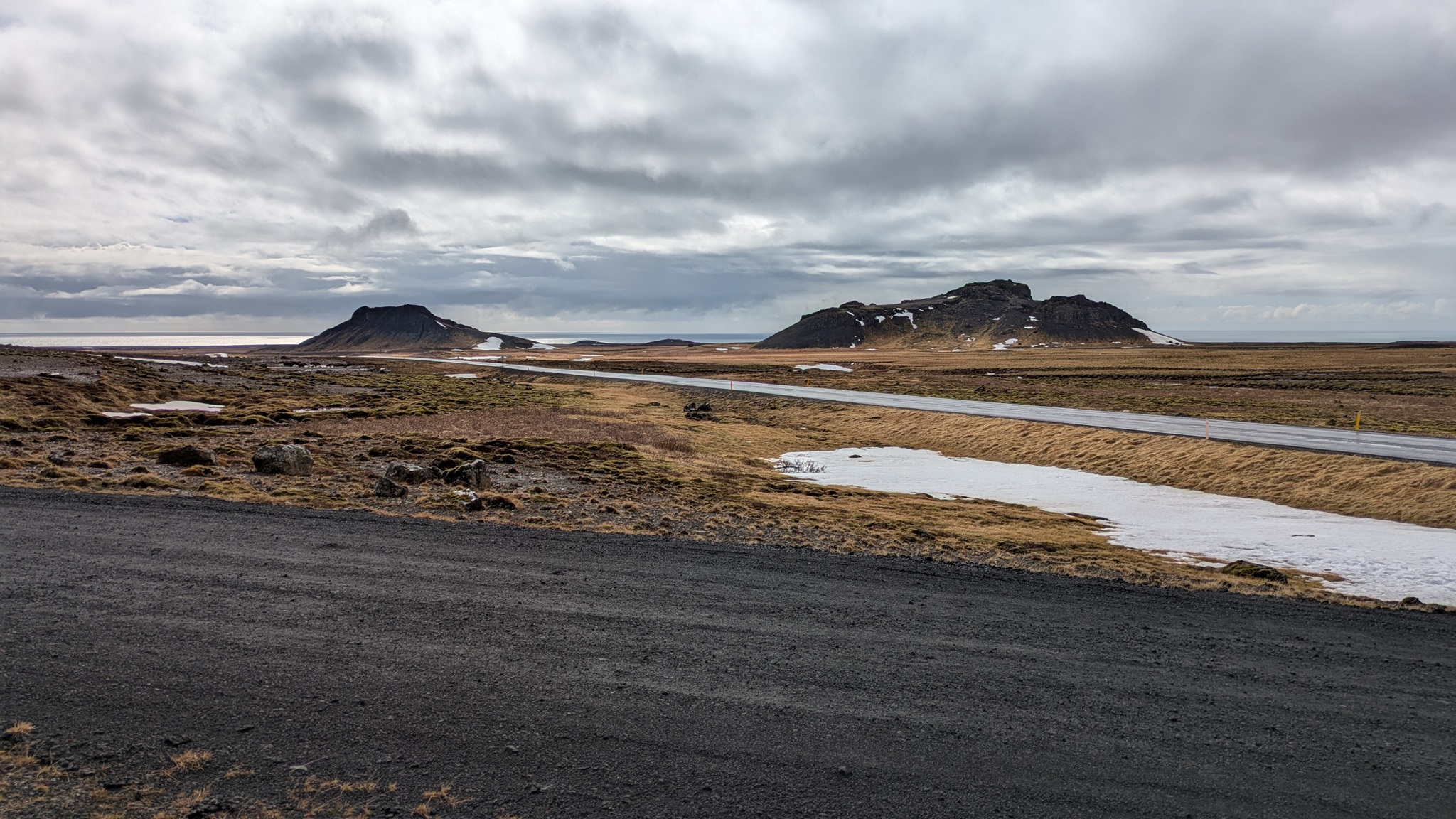 Die Geburtstagstour startete bei ansprechendem Wetterchen auf die Halbinsel Snæfellsnes und hatte Tanken und Einkaufen als ersten Punkt. Nächster Halt an den Basaltsäulen von Gerðuberg. Weiter ging es bis Ytri Tunga, ein Küstenabschnitt mit schroffem, schwarzen Lavagestein, auf dem sich eine Kolonie Seehunde räkelte. Hier musste ich ganz schön durch das Lavagestein kraxeln, um an die Tiere heranzukommen, was ich aber allemal gelohnt hat. Beim zweiten Stopp an einer extrem schmalen Schlucht bin ich jedoch trotz Spikes unter den Schuhen umgekehrt, das war mir zu rutschig. Schöne Ausblicke auf die Basaltküste mit Felsenbögen und den ersten brütenden Vögeln gab es am nächsten Aussichtspunkt, dann noch zwei malerische Felsnadeln, alles schon im Nationalpark gelegen. Die Straße führt hier im Halbkreis immer zwischen Küste und dem namensgebenden Berg hindurch, rechts und links liegen die Lavafelder, erkaltet und leicht bewachsen. Am späten Nachmittag war es dann am Campingplatz auch genug. Der städtische Platz ist günstig - vor allem wieder einmal mit dem Seniorenpreis - und bietet Blicke auf Meer und Berge.