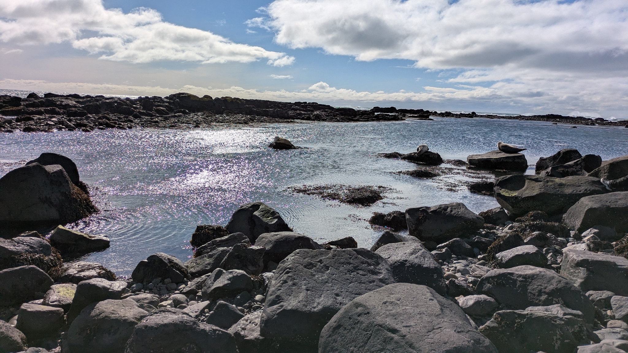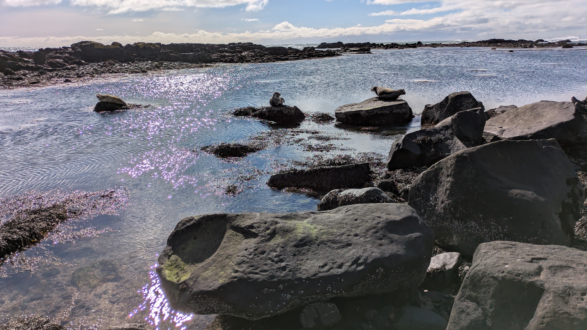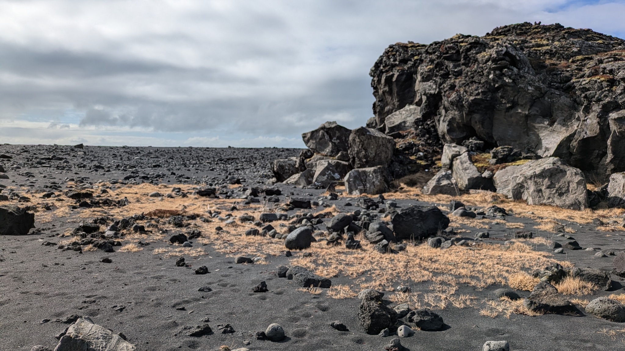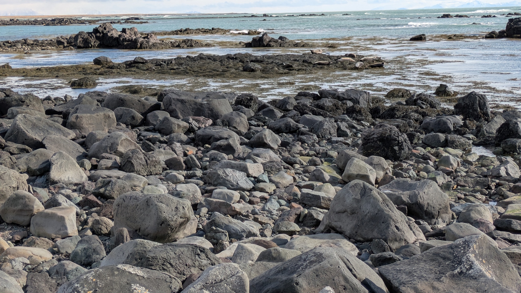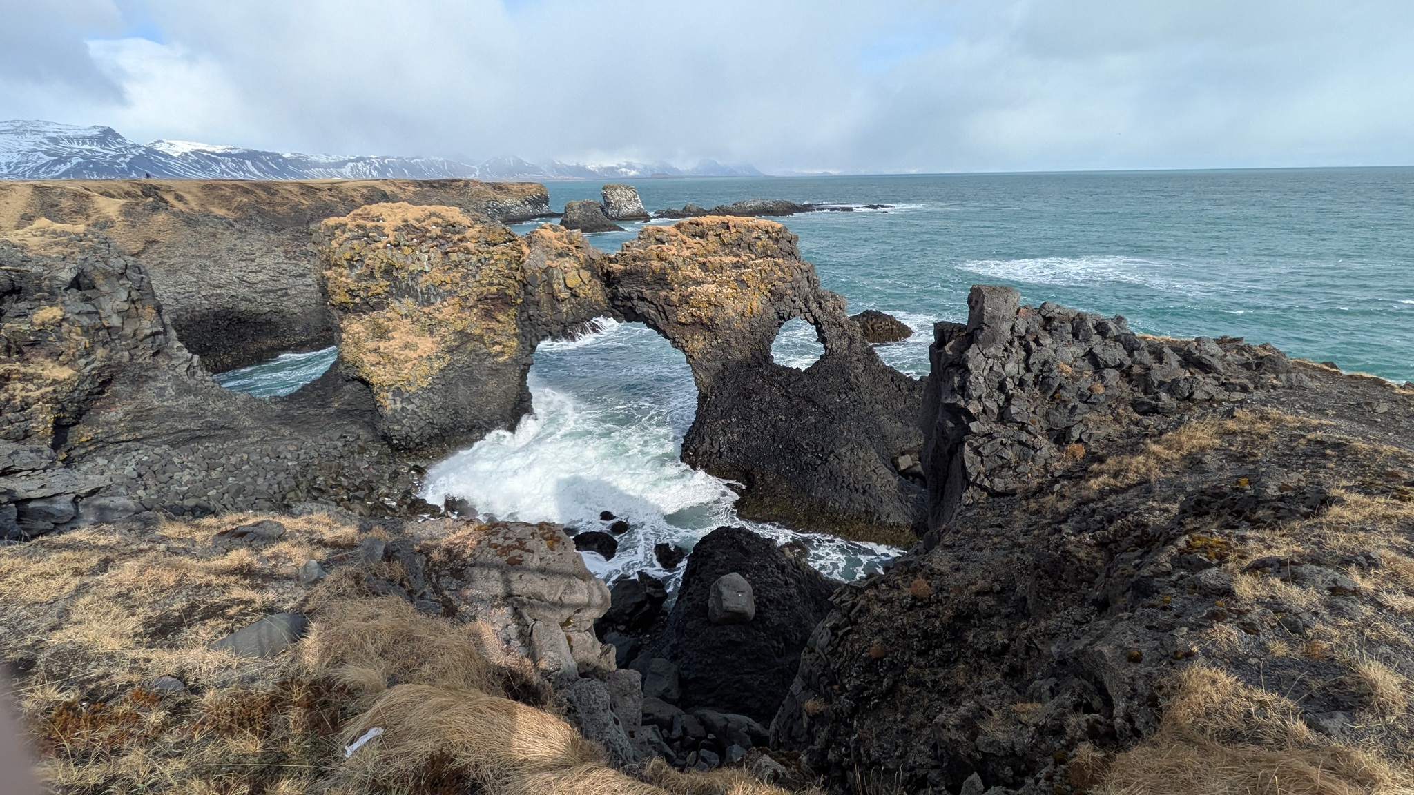 Die Geburtstagstour startete bei ansprechendem Wetterchen auf die Halbinsel Snæfellsnes und hatte Tanken und Einkaufen als ersten Punkt. Nächster Halt an den Basaltsäulen von Gerðuberg. Weiter ging es bis Ytri Tunga, ein Küstenabschnitt mit schroffem, schwarzen Lavagestein, auf dem sich eine Kolonie Seehunde räkelte. Hier musste ich ganz schön durch das Lavagestein kraxeln, um an die Tiere heranzukommen, was ich aber allemal gelohnt hat. Beim zweiten Stopp an einer extrem schmalen Schlucht bin ich jedoch trotz Spikes unter den Schuhen umgekehrt, das war mir zu rutschig. Schöne Ausblicke auf die Basaltküste mit Felsenbögen und den ersten brütenden Vögeln gab es am nächsten Aussichtspunkt, dann noch zwei malerische Felsnadeln, alles schon im Nationalpark gelegen. Die Straße führt hier im Halbkreis immer zwischen Küste und dem namensgebenden Berg hindurch, rechts und links liegen die Lavafelder, erkaltet und leicht bewachsen. Am späten Nachmittag war es dann am Campingplatz auch genug. Der städtische Platz ist günstig - vor allem wieder einmal mit dem Seniorenpreis - und bietet Blicke auf Meer und Berge.