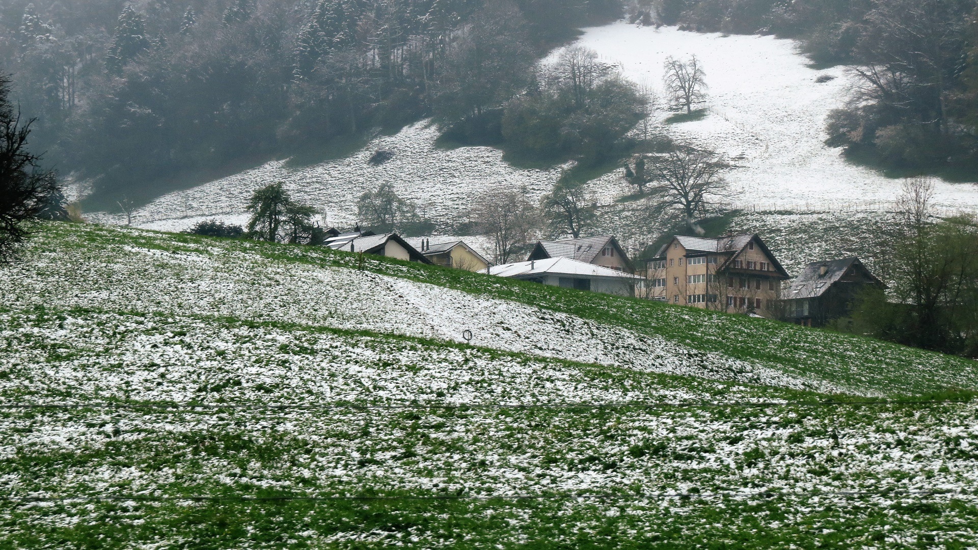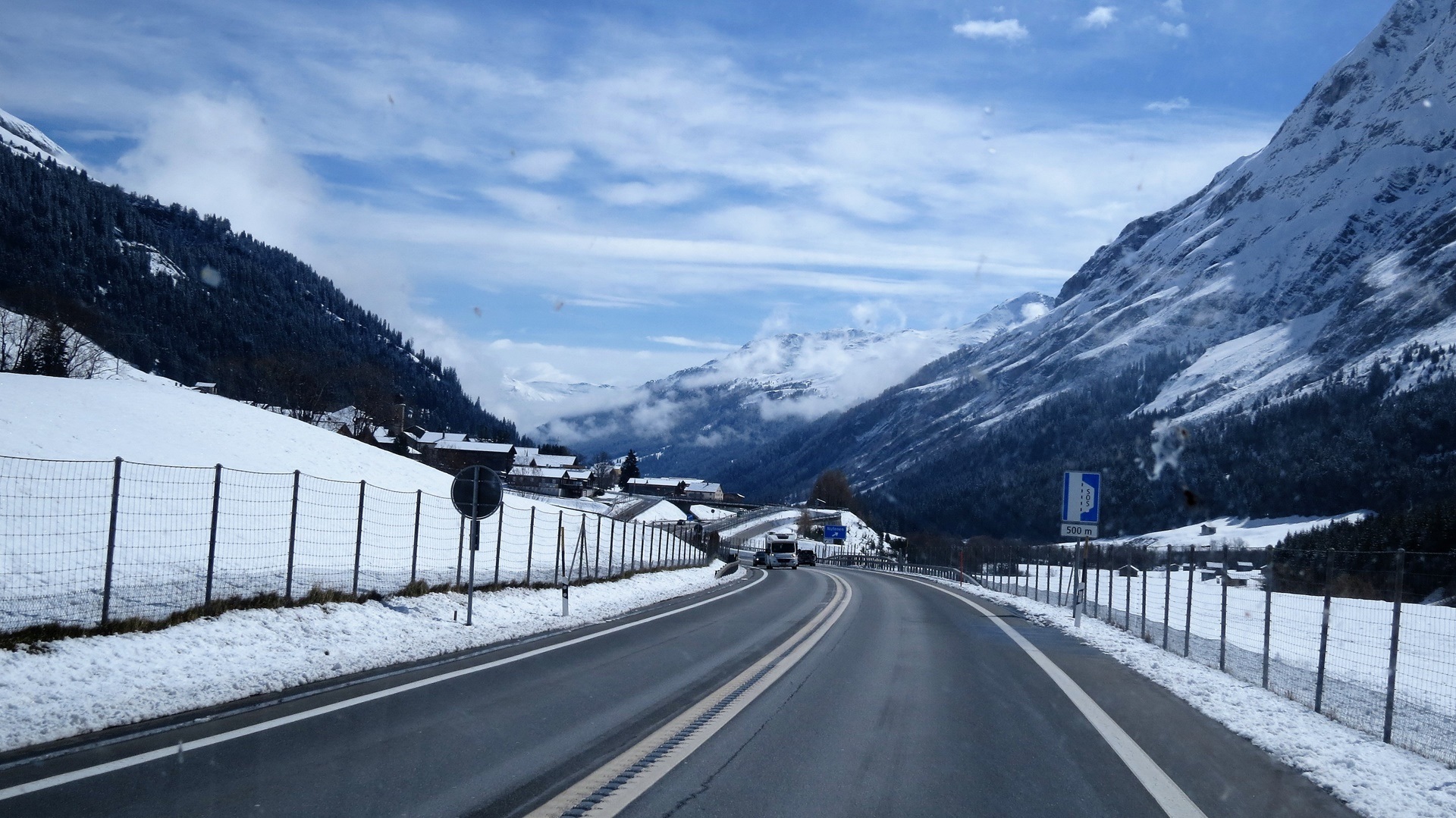 Hinterm San-Bernardino-Tunnel Winterlandschaft bis ins Tal. Pass auf 1.640 m, schlechtes Wetter, Starkregen in Deutschland. In Weimar auf dem altstadtnahen Bezahlstellplatz.