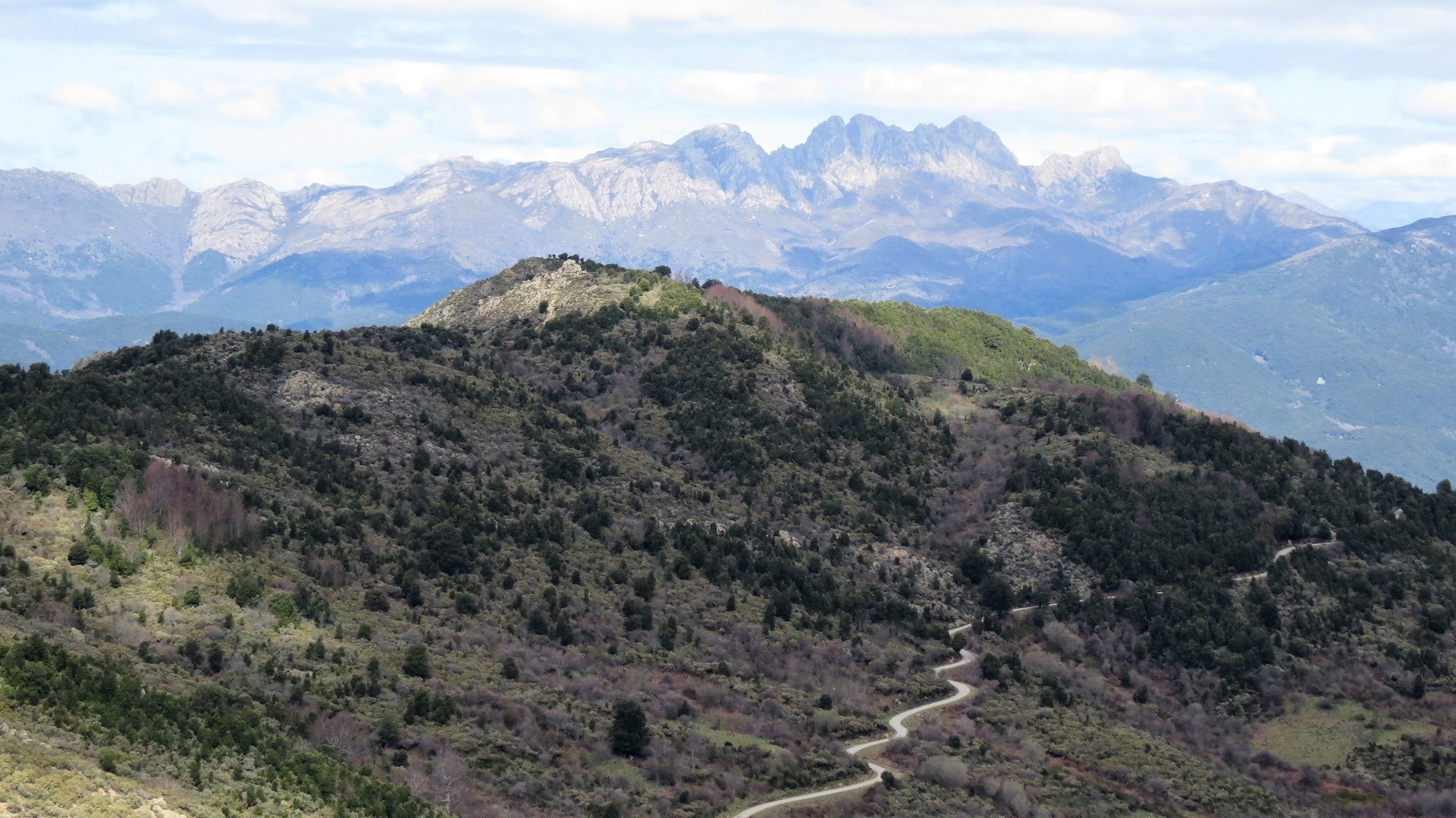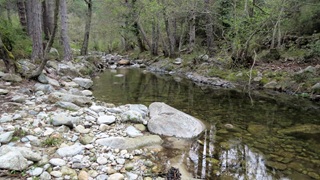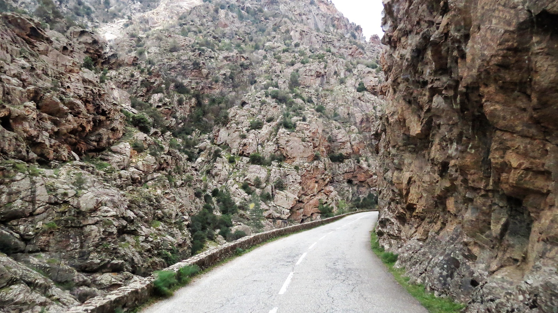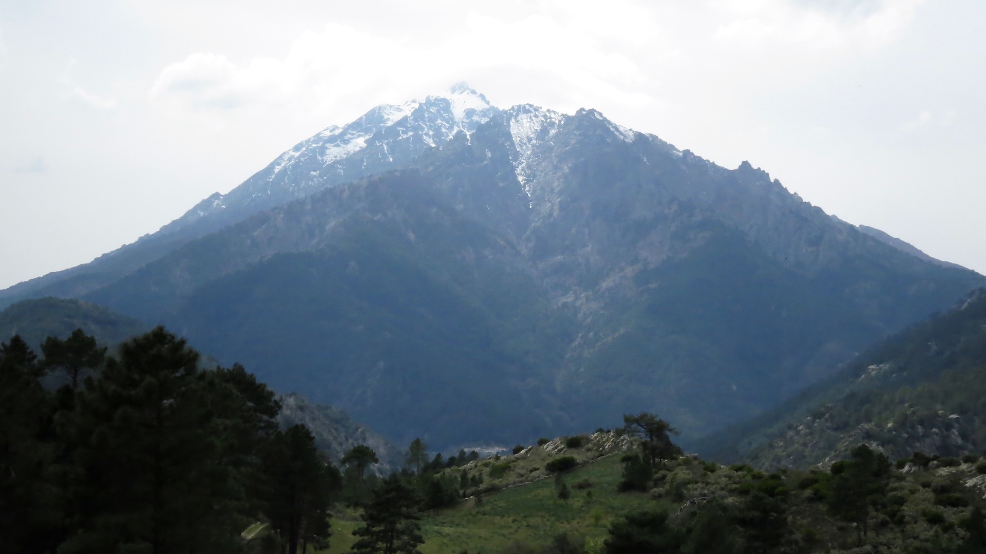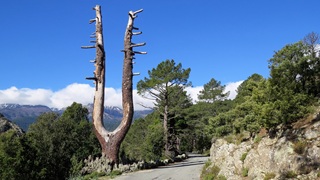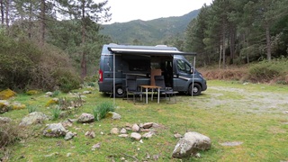 Als der Kletterwald-Parkplatz sich "füllte" (4 Autos) war es Zeit, zu gehen. Auf der Umwegstrecke zur Cascade du Voile de la Mariée lagen Schweine auf der Straße, wie im Womo-Reiseführer vorausgesagt. Der 10-Minuten-Fußweg steil bergan zur Brautschleier-Kaskade ist sehr lohnend, der höchste korsische Wasserfall entschädigt für die kleine Strapaze. Die Fahrt durchs Bergdorf Bocognano führte uns am "Stereobrunnen" für unseren Wasservorrat vorbei schließlich nach Corte. Kurzes Schläfchen und dann zur Zitadelle und ins Museu di a Corsica. Schöne Blicke auf Täler und Berge, engagierte Ausstellung korsischen Lebens in sehenswertem Gebäude. Abstecher nach Nordosten auf Schlafplatzsuche, aber alles sehr eng auf schmalsten Straßen, Rückbesinnung auf die Qualitäten des Womo-Reiseführers: Fahrt Richtung Porto bis an den Calacuccia-Stausee durch die Scala di Santa Regina. Spektakuläre Schlucht aus Steinen, nicht für jedes Womo tauglich! Am See dann Stellplatz 121 mit Blick auf die zum Teil schneebedeckten Zweitausender.