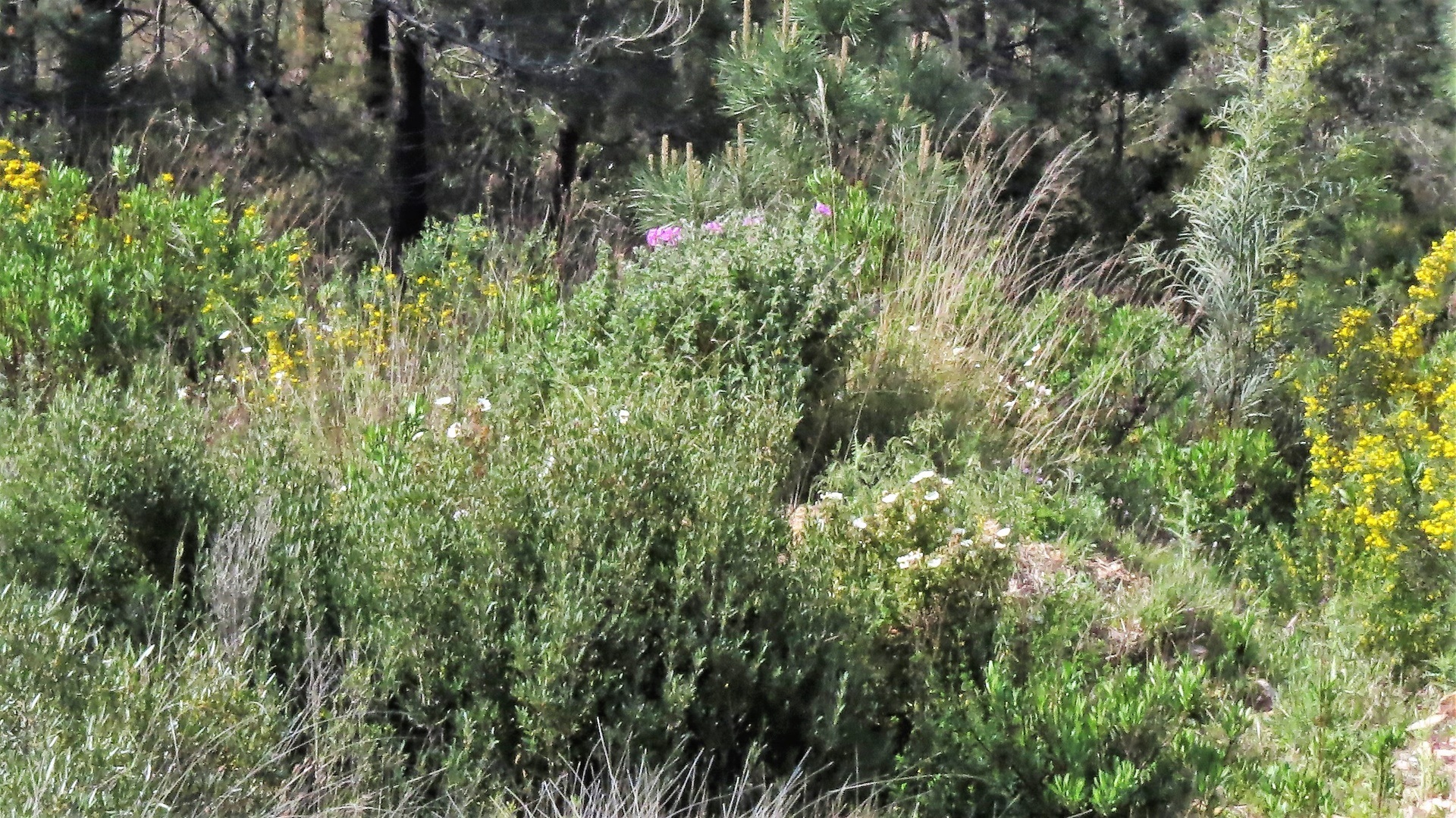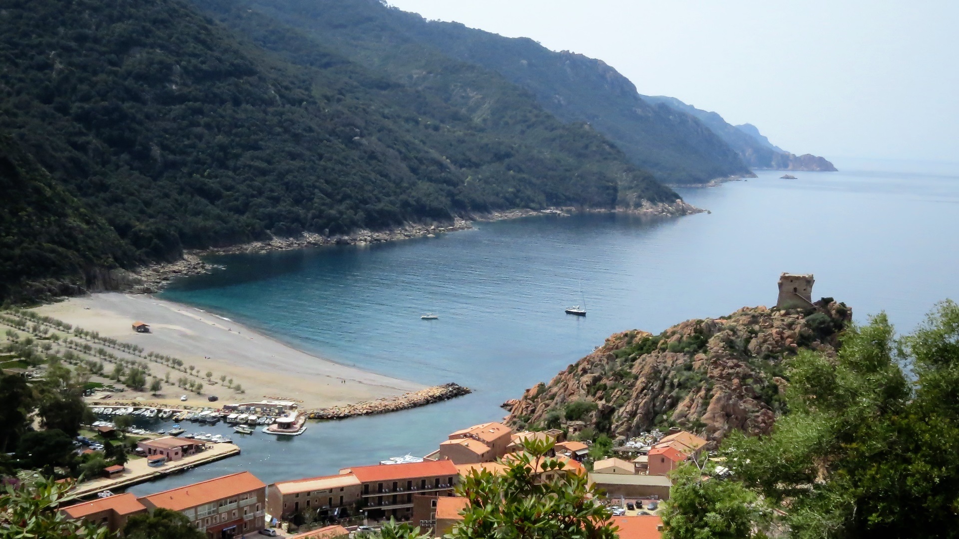 Erster Gang in die Apotheke: Brandsalbe für Ms Gesicht, ebenso Hut, noch mit Kordel nachgerüstet. Zügig auf T-Straßen (früher waren das N-Straßen) nach Ajaccio. Erstmal Mittagschlaf am Strandparkplatz. Die Stadt erschien uns unruhig, gute Parkmöglichkeiten ergaben sich nicht, so sind wir nach Carrefour (extrem leckere korsische Sachen) in die Berge Richtung Corte. Womo-Platz 106 am Bahnhof verworfen, aber 108 am Kletterwald auf dem Abstecher D4 war dann mit Ausblick und Vogelzwitschern die Entschädigung. Alle Leckereien, die wir zwischenzeitlich erstanden haben, verkostet.