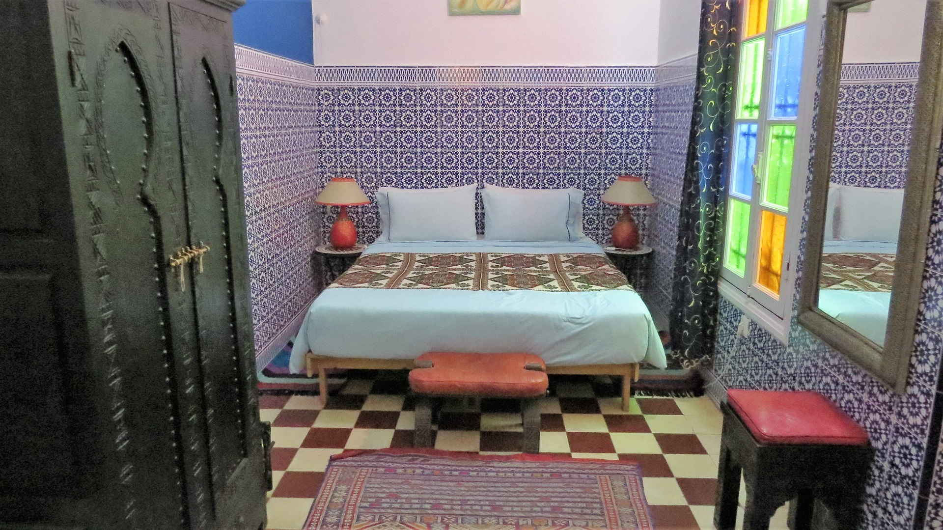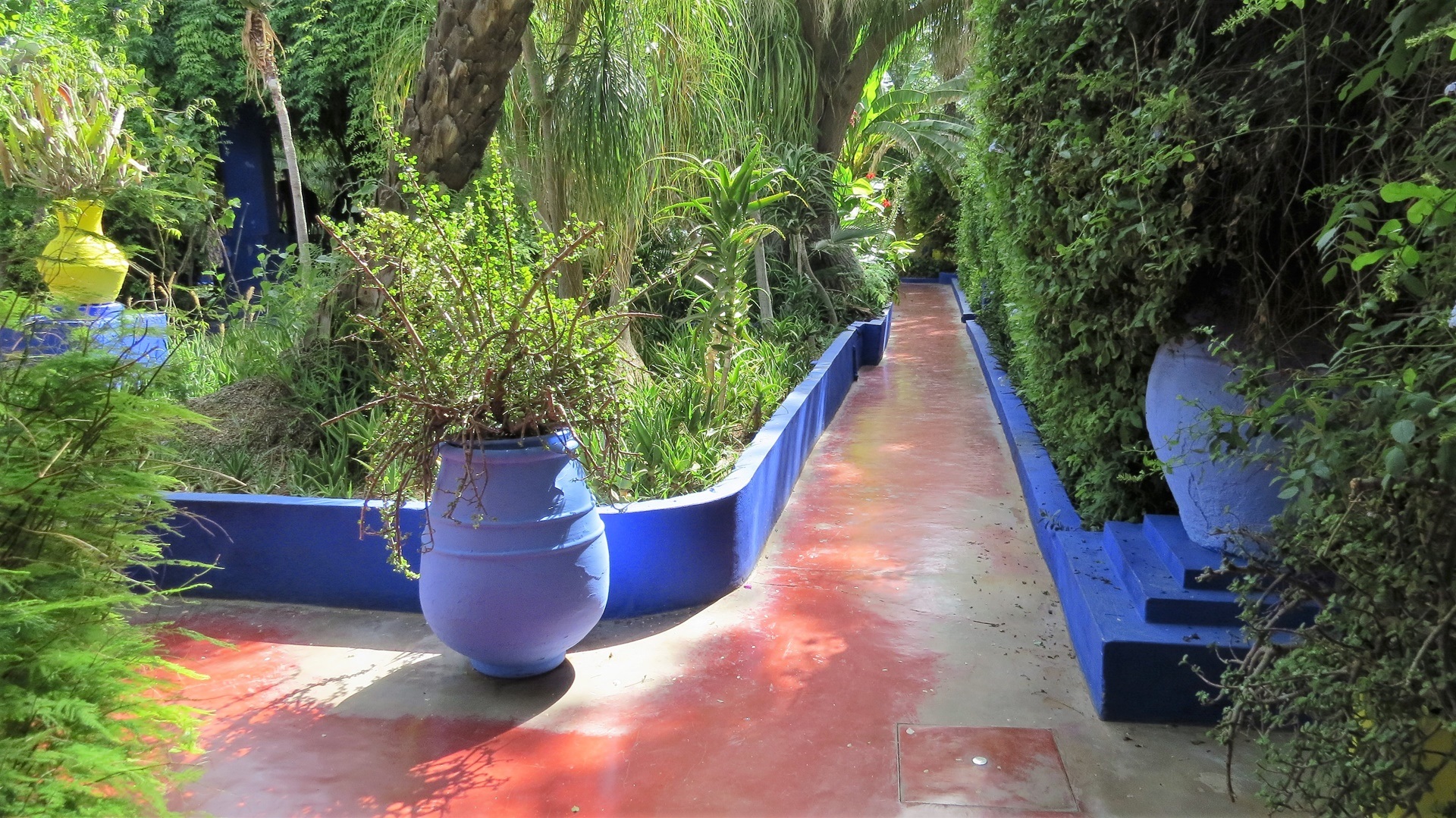 Umzug (ganz nah, zu Fuß mit Reisetasche) vom Stellplatz in das Riad. AC genossen. Mit dem Taxi (Wucherpreis) zum Jardin Majorelle, das Majorelle-Blau und die Ruhe und Kühle des Gartens genießen. Spaziergang durch die Neustadt unspektakulär einschl. Einkaufszentrum. Abends Essen im nahegelegenen Café Yassine, dann Bier trinken auf der eigenen Dachterrasse.