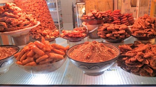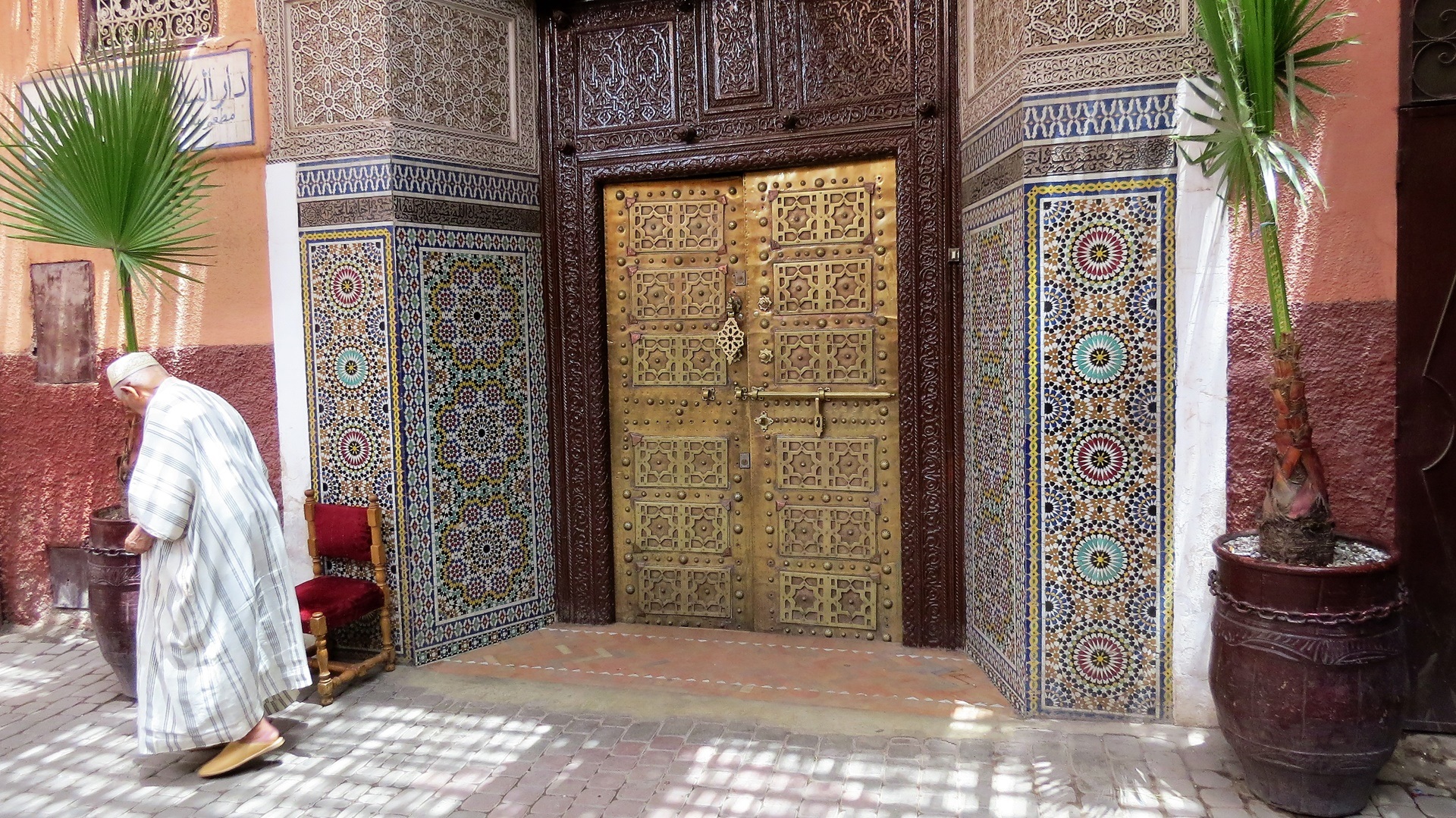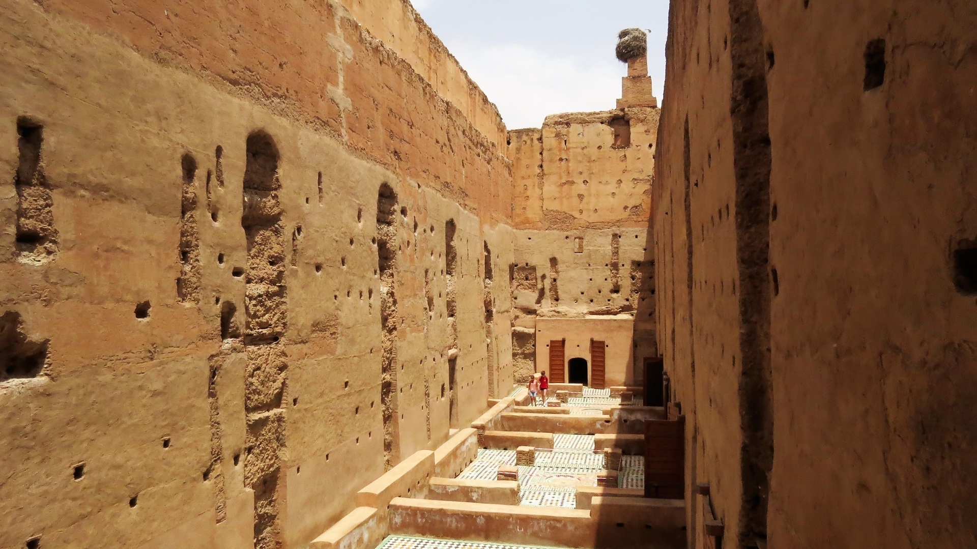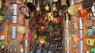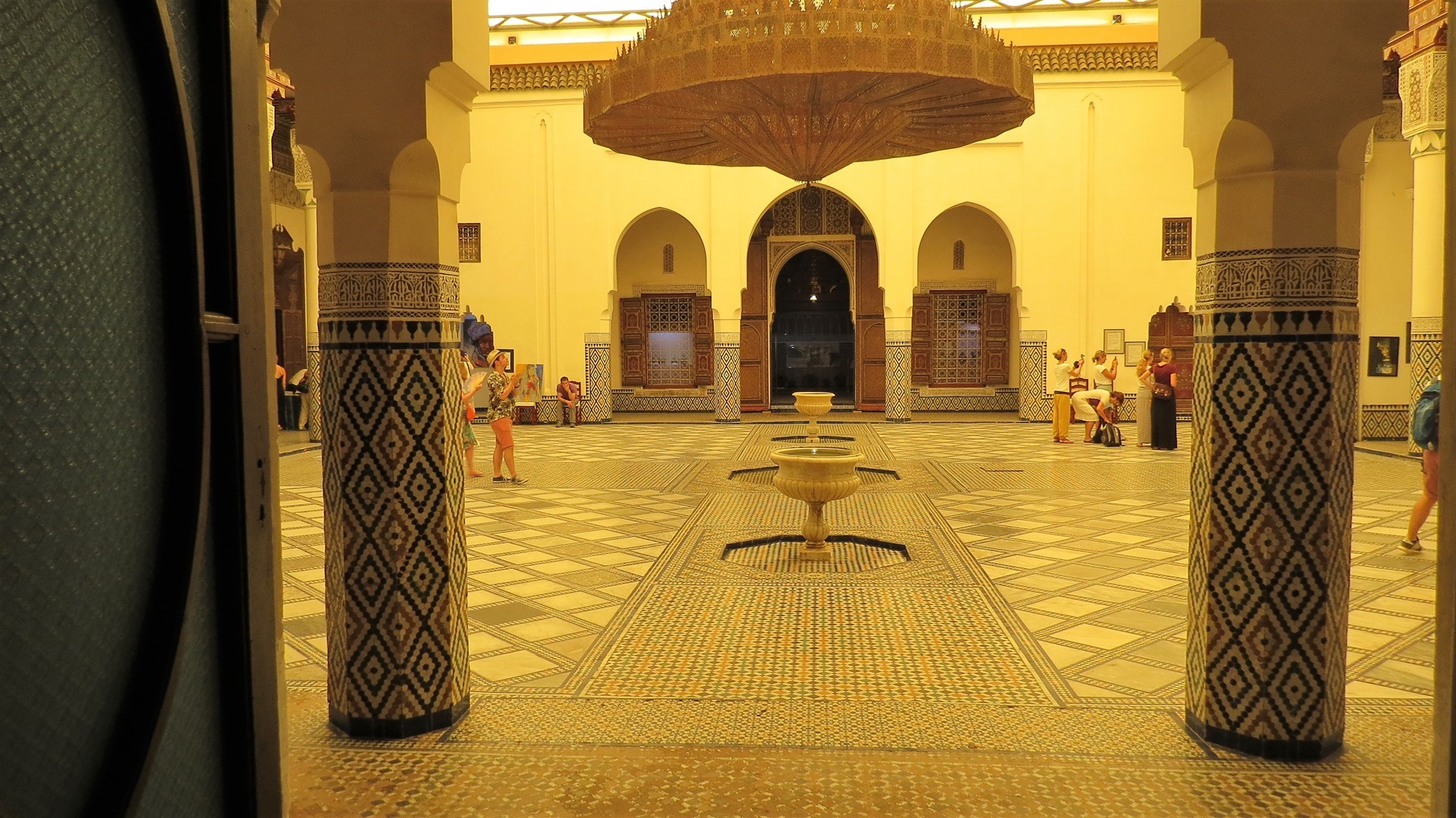 Nach spätem Frühstück ins Museum für Weberei und Teppiche Dar Si Said in beeindruckendem Palast. Weiter durch die unerwartet ruhige Medina zum Al-Badi-Palast, dem "Unvergleichlichen". Nun wissen wir, was es bedeutet, ein Gebäude zu "ruinieren". Im Kasbah-Viertel eisessend die Kasbah-Moschee von außen betrachtet. "Complexe d'Artisanal" mit riesigem Warendurcheinander zu Festpreisen besucht. Abends im Kui-Zin die bisher besten Tajines gegessen, Huhn mit Ingwer, Lamm mit Trockenobst. Drei Musiker mit netter Live-Musik. Abschluss: Bier auf Dachterrasse.