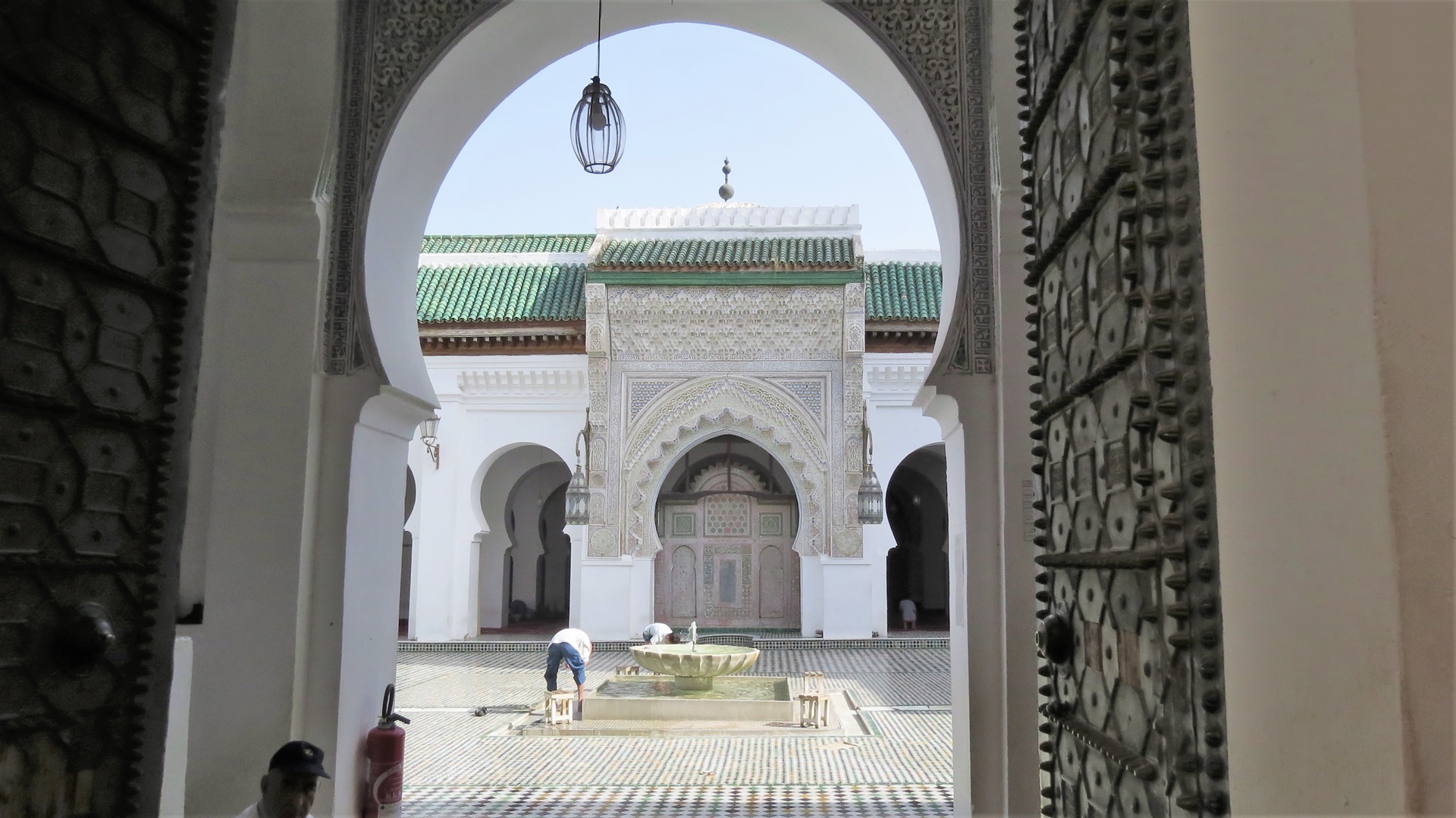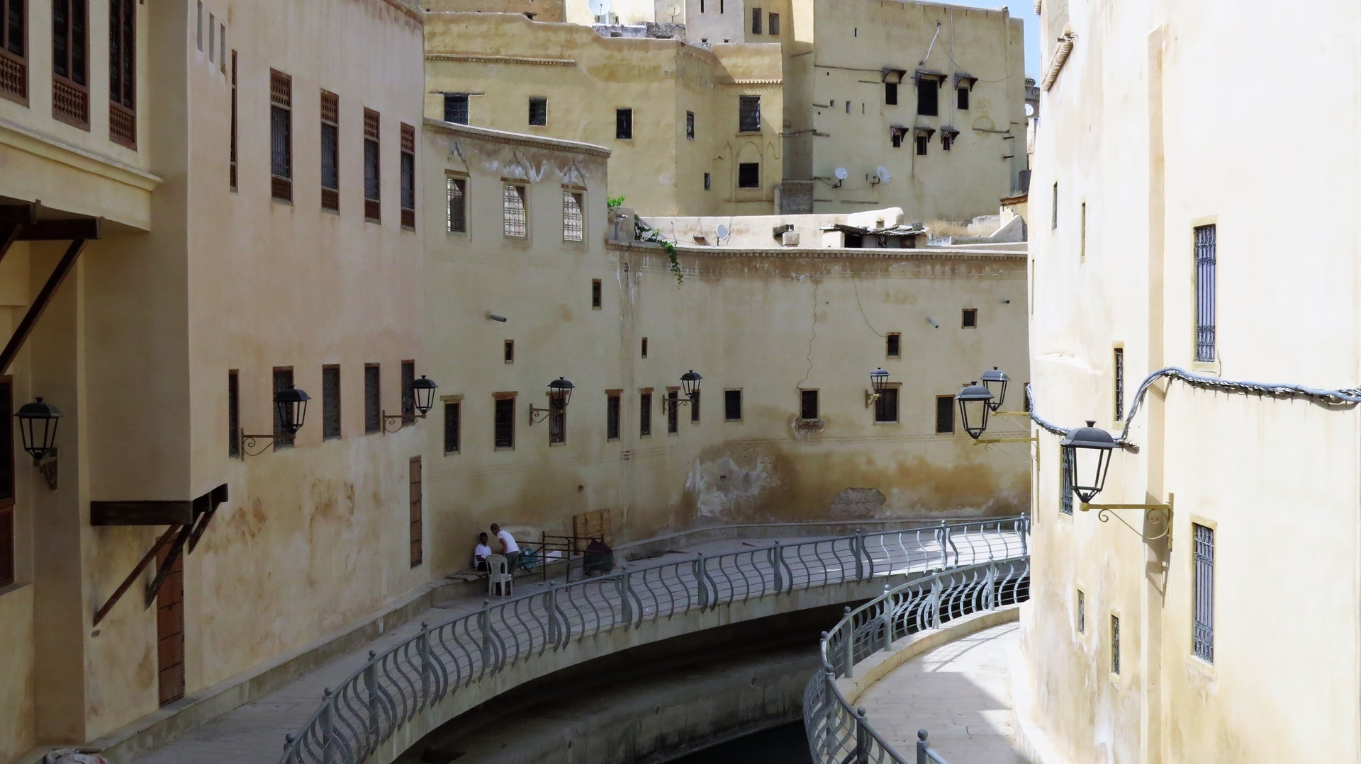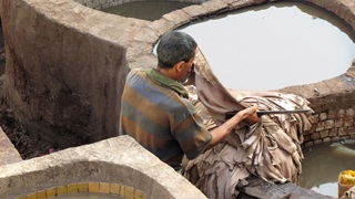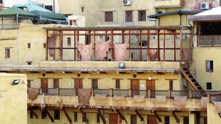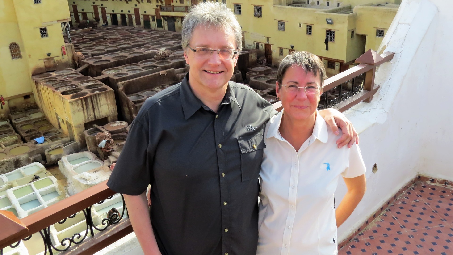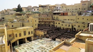 Vormittags Reiseroute veröffentlicht, Maniküre. Nachmittags zum Bab R'cif. Färberviertel mit Hosenbeine hochkrempeln (!), Place Serrafine (Platz der Kupferschmiede), einmal um die große Moschee herum mit Einblicken durch geöffnete Türen. Dann ins Gerberviertel. Von einem Guide zu einer Terrasse der Lederwarenhändler leiten lassen. Dort führte uns der Händler auf seine Terrasse und wir konnten von oben die Gerbereien sehen. Sachkundige Erklärungen auf Deutsch, viele Fotos, Trinkgeld. Anschließend mit dem Taxi Richtung jüngerer Altstadt Fès Djdid ("Neu-Fès") zum Café Mezzanine. Bier (!) und marokkanische Tapas auf der Dachterrasse, viele junge Frauen, meist ohne Kopftuch. Weiter durchs jüdische Viertel Mellah hinaus aus der Altstadt, mit dem Taxi zurück. Marokkanischen Wein durch die VW-Camper besorgen lassen, wir konnten im Riesen-Carrefour nicht parken.