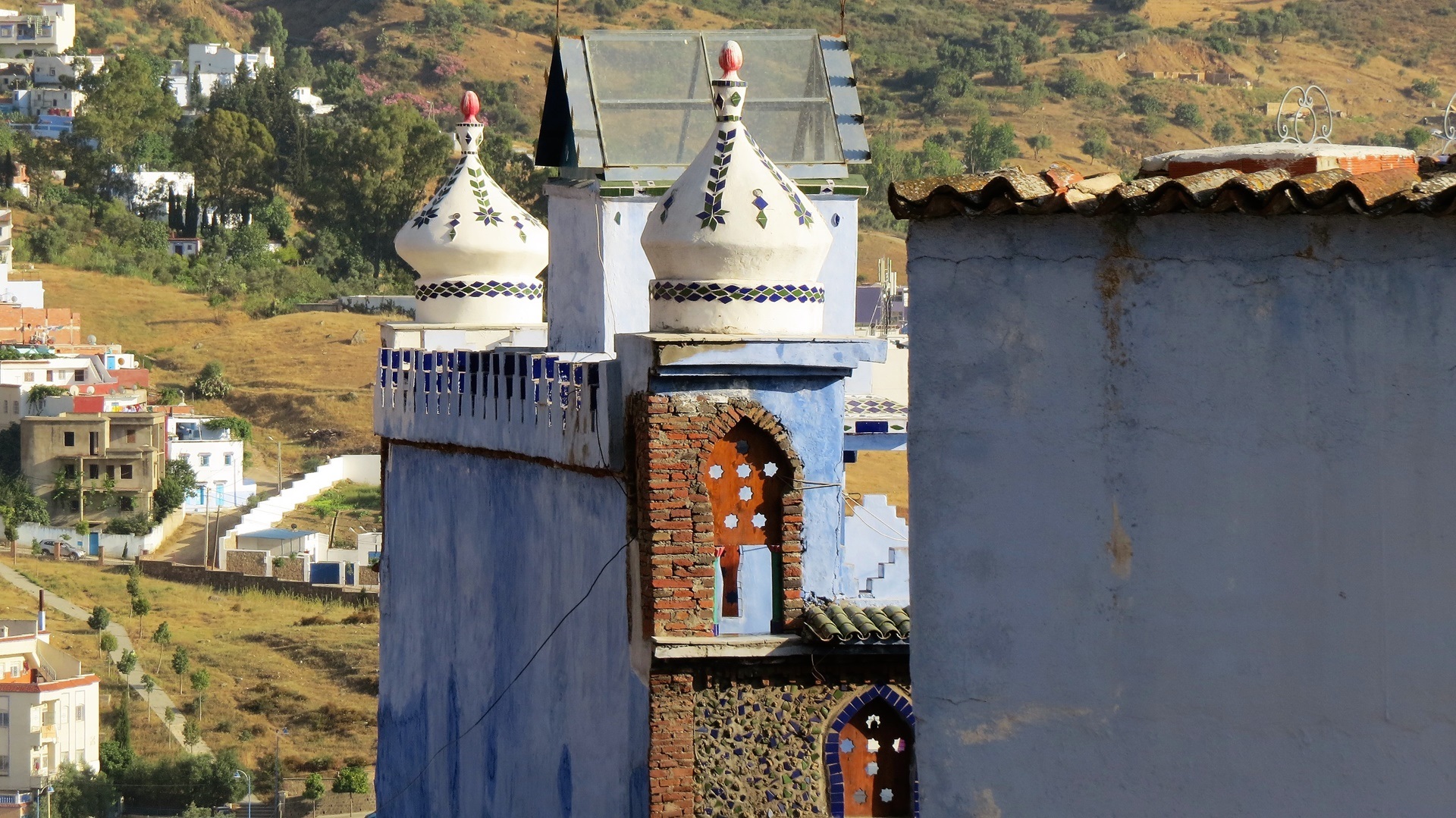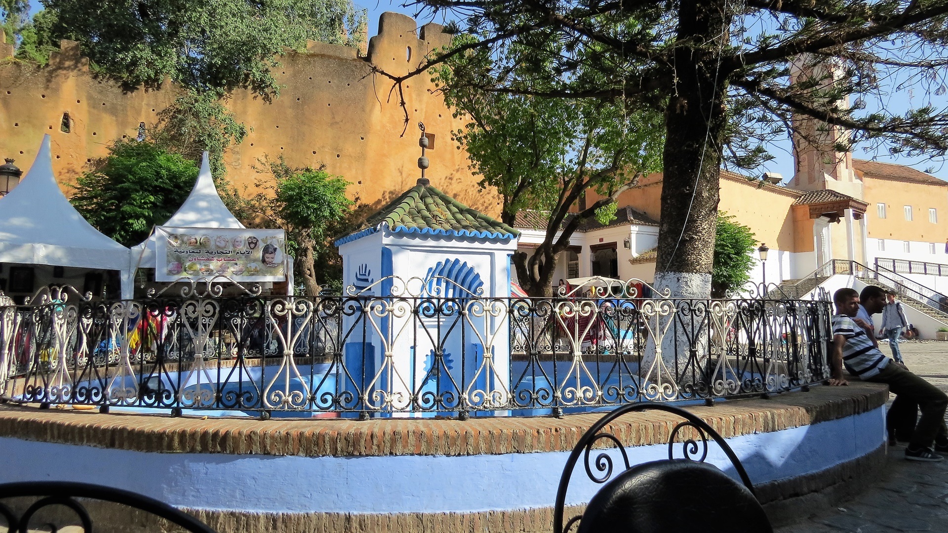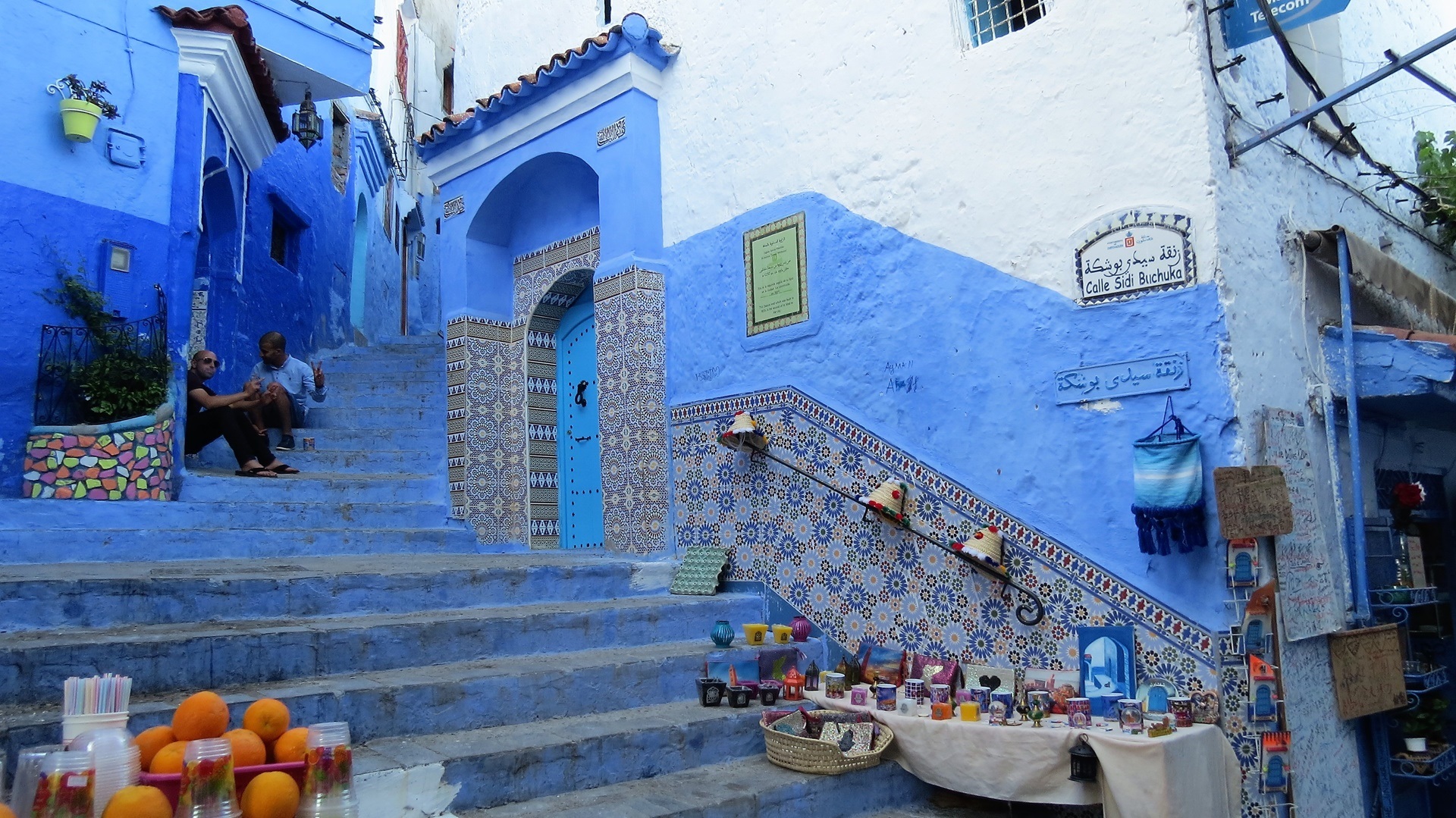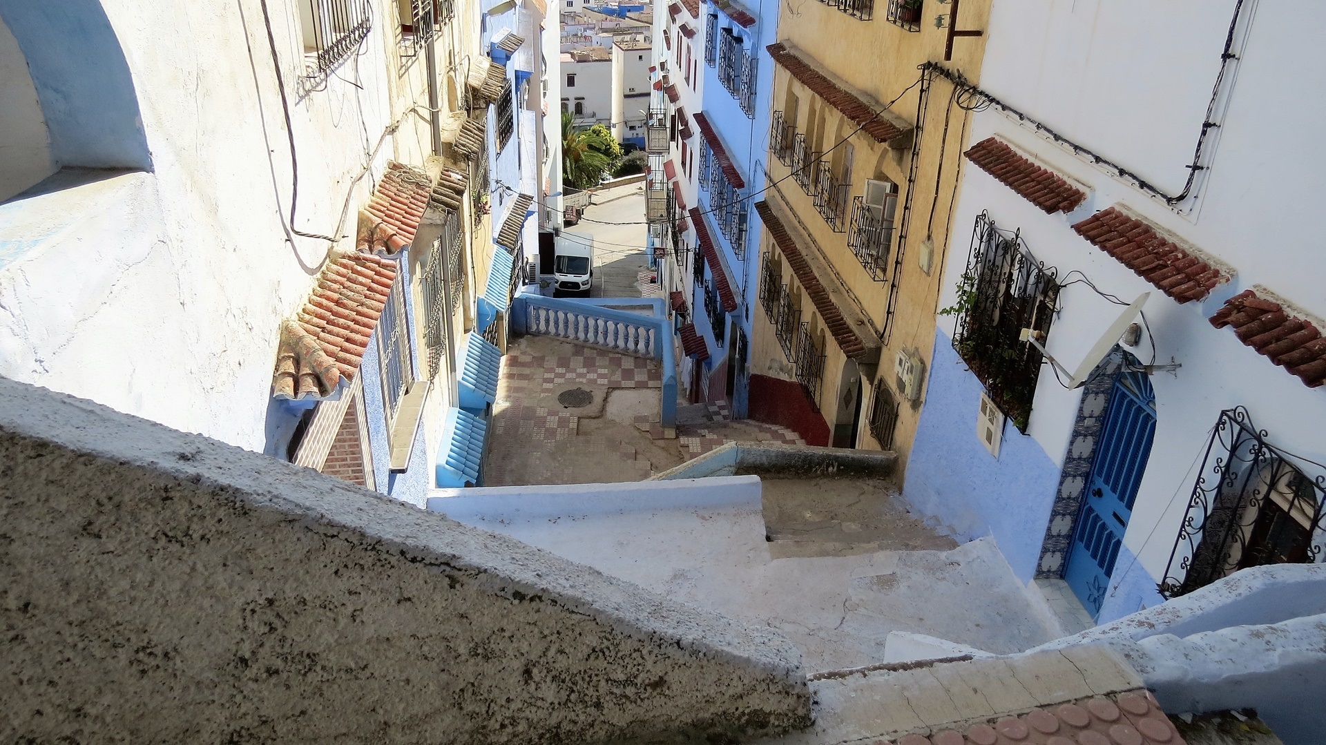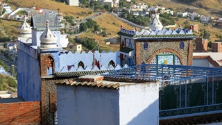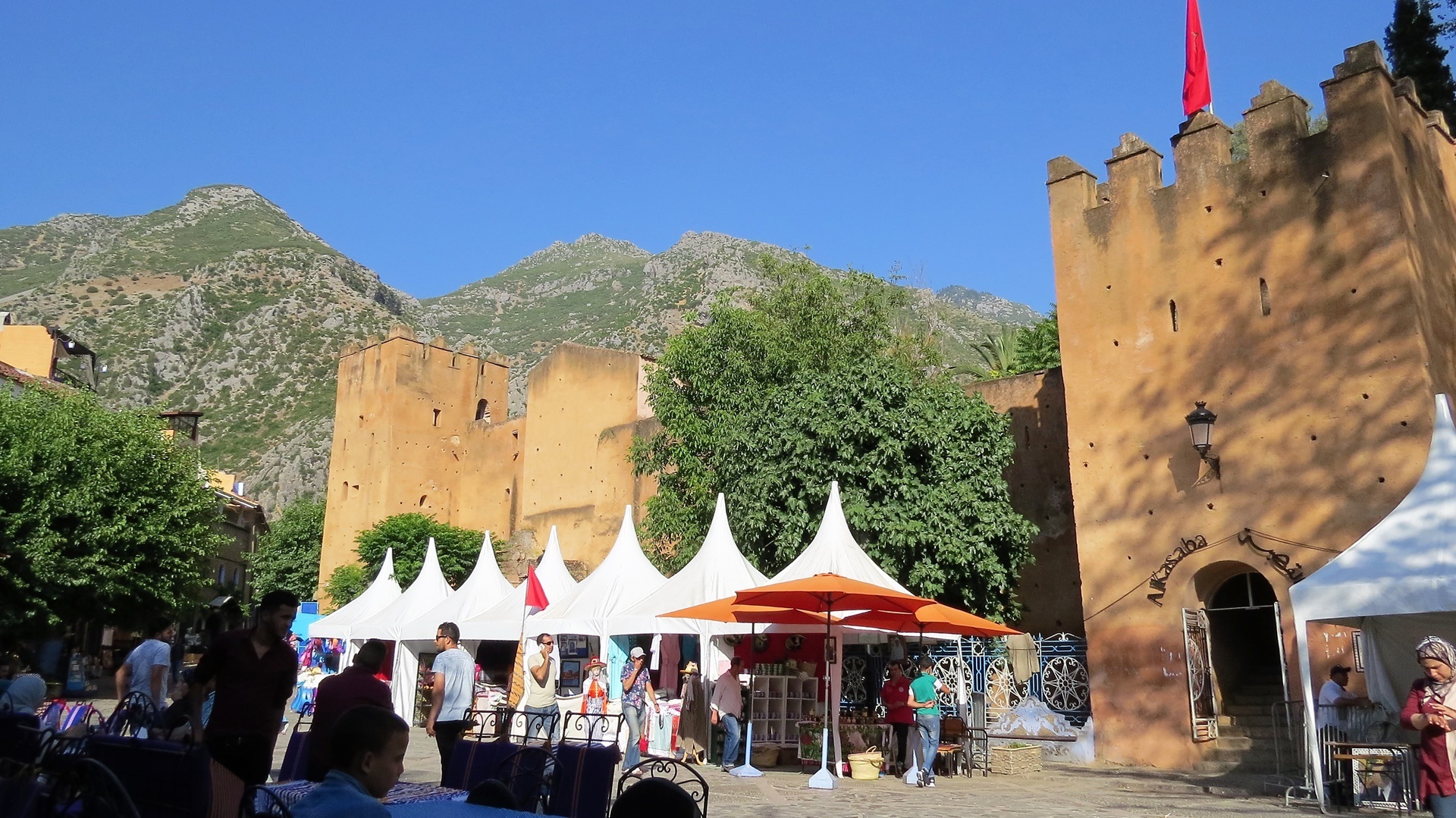 Morgens Strandspaziergang, Füße im Mittelmeer. Herrlich Fahrt durch die Berge zum Camping Azilan, Platz mit Blick in Tal. Zu Fuß in die Medina, Kaffee und Tee vor der Kasbah, selbige besichtigt. Garten im Innenhof, vom Turm aus Blick in die blau gestrichene Altstadt. SIM-Karten von Telecom Maroc besorgt und einrichten lassen sowie durch die Souks treiben lassen. Abends am Platz vor der Kasbah zwei harmlose Tajines gegessen und mit dem Taxi zum Campingplatz zurück.