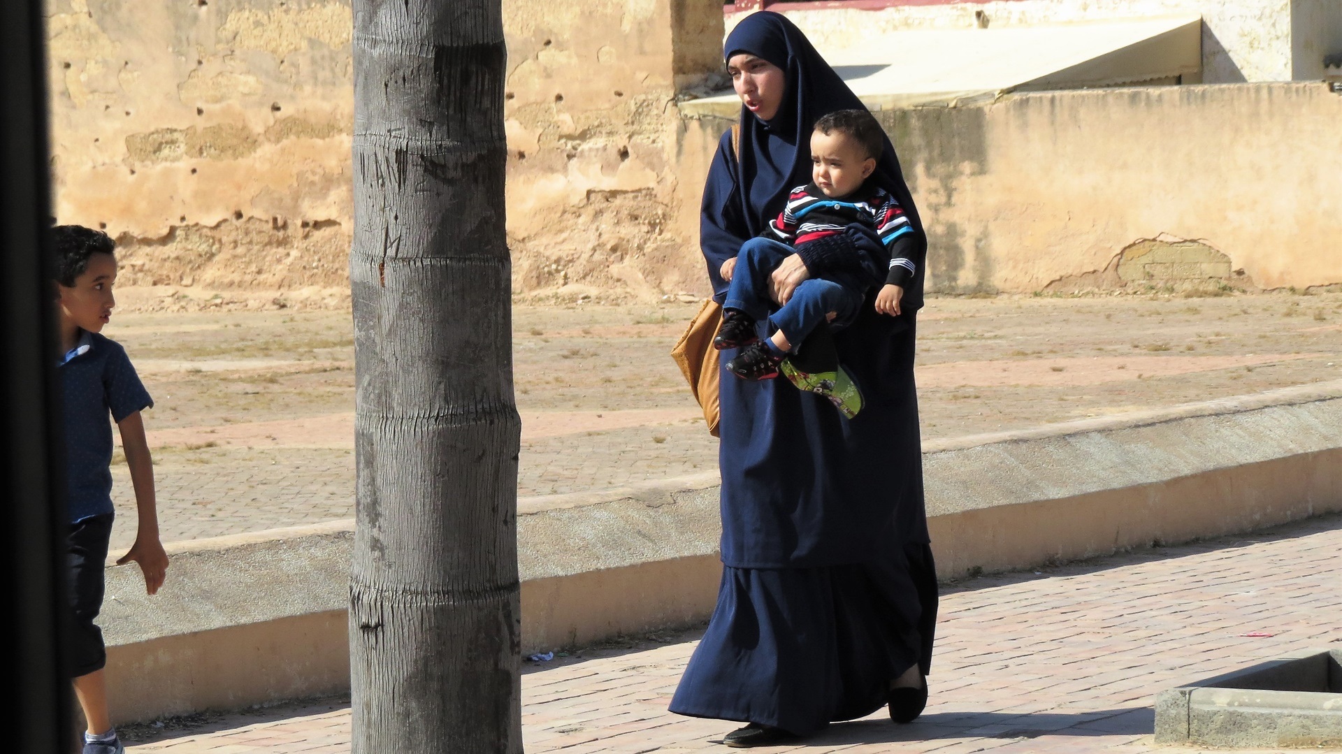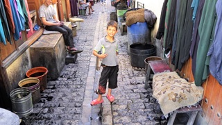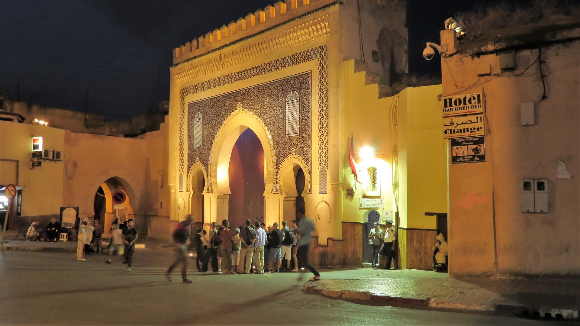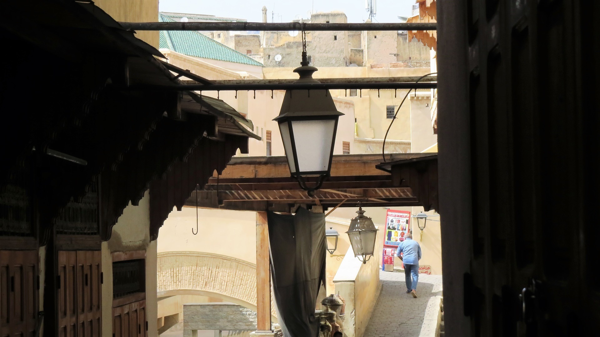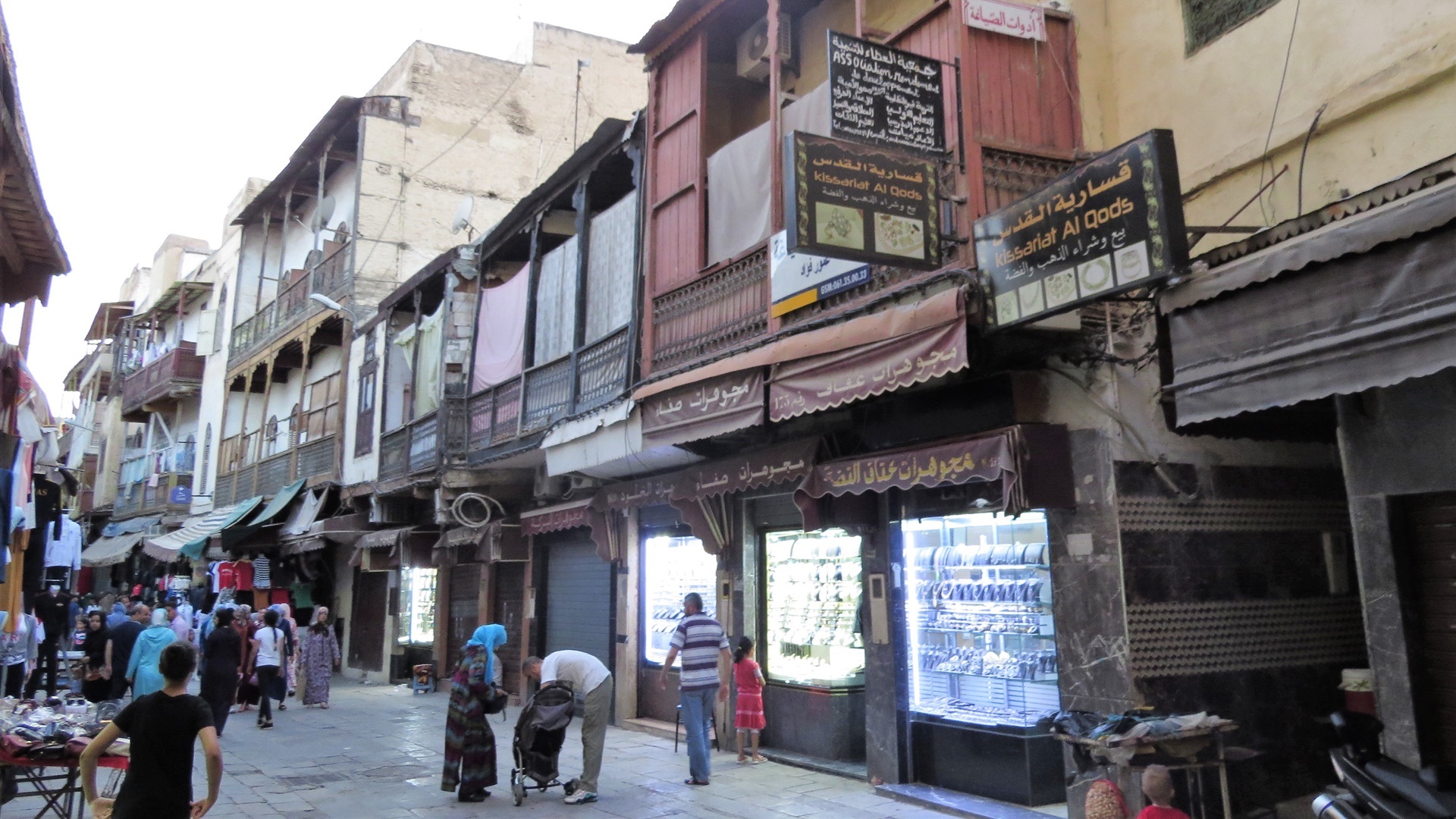Auf der Strecke nach Fès wurde das Stroh eingeholt: riesige Strohberge, überladene Fahrzeuge. Altstadtumfahrung mit Blicken in die Medina Fès al Bali ("Alt-Fès"). Campingplatz Diamant Vert etwas außerhalb mit Kinderbelustigungsbad und nettem spanisch-argentinischem Pärchen im VW-Bus. Abends zu viert im Taxi zum Bab Boujeloud, erster Rundgang durch die Altstadt: Schon die Hauptwege sind sehr schmal, über und über mit Waren angehäuft. Zur Zouia-Moschee geleitet worden (Trinkgeld), dadurch ein paar Einblicke gewonnen. Vom Rückweg über das Bab Guissa Abstand genommen, da er durch winzige tunnelartige dunkle Gassen führte. Mit dem Taxi - fuhr wie ein Irrer - zurück.
