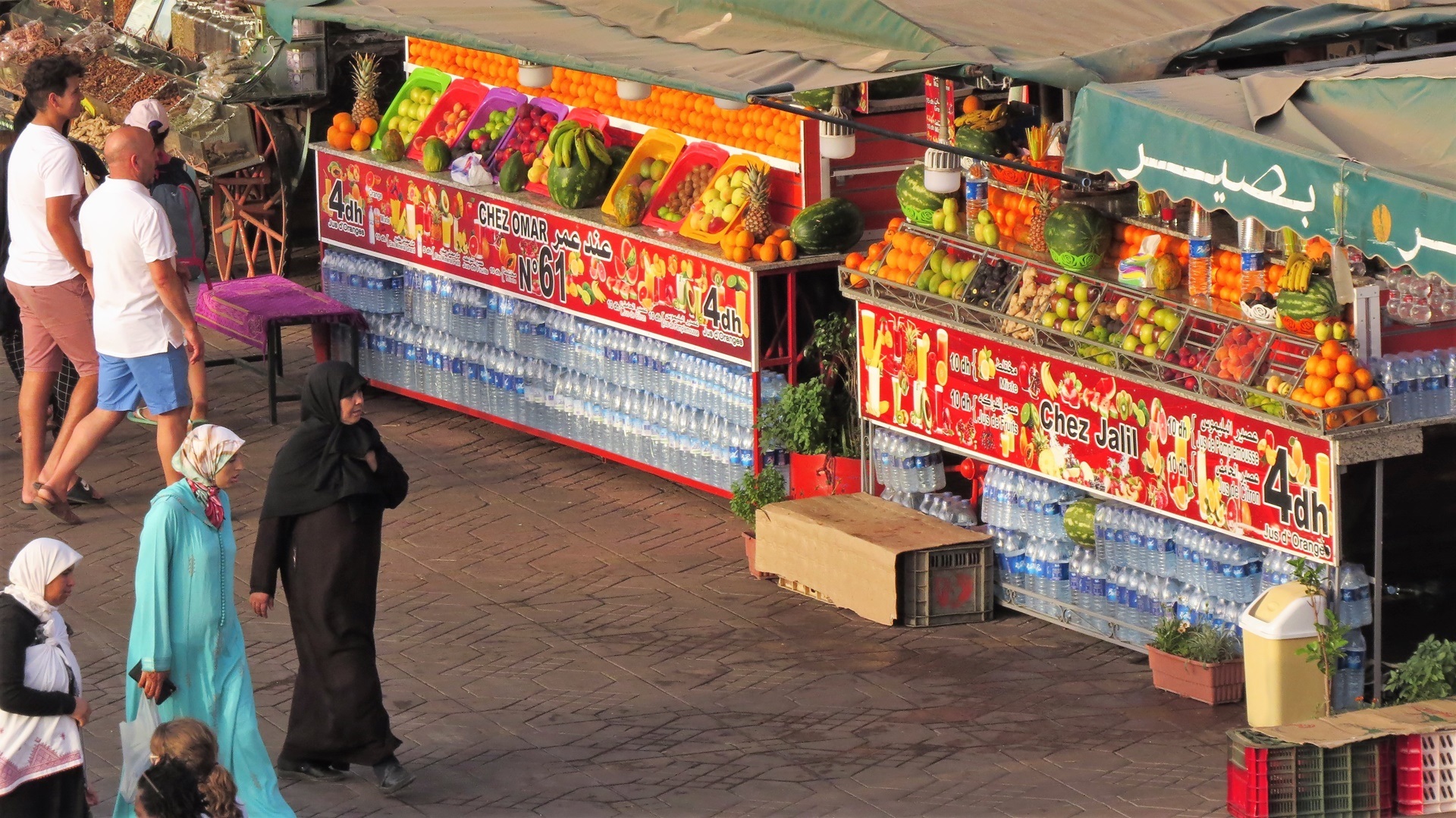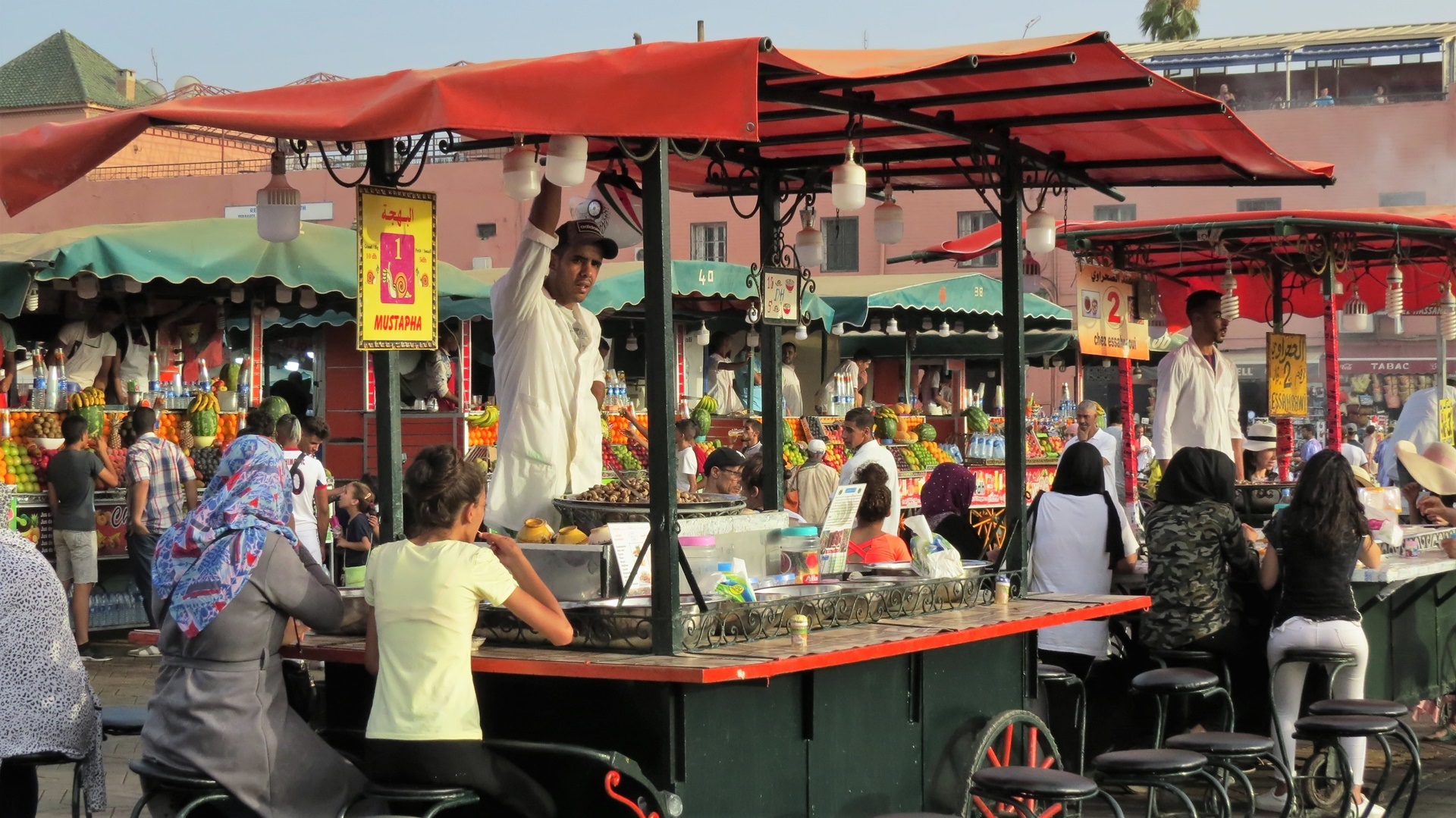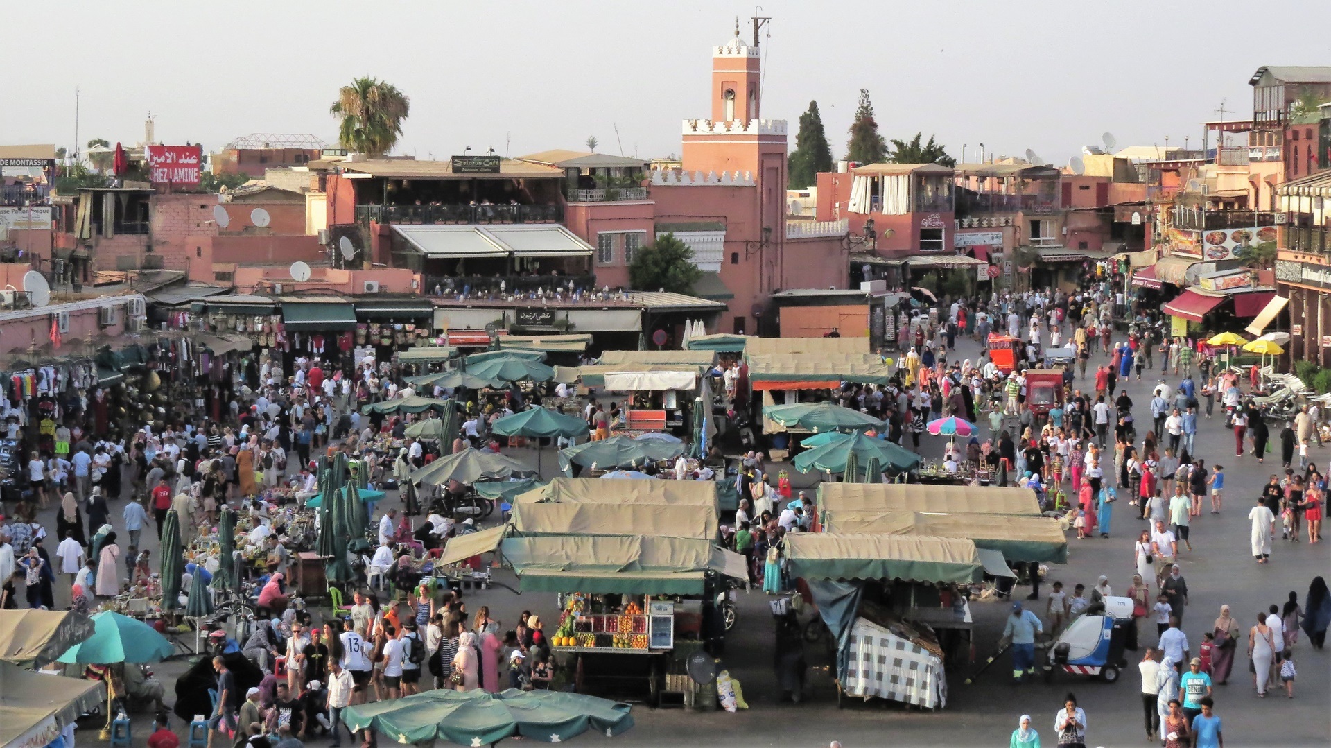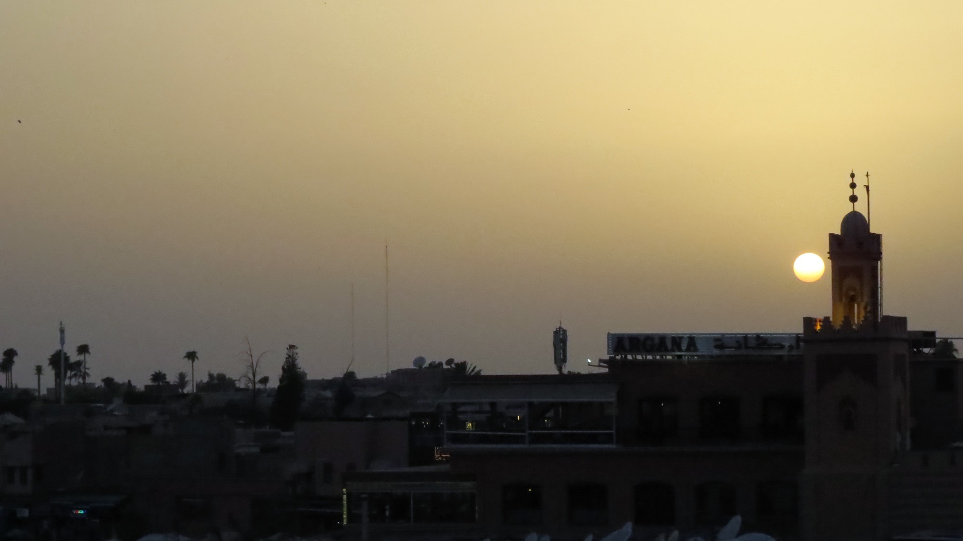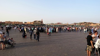 Morgens ausgiebig den Ksar Ait Ben Haddou besichtigt. Auf der schönen Nebenstrecke am Oued Ounila entlang zum Tizi n'Tichka (Pass 2.260m) gefahren. Dann 20 km Schotterstrecke. Weiter auf der N9 durch den Hohen Atlas: Südseite Steinwüste, Nordseite fruchtbar. Und dann: Marrakesch! Auf dem Weg zum Stellplatz neben der großen Koutoubia-Moschee durch die Medina mit dem Wohnmobil - Navi sei Dank! Für längeren Aufenthalt auf dem Stellplatz (eigentlich ein großer Parkplatz) zu heiß. Suche bei booking.com führte zum Riad Alamir, am Ende einer Sackgasse ohne jede ersichtliche Beschilderung. Von Sonntag bis Mittwoch gebucht. Erster Gang zum Djemma el Fna mit lecker Essen auf der Terrasse des Café Kessabine. Zum Abschluss quer über den Platz, Orangensaft getrunken, zurück zum Auto, Bier getrunken!