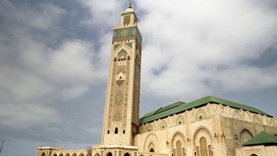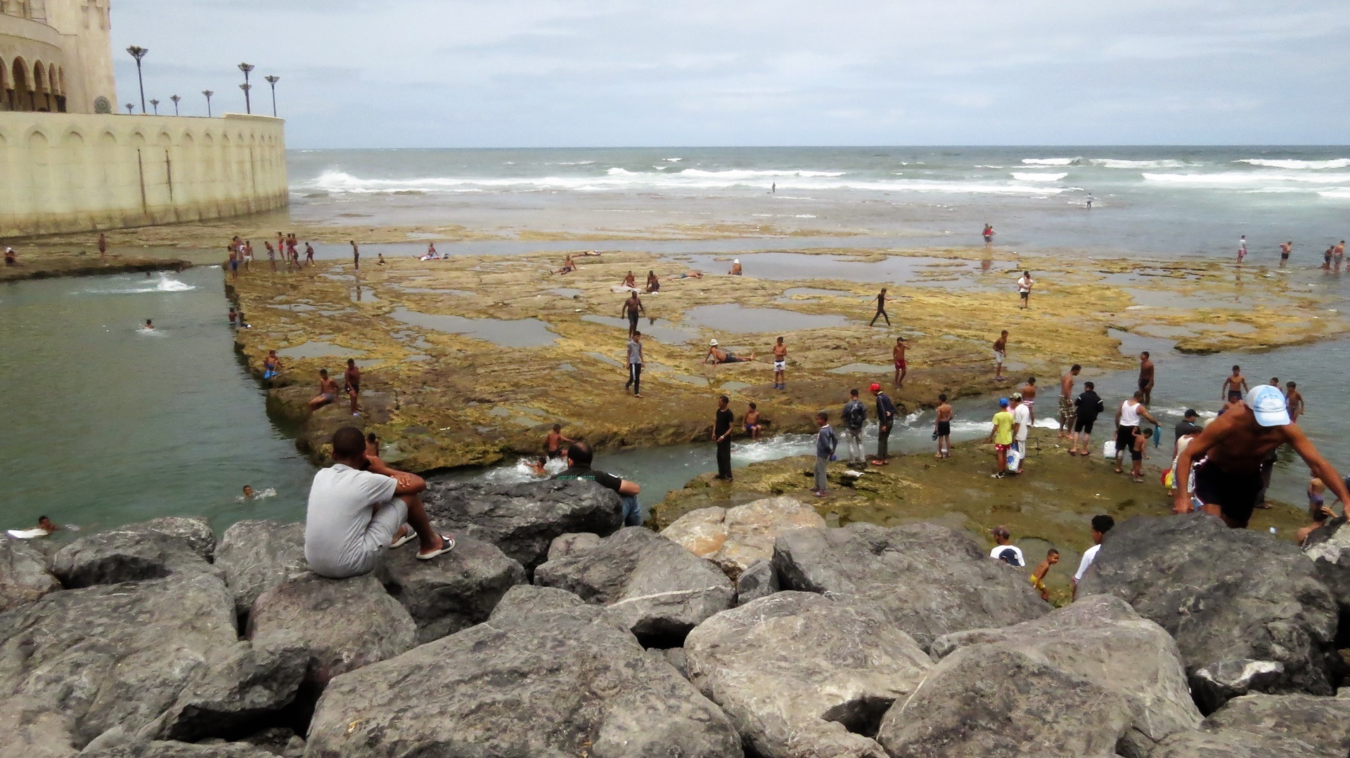 Auf der Autobahn bis Casablanca! Schlaglochfrei mit Tempo 120 bis zum Parkplatz direkt an der Hassan-II-Moschee, alles schön von außen angeguckt, auch vermüllte Meeresschwimmbecken nebenan. Moschee ganz prächtig und von gewaltigen Ausmaßen. Weiterfahr nach Norden - dummerweise nicht auf der Autobahn - quer durch Neubausiedlungen, Souks, vorbei an Slums und Holzofenfeuern. Angefahrenen Campingplatz zwischenzeitlich runtergekommen, zwischen Neubauten eingequetscht. Interessanter Riad-Bau einheimischer Familien auf dem Platz. Schöner Sonnenuntergang am Felsstrand.