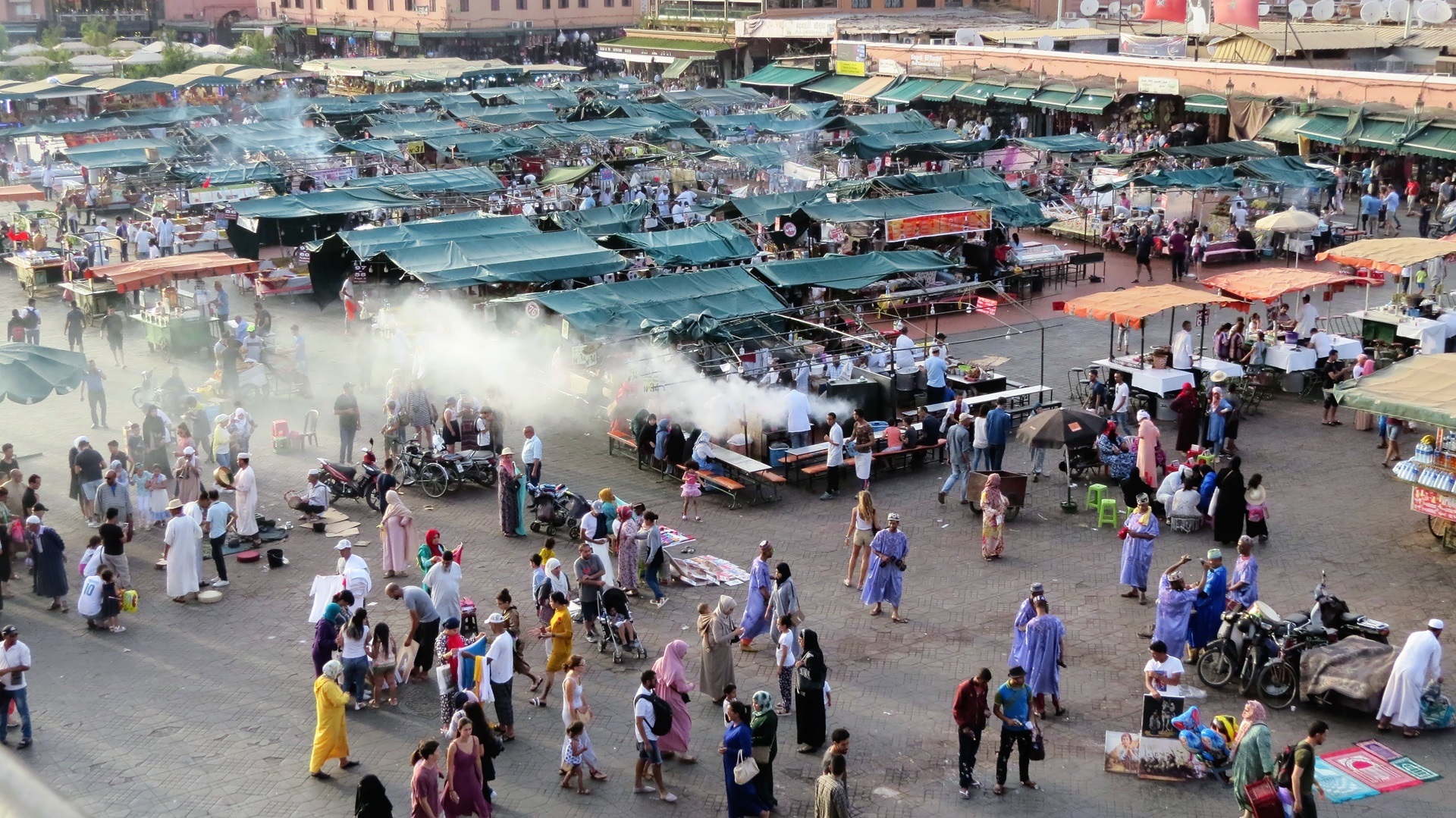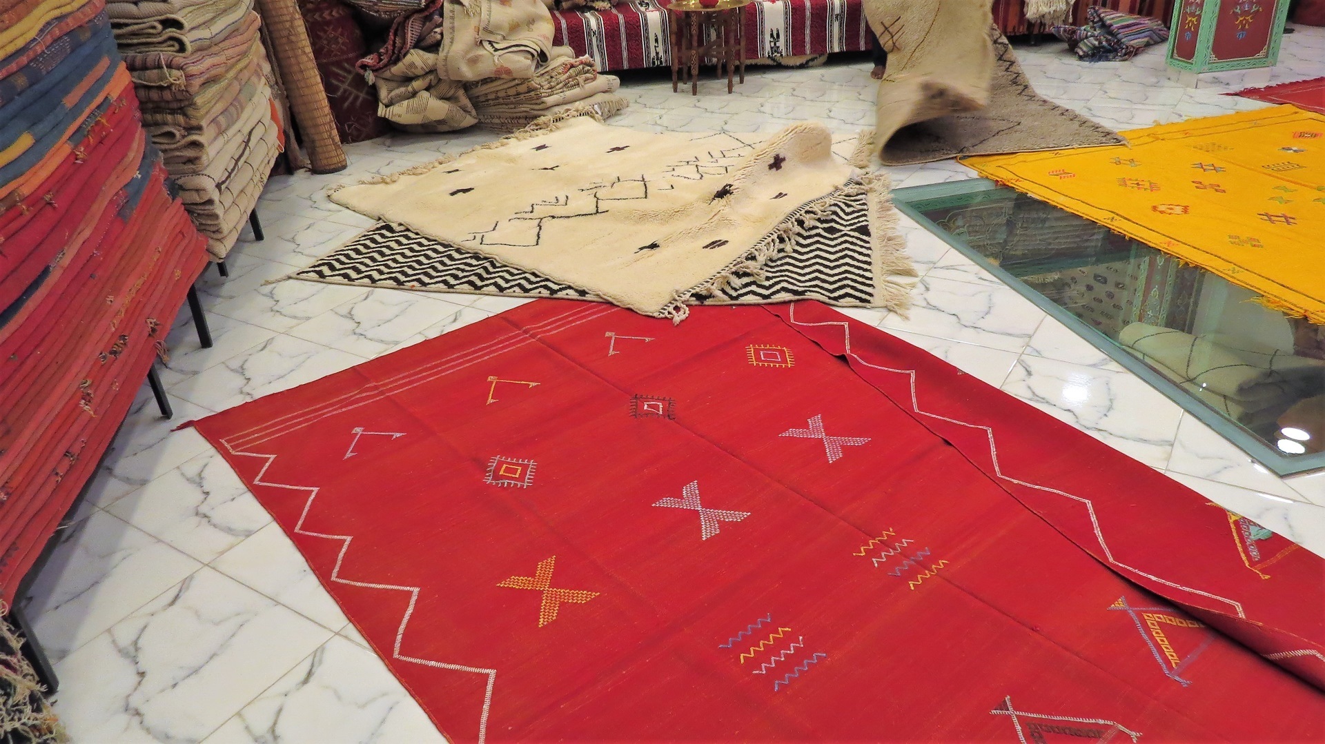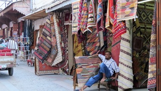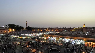 Der Tag begann mit einem Besuch beim Teppichhändler: Darlegung der verschiedenen marokkanischen Teppichmuster, Vorführung dutzender Teppiche, am Ende einen schönen kleinen dicken Berber-Wollteppich und eine große Sabra-(Kaktusseide)-Tagesdecke in Betracht gezogen. Preis wie aus 1001 Nacht: 27.200 DH! Mein Gegenangebot: 2.500 DH. Zunächst letzter Preis des Händlers: 22.000 DH, ca. 2.000 €. Völlig absurd. Spätere Preisvergleiche ergeben: Berberteppich in einem Festpreisladen 4.400 DH, bei Amazon 349 €, Sabra-Teppich etwa 300 €. Die Vorstellung, jeden Tag so einkaufen gehen zu müssen ... das würde uns völlig erschöpfen. Weiter zum Marokkanischen Museum: von Privatinvestor geretteter grandioser Palast mit seiner Privatsammlung. Schön in den Souks verlaufen. Ausruhen im Hotel. Zum frühen Abend auf den Djemma el Fna: Schlangenbeschwörer, Affen, Akrobaten und das Übliche: Händler, Händler, Händler. Wir konnten nicht beobachten, dass irgendetwas gekauft wird. Colatrinken auf Dachterrasse, hier kein richtiges Essensangebot, aber guter Platz zum Knipsen des Djemma. Später Restaurant-Dachterrasse mit Essen gefunden. U. a. "Salade du Chef" mit Mayonnaise. Schließlich Bier auf Dachterrasse.