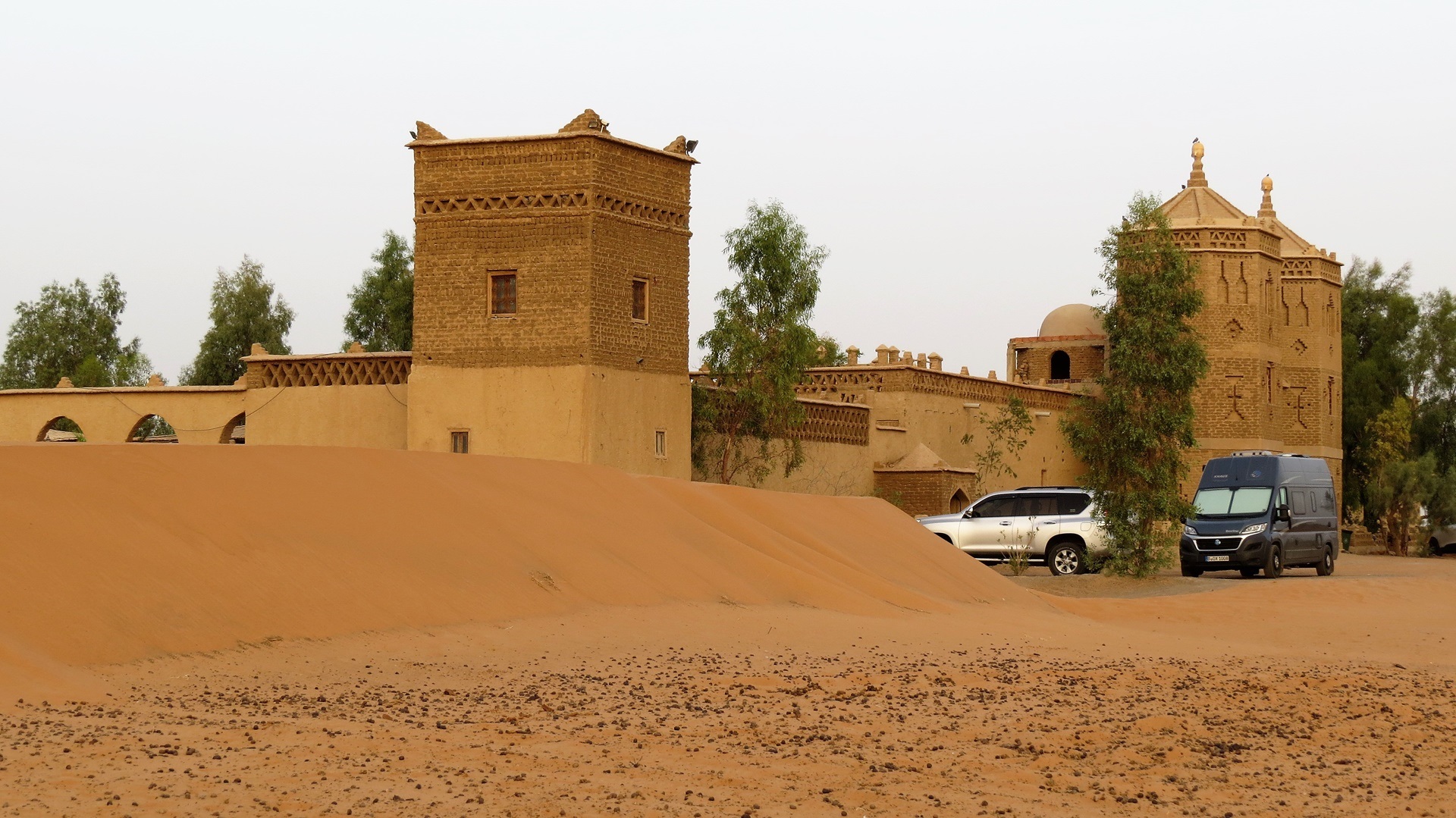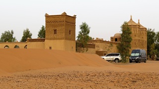 Fahrt entlang des Oasengebiets am Ziz. Bei Rissani auf den Circuit touristique durch die Ksar-Dörfer. Nördlich von Merzouga teils auf Piste das Hotel Auberge Café du Sud gesucht und gefunden. Schönes Zimmer mit Air condition (bei über 40 °C) direkt an den Sanddünen des Erg Chebbi. Gutes Abendbüffet, anschließend in den Pool.