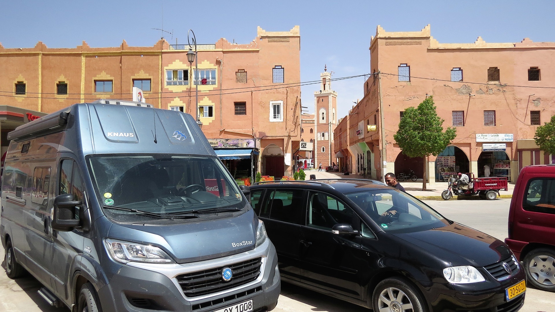 Zunächst ging es durch sehr öden Landstrich, dann auf der Straße der Kasbahs bis zum Abzweig in die Dadès-Schlucht. Atemberaubende und vielseitige Landschaft. Einmal die Strecke abgefahren und schließlich zurück zum Ende der engsten Stelle, zum Camping Berbère de la Montagne. Dort etwas nörgelig und übermüdet bei Rückwärtsfahren gegen einen Baum gebrettert: Beule in der Tür, Fensterscheibe zerbrochen. Dank Panzertape erstmal gerettet. Bei der Gelegenheit weitere kleinere Reparaturen: Schrauben am Hochbett, Trittstufe - seit Merzouga defekt - fixiert.