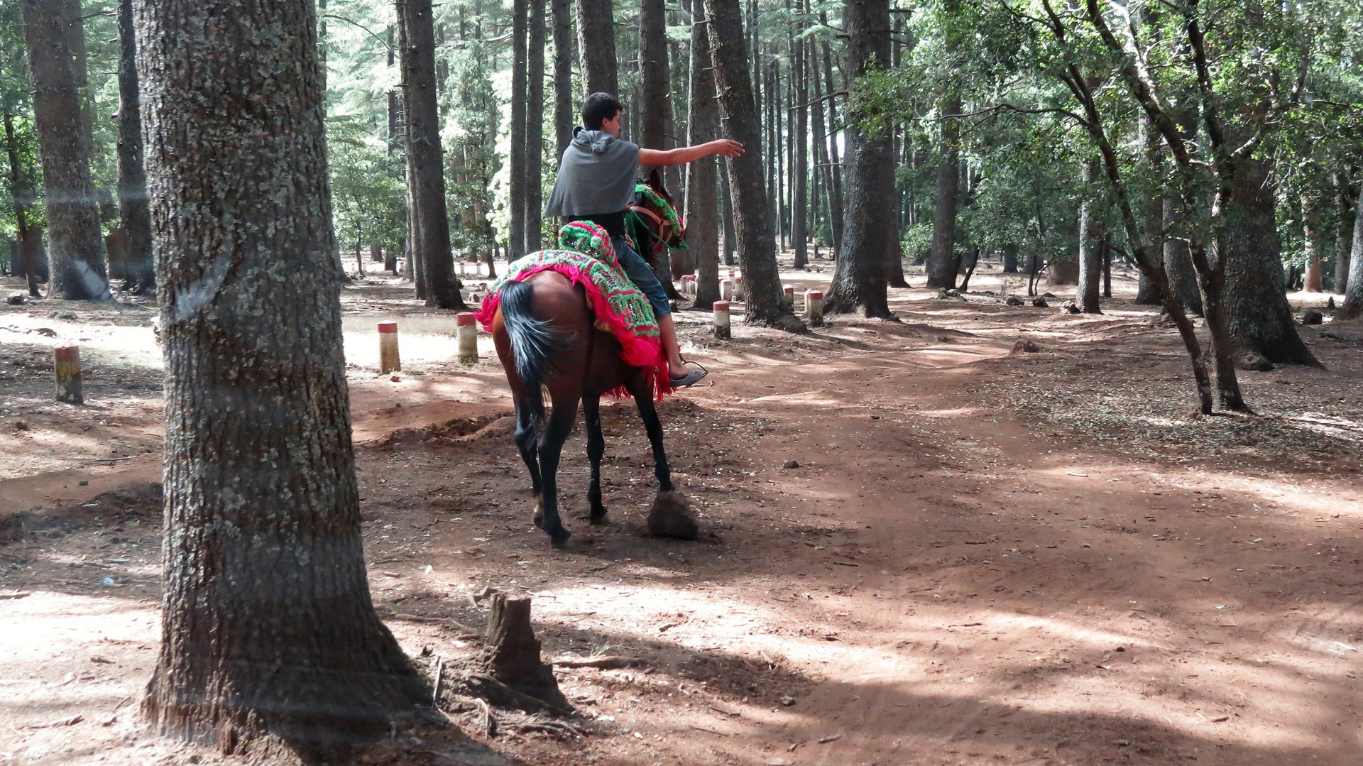 Erstmal Einkaufen/Tanken. Fahrt nach Sefrou. Einzige Touristen in der untouristischen Medina. Kurzer Rundgang. Selbsternannter, weitgehend zahnloser Guide etwas anstrengend. Weiter durch den Mittleren Atlas bis Ifrane, dem "Chamonix des Atlas". Crazy Alpenarchitektur, alles sehr edel und teuer. In den Zedernwald zum Picknick - ohne Berberaffen. Am Park Girauld quer durch den Wald, zum Teil geführt durch reitende Berber - mit Berberaffen. Später noch Parkplatz mit weiteren Berberaffen. Passstrecke durch Gerölllandschaft auf über 2.100 m durchs Ziz-Tal. Nach der Brücke der Legionäre Einfahrt in die Ziz-Schlucht. Schöner Stellplatz an der Kasbah Jurassique (mit Pool).