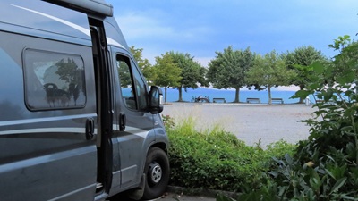 Auf Autobahnen durch Österreich und die Schweiz bis zum Parkplatz an der Piazza Vittoria. Schweizer Franken für Brötchen verbraucht.