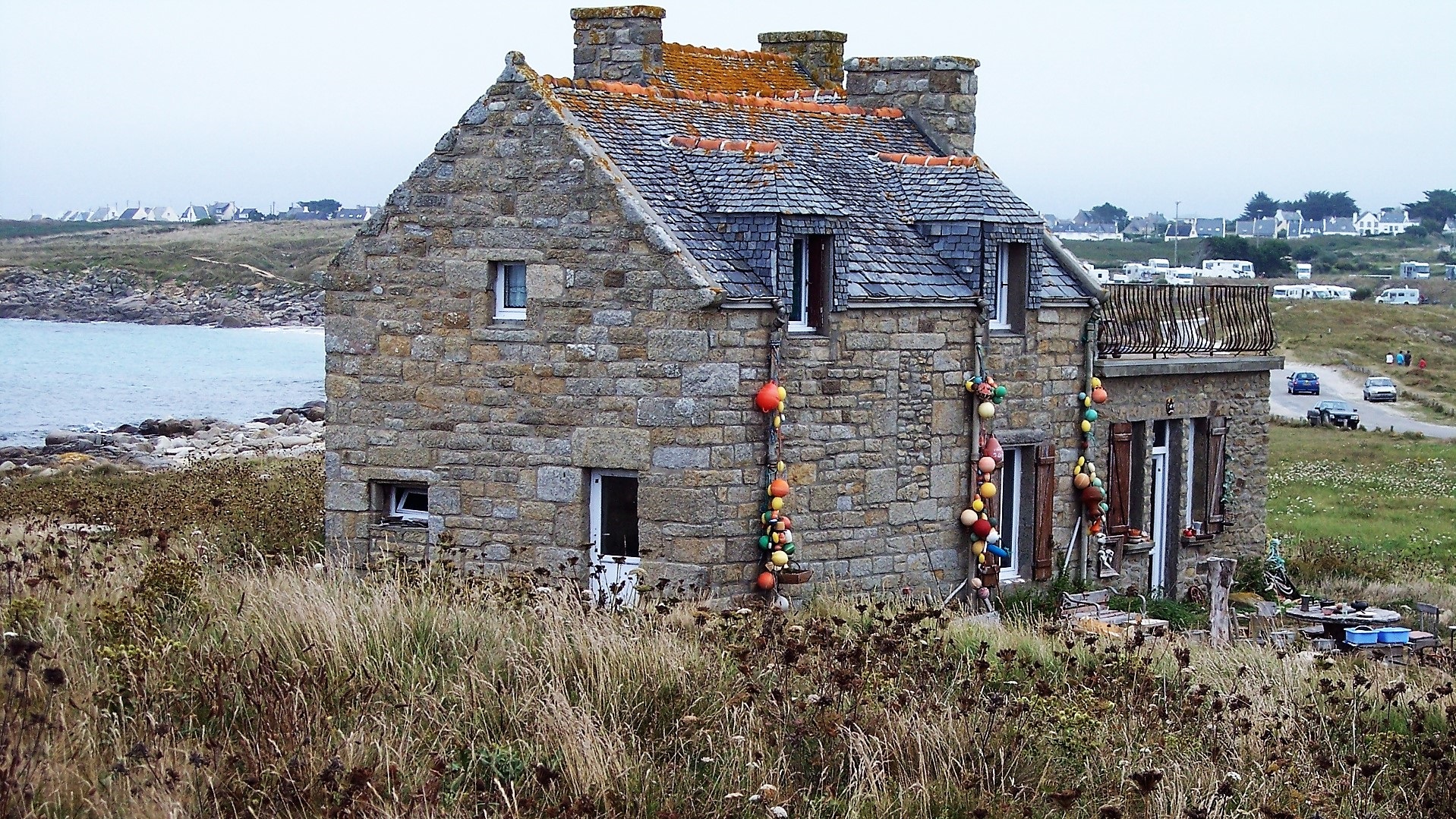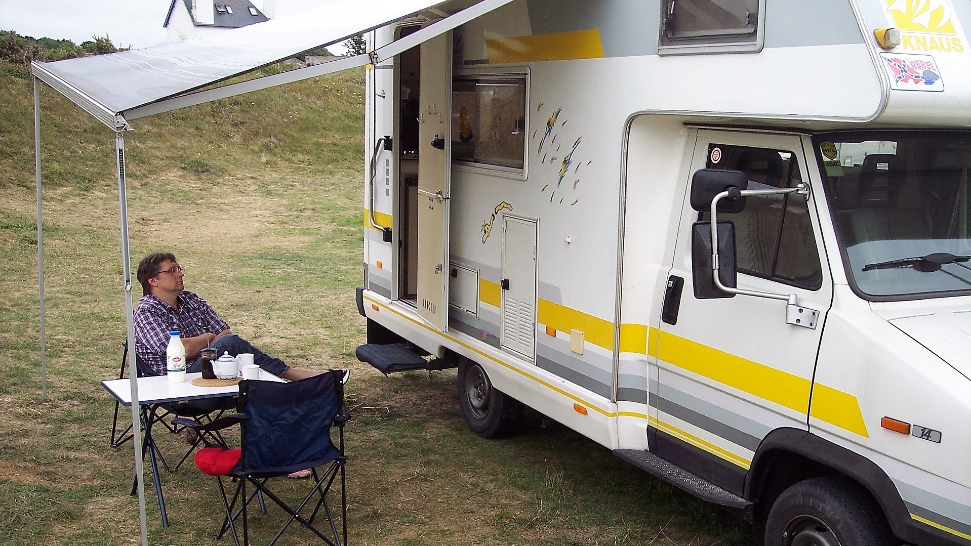 Regen, also weiter zur Bretagne-Südküste. Ambon: erstes Mal Campingplatz (halber Stellplatz!), Apéritif mit französischer Familie (zweite Hälfte des Stellplatzes), schweres Radebrechen. M: Schwimmbad und Pilates. Weiter Regen.