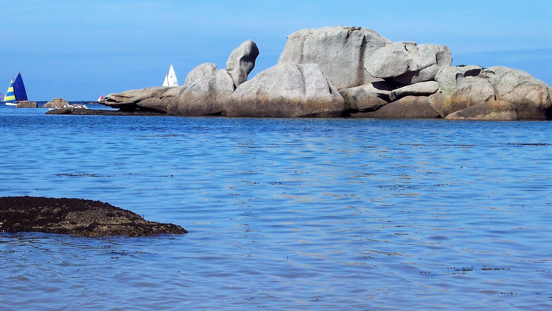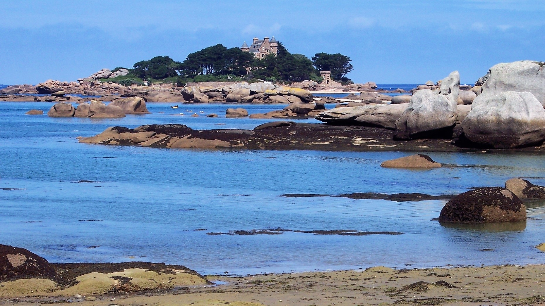 Trégastel: alte rosa Granitsteine vom Panorama-Punkt aus angesehen und Strandspaziergang (weiß und rosa). Küstenfahrt über Porte du Bihit und weiter auf N12 an den Atlantik: raue Küstenlandschaft. Klasse Stellplatz mit 200 m zum Strand und Privatsphäre.
