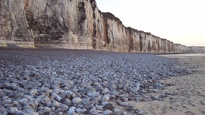 Wieder Regen, also zurück zur Nordküste mit Planziel Brügge. Zweiter großer Hypermarkt-Einkauf. Jetzt ca. 10 Sorten Käse. Herrlicher Stellplatz an der Steilküste (56 m) der Normandie. Fahrt mit Seine-Fähre. Abends Promenaden-Spaziergang.