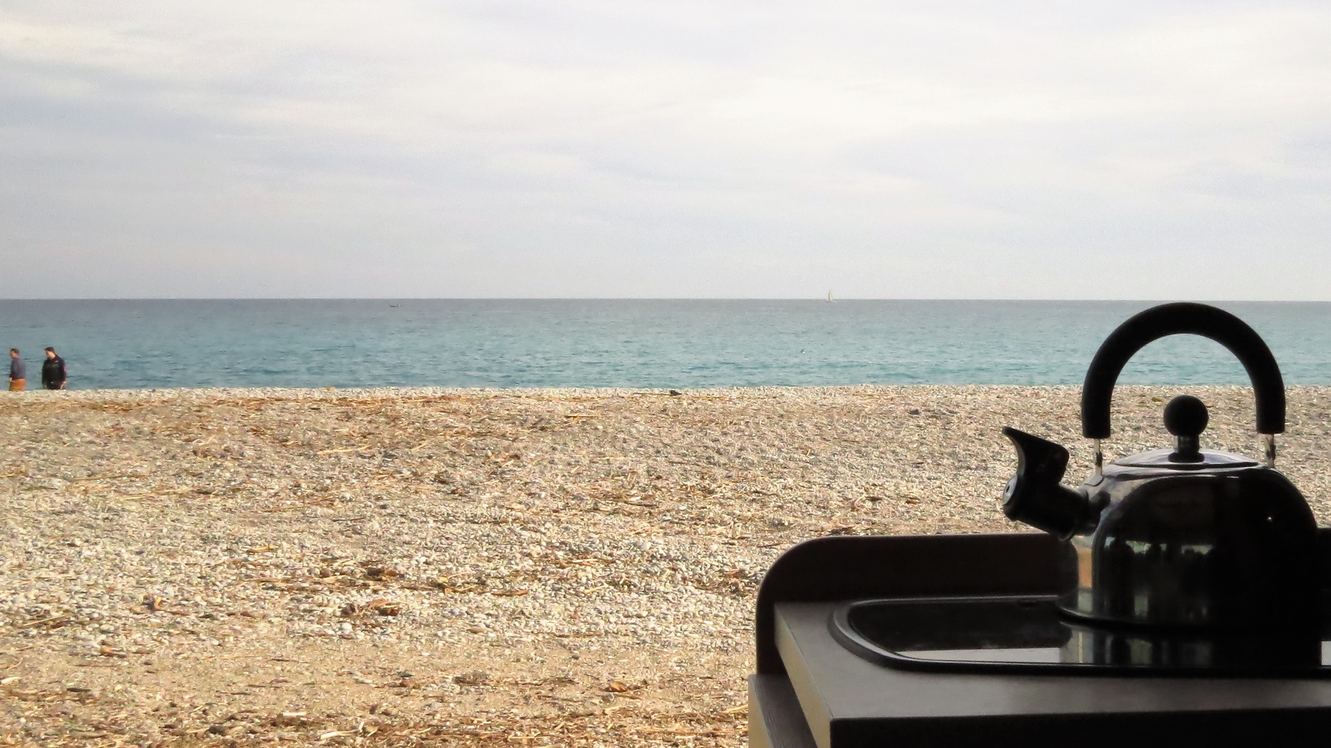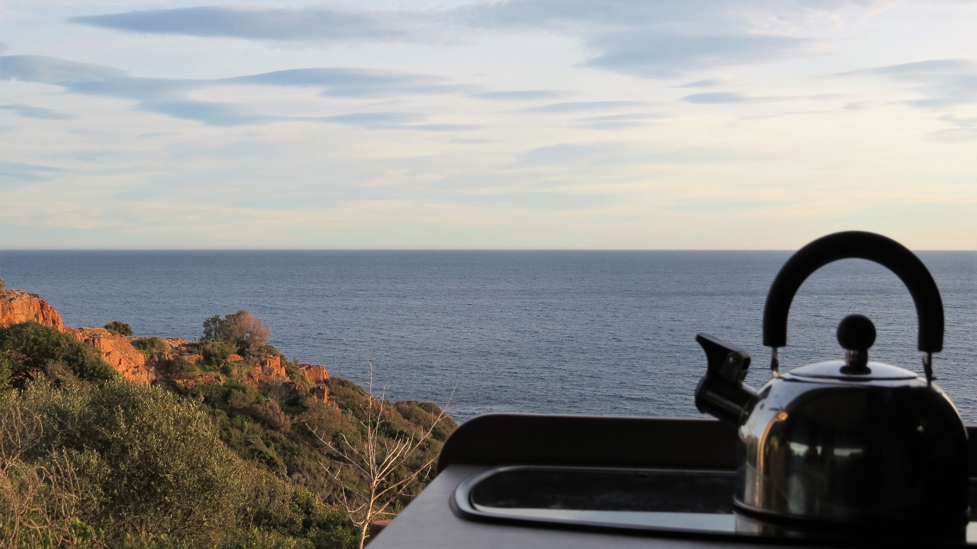Herrliches Wetter bei 20 °C! Nizza sollte seine zweite Chance bekommen - vertan! Es ist uns wieder nicht gelungen, einen Parkplatz zu finden. Durchaus genervt, Nizza den Rücken gekehrt. Pause am Strand in Antibes am naturbelassenen Kiesstrand mit Blick auf die schneebedeckten Seealpen. Hinter Cannes traumhafte Route durch das Massif de l'Esterel mit seinen roten Porphyrfelsen bis kurz vor Saint-Raphaël auf einen Parkplatz mit grandioser Sicht auf Meer und Felsen.
