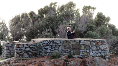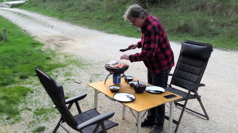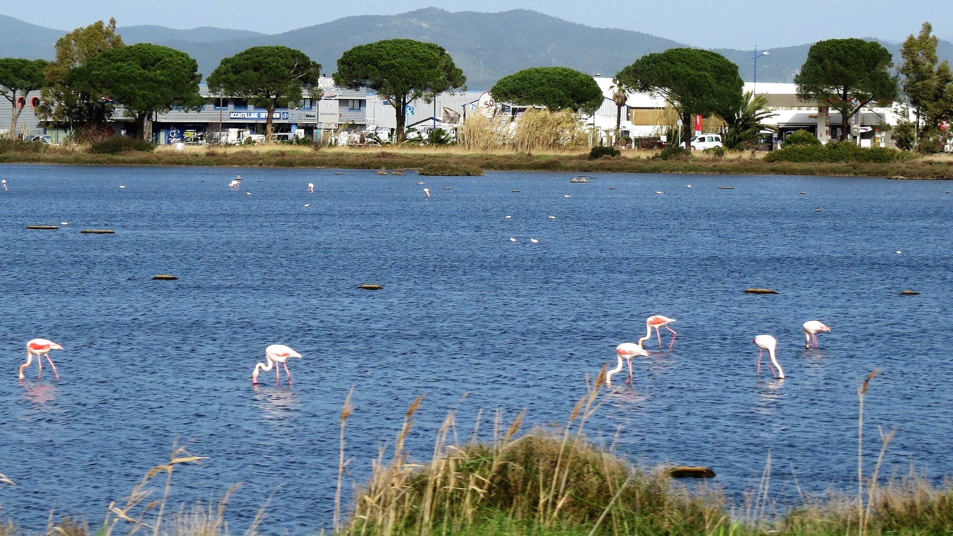 Morgens: A besichtigt das verfallene Fort am Cap Roux. Fahrt durch das rotfelsige Massif de l'Esterel. Saint Tropez liegen gelassen, bei Hyères auf die Halbinsel. Haben unsere ersten Flamingos gesehen. Schöne Pause am Strand, am Hafen von Six-Fours-les-Plages Sturmwarnung, der Hafenmeister riet vom Übernachten ab, sonst schöne Stelle. Im Hinterland in Cuges-les-Pins den vom Womo-Reiseführer empfohlenen Stellplatz aufgesucht. Idyllisch in steiler Schlucht gelegen. In der Sonne bei 20 °C gelegen und gegrillt.