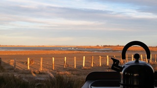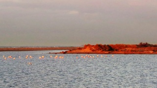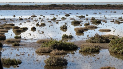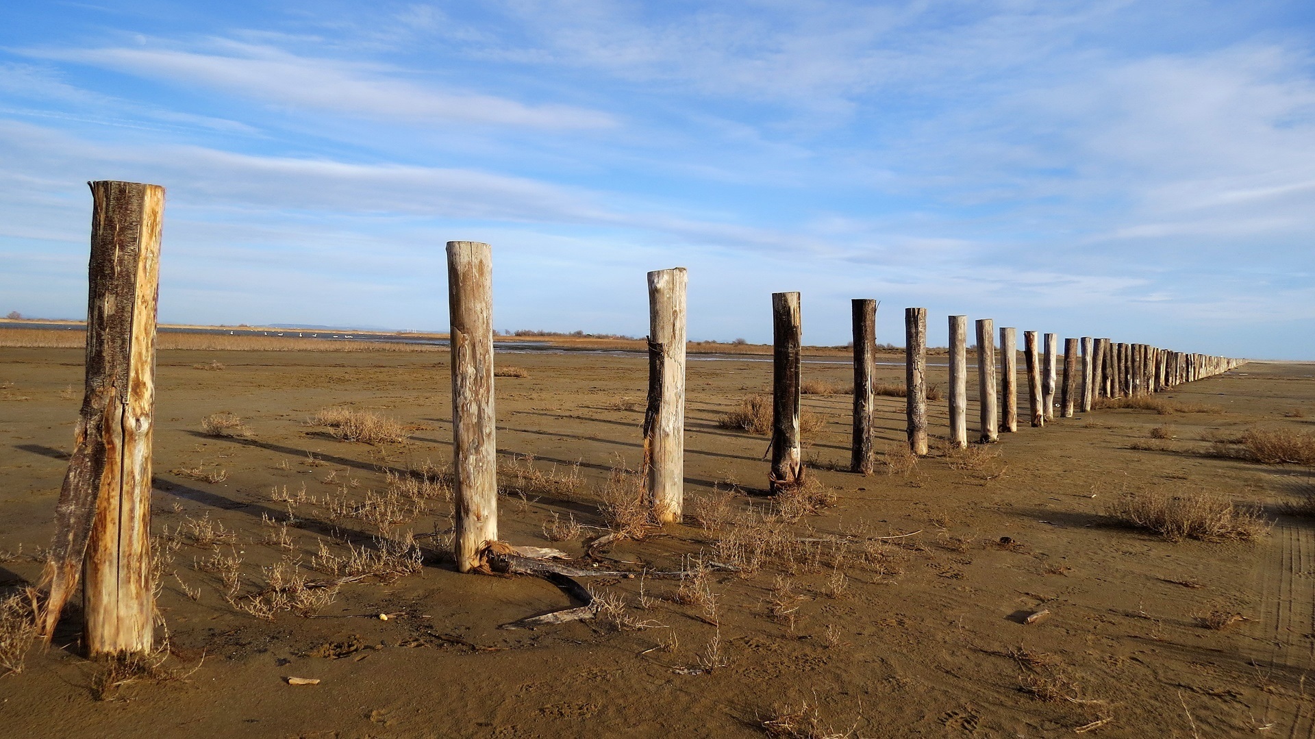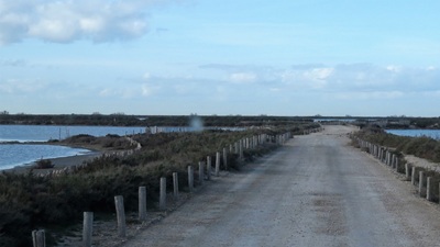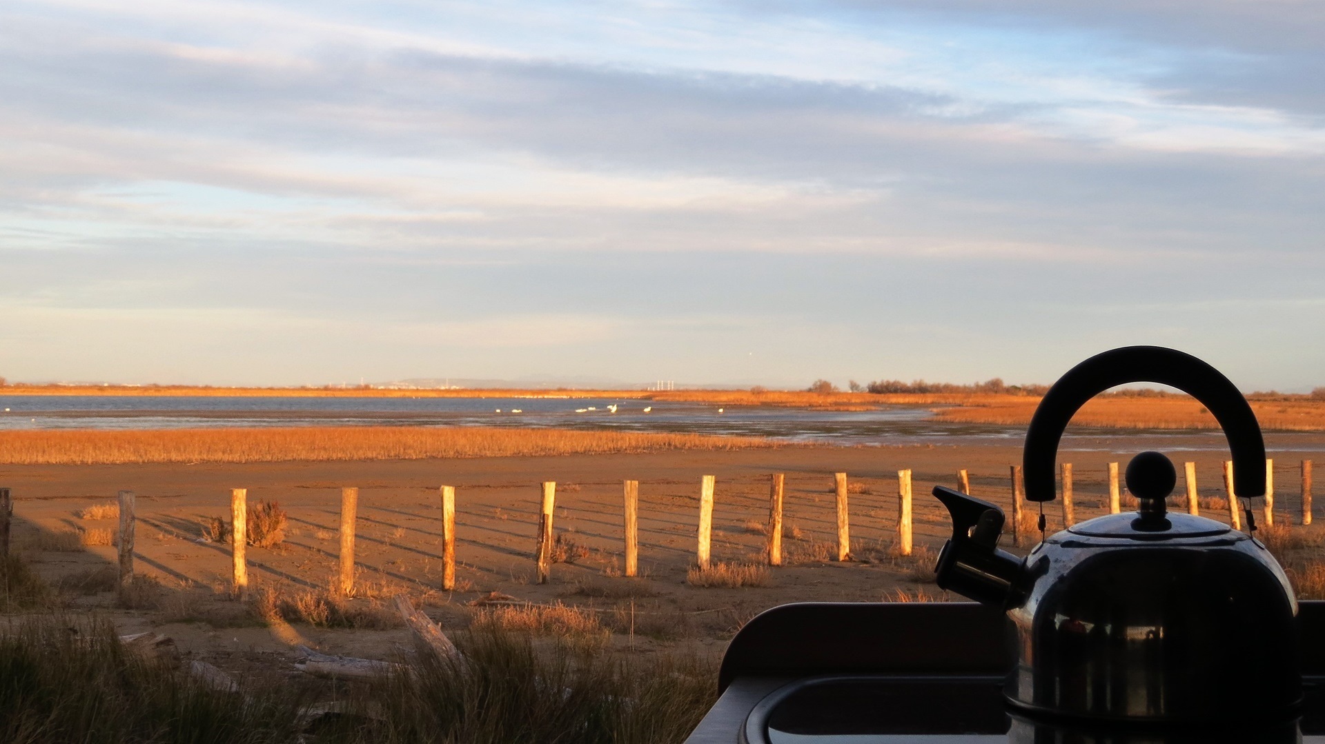 Von Aix an die Côte Bleu östlich von Marseille. Vorbei an kleinen Ferienorten zum Étang de Berre über Fos-de-Mers Industrieanlagen bis Port-St-Louis-de-Rhône zu einem wenig ansprechenden Stellplatz, Weiterfahrt deshalb mit der Fähre über die Rhône nach Salin-de-Giraud: Netter Ort, viele Platanenalleen, die jetzt blattlos bizarr aussehen. Noch 12 km an die äußerste Spitze der Camargue vorbei an Salinenbecken und Salzbergen zum Plage de Piemanson. Wunderbarer Parkplatz mit Blicken in den Sonnenuntergang über dem Bassin, den Étang und das Meer, Flamingos inklusive.
