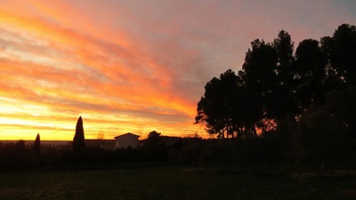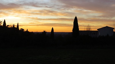 Rechtzeitig zum Sonnenaufgang über dem Étang wach gewesen. Rundfahrt durch die Camargue: Auf schmalsten Straßen quer durch die Lagunen, da wo es eben erlaubt ist. Großer Schwarm Graureiher, viele, auch fliegende Flamingos, weiße Camargue-Pferde und aus dem Augenwinkel konnte M auch zwei schwarze Stiere ausmachen. Am großen Êtang de Vaccarès vorbei, dann nach Norden zu den Alpilles abgebogen. Päuschen an der trutzigen Abtei Montmajor. Kleine Dörfchen, nette Berge, schöne Ausblicke. Zurück an der Rhône begann die Heimfahrt. Lyon östlich großräumig umfahren bis zum Rastplatz.